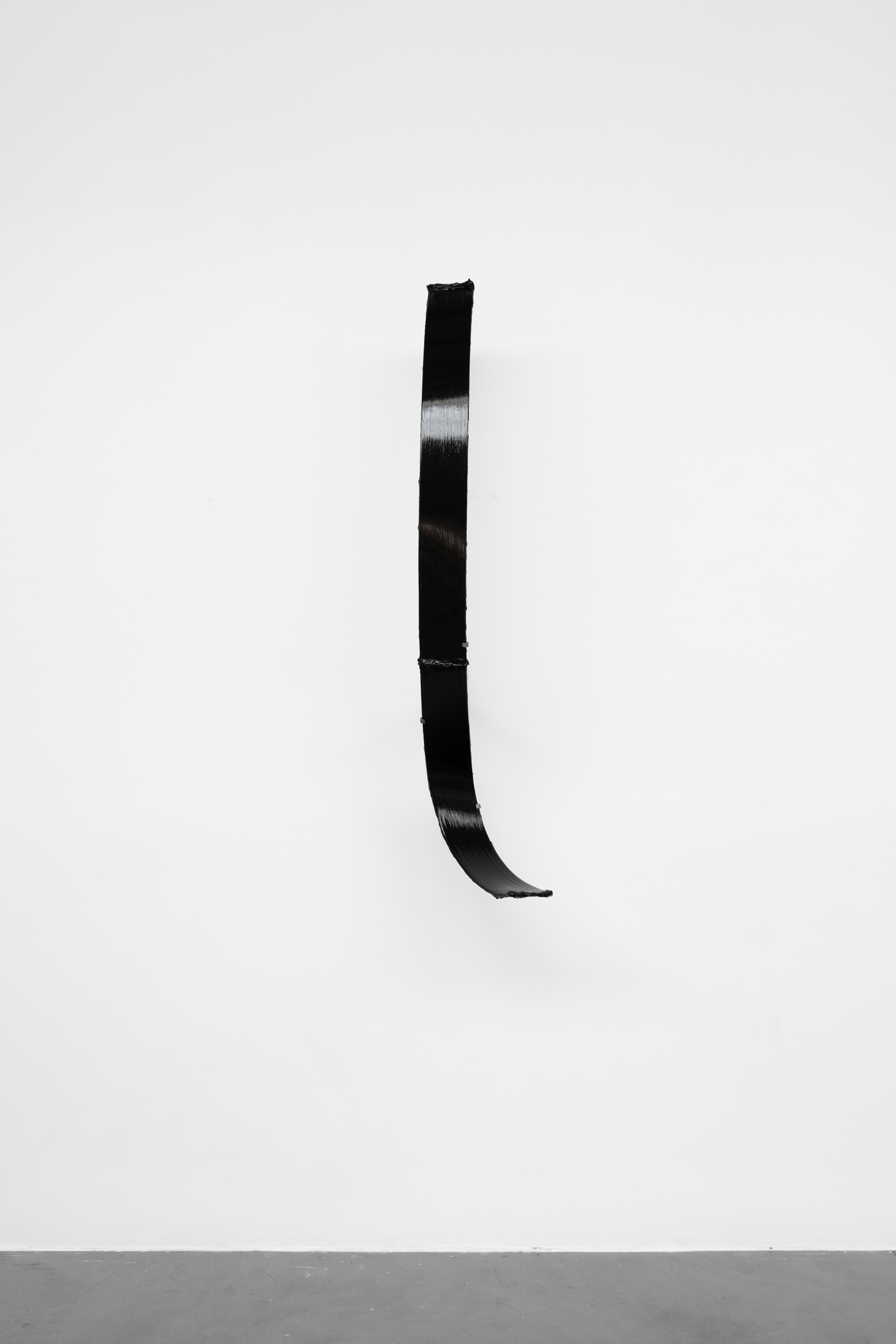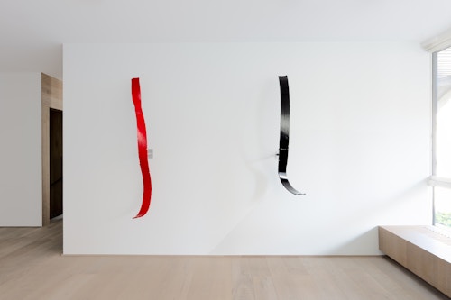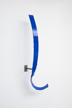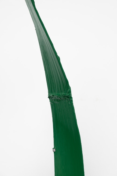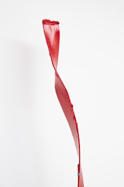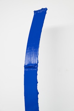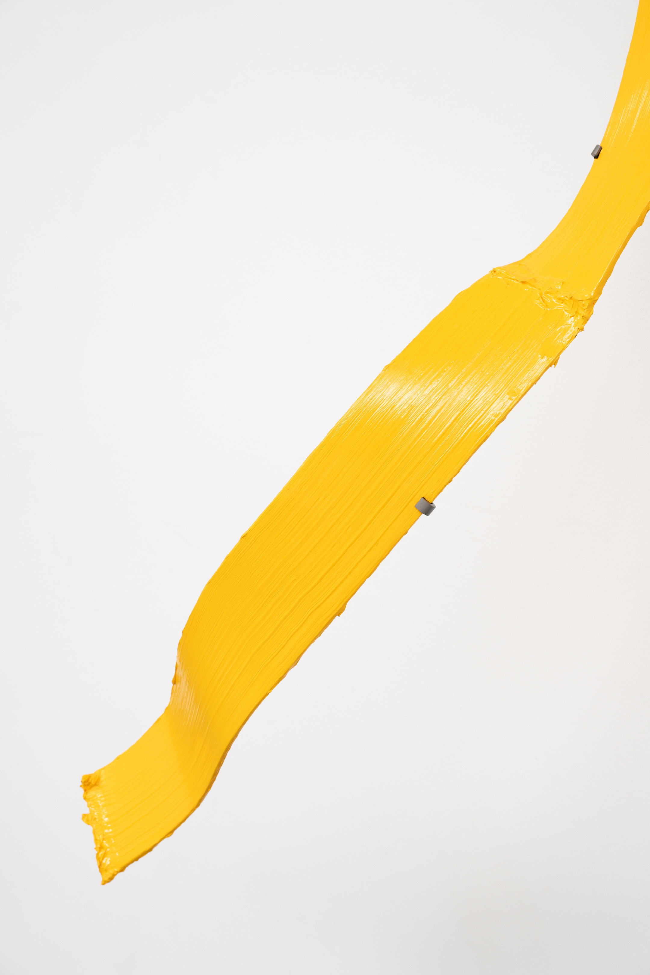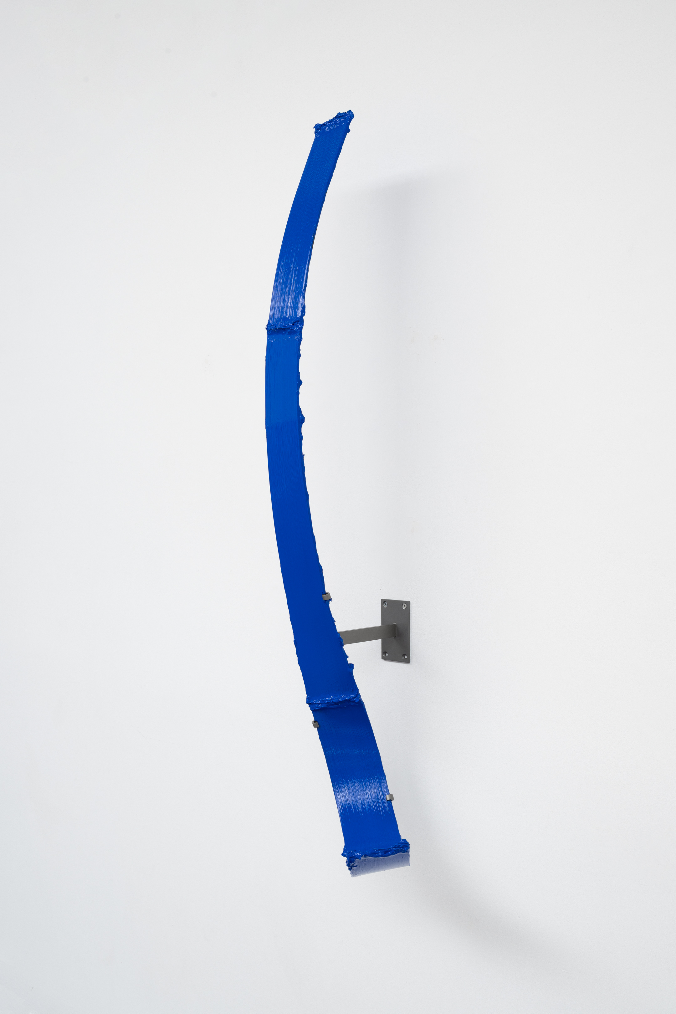 Shown in the same gallery, Brushstrokes forms the exhibition’s second new body of work. Fabricated from painted steel, these literal brushstrokes translate gesture into three-dimensional form, occupying a similarly ambiguous territory between painting and sculpture. Unlike the Inclusions, which rest on plinths and invite the viewer to move around them, the Brushstrokes are wall-mounted, like paintings — yet they do not lie flat. In contrast to figures such as Roy Lichtenstein, who depicted brushstrokes, Lavier gives them physical presence. The difference signals a broader divergence between American Pop Art’s interest in representation and the European tradition of New Realists’ commitment to presenting reality itself.