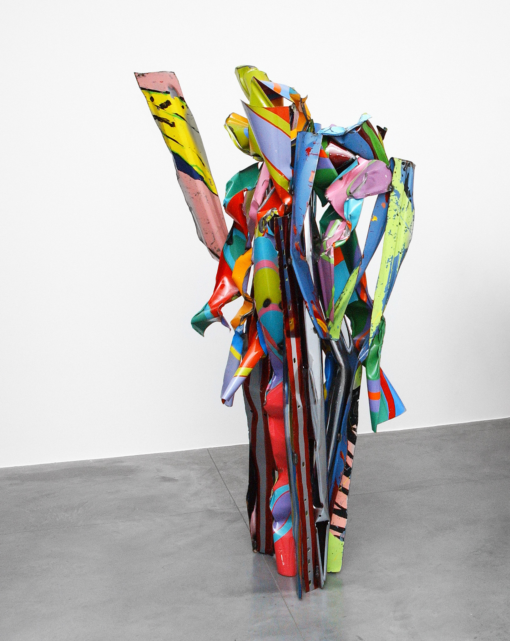 The size and the shape of the pre-cast and modelled constituents prompt, to some degree, the shape, scale, configuration, and content of each of Chamberlain’s volumes – the extent of their denting; Whether rolled into wobbly cylinders or whether flatter, concave and/or convex oblong and wing-like shapes… Chamberlain has never wanted his art to be restrained by a preset goal or the enactment of a specified task. While his procedures are clear, they are excessive and impure. Like hybridized roses, whose petals have been vastly multiplied from the “natural” rose’s five petals, Chamberlain’s art seeks to embody beauty – with and without thorns.