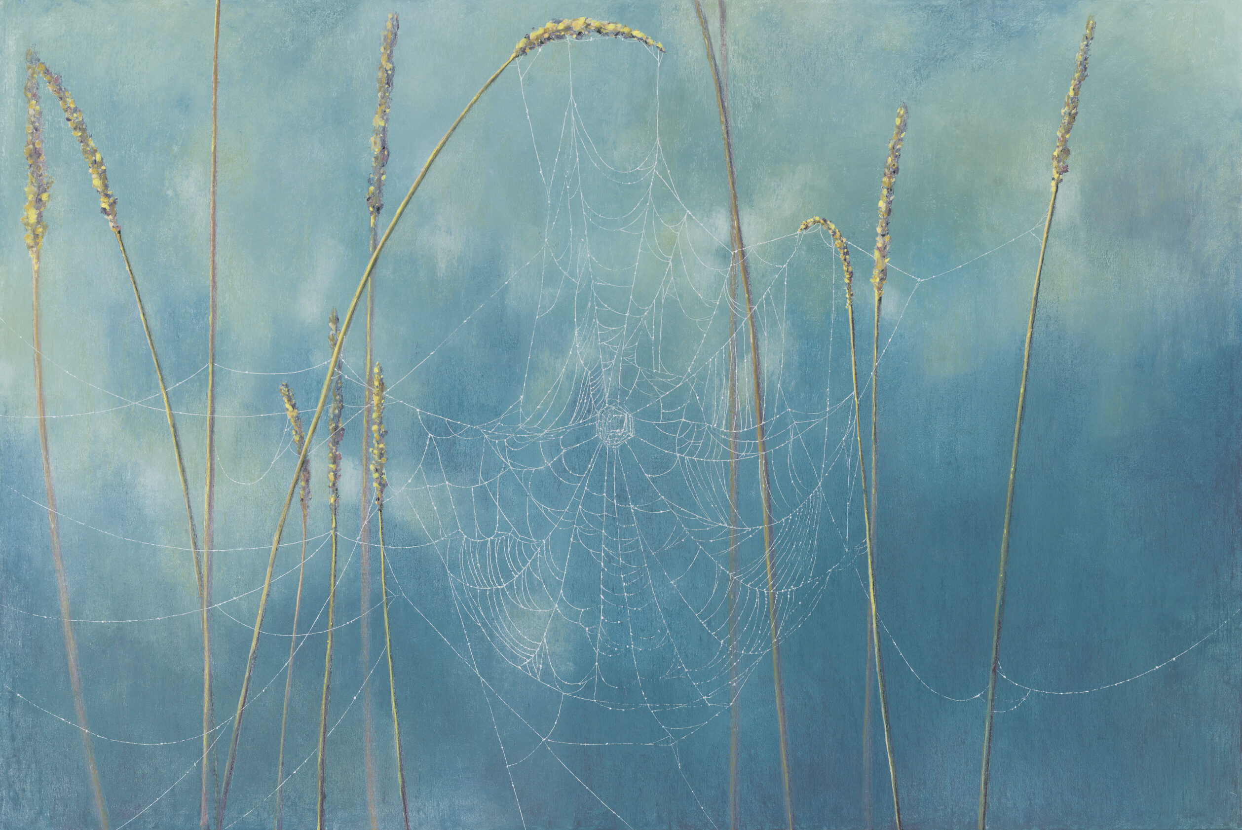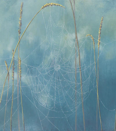 On the upper floor, a series centred on spider webs marks a further development. Depicted at daybreak, when dew renders its architecture visible, the web is shown at a precise moment of transition—just before it is disturbed or destroyed. As a structure produced through sustained labour, it exists only temporarily before being undone and rebuilt. This cyclical process reflects a broader concern with temporality and ephemerality. The spider web also functions as a metaphor for the artist’s practice, particularly in relation to pastel—a medium that is inherently fragile. These works thus foreground their own conditions of making, emphasising labour, duration and delicacy. The web can be understood as a form of inscription, recording a presence already in the process of disappearing.