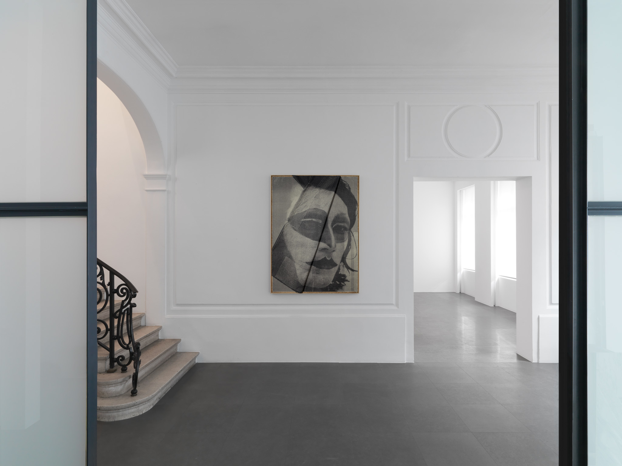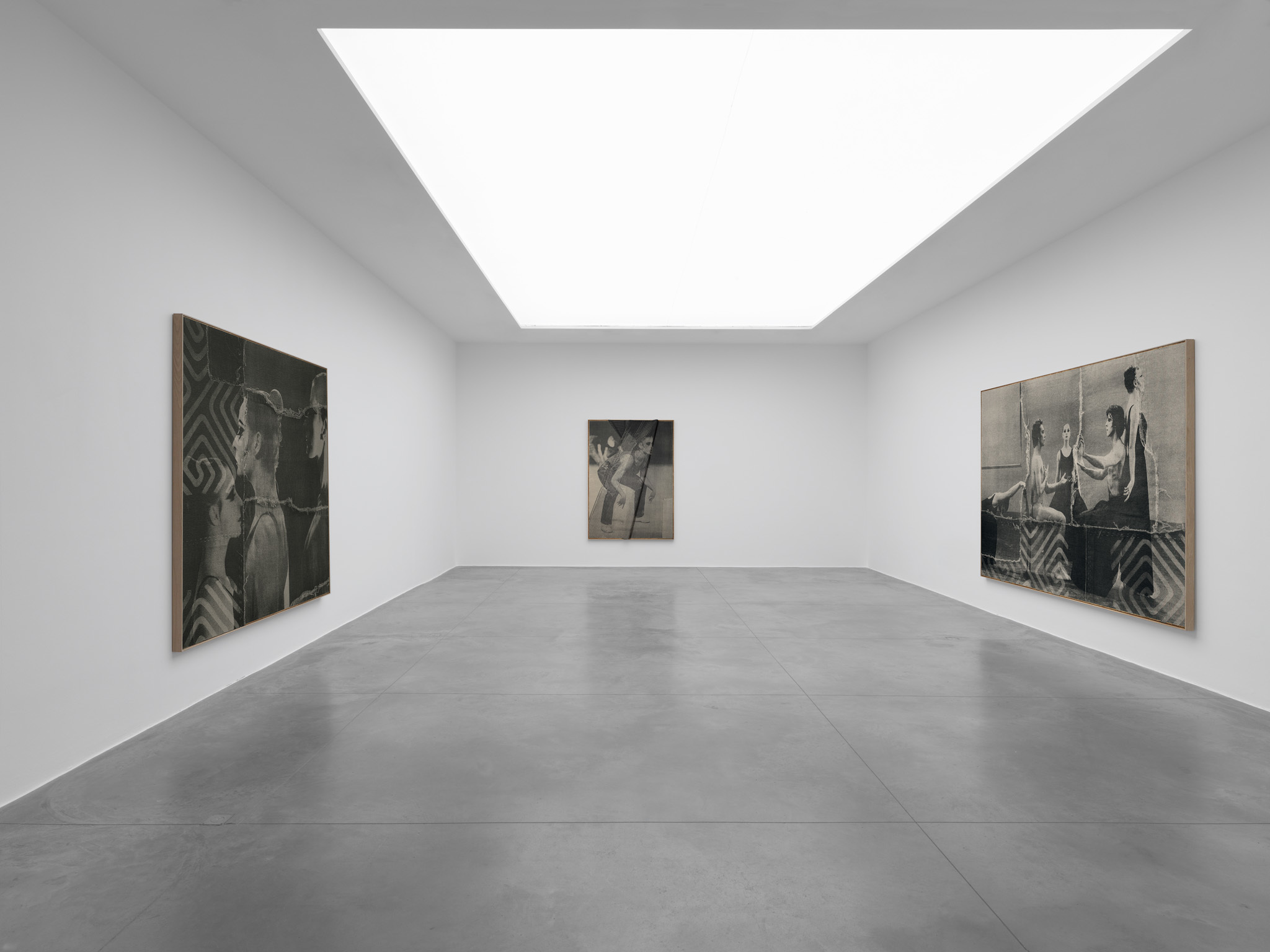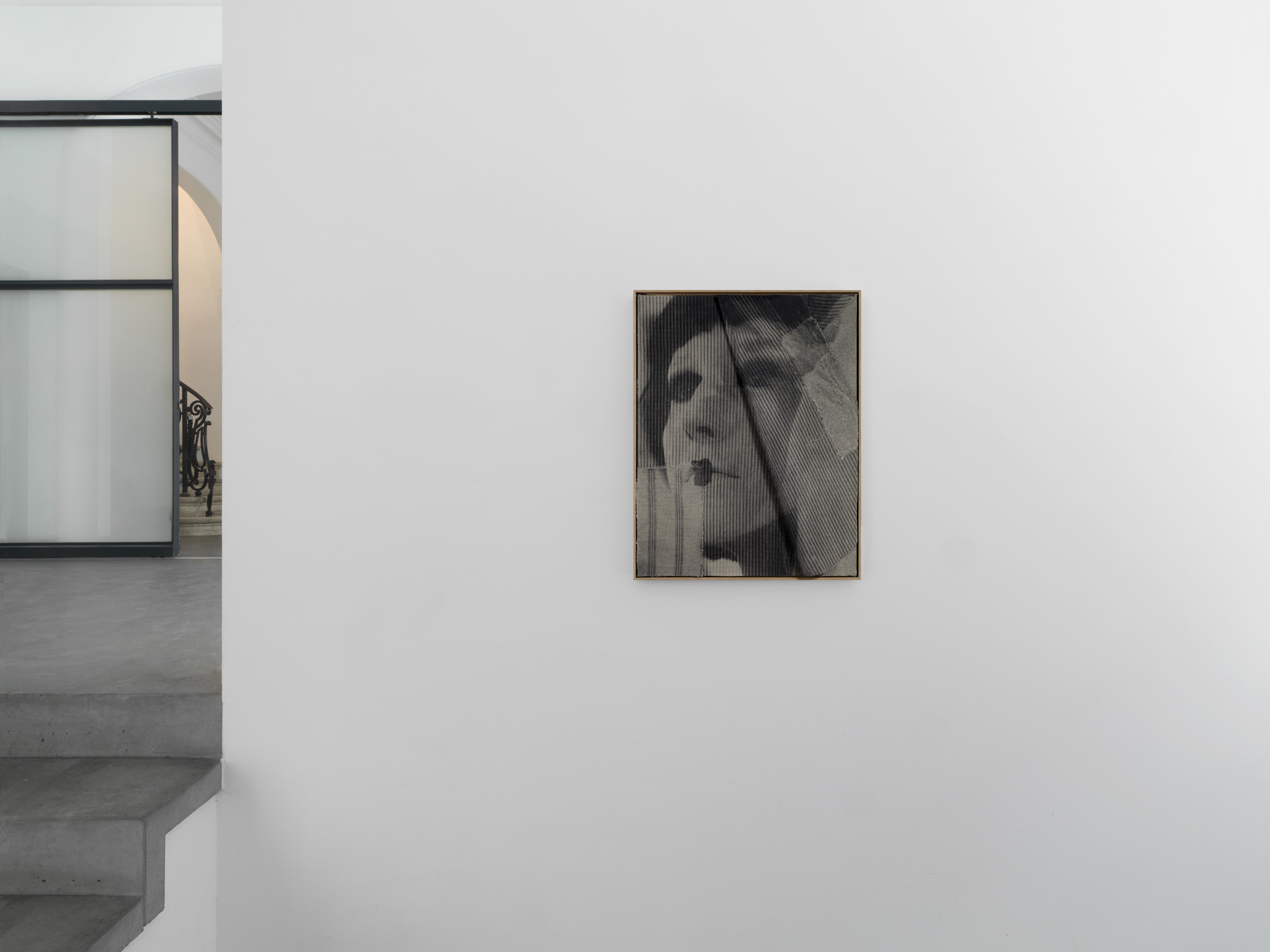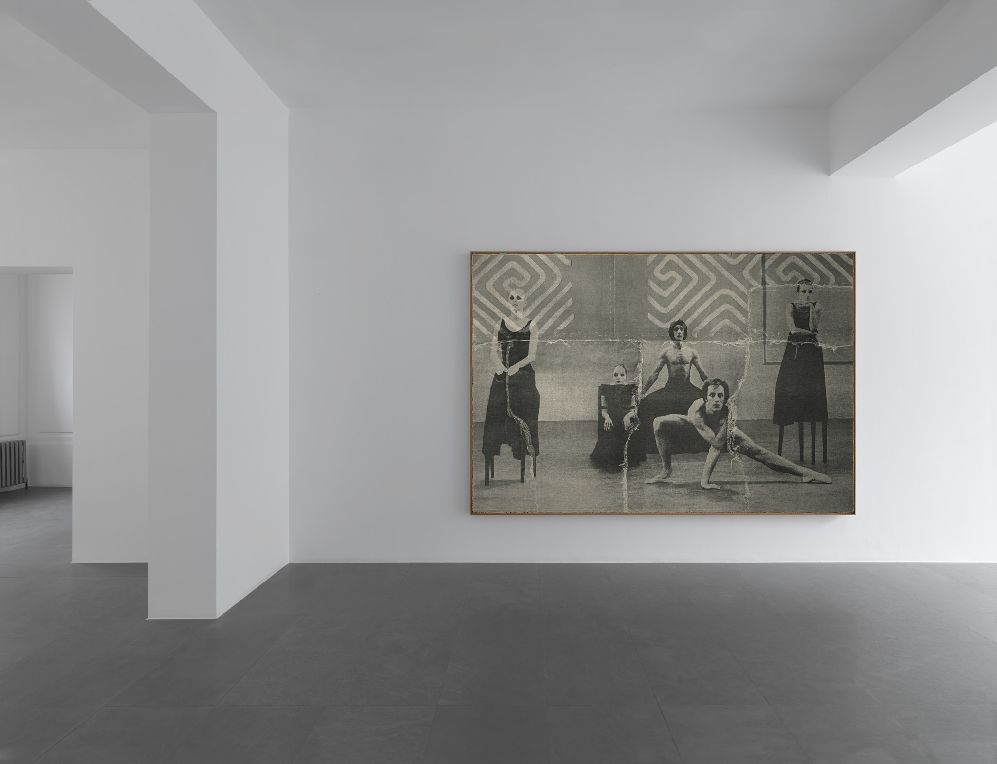 Although it is monochrome the work of David Noonan makes a dramatic impression. The characters seem to be involved in a show or performance. As a counter part to the photos he uses geometrical patterns which remind of modernist paintings, and are inspired by Japanese boro textile. He also plays with the texture of the canvases. The various layers that compose them are the result of a manual method of cutting and gluing. The pieces of fabric that are affixed together and the patterns they create give the work a unique, physical feature.