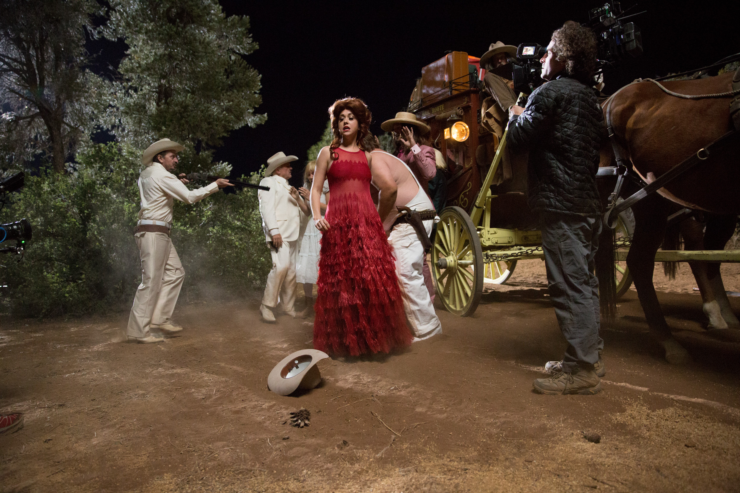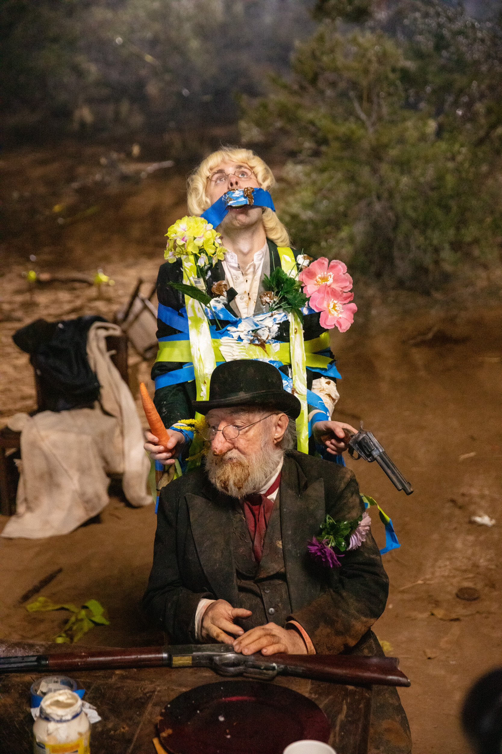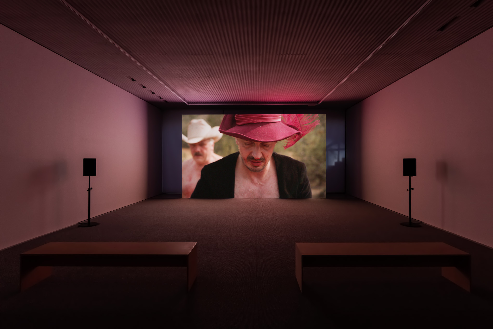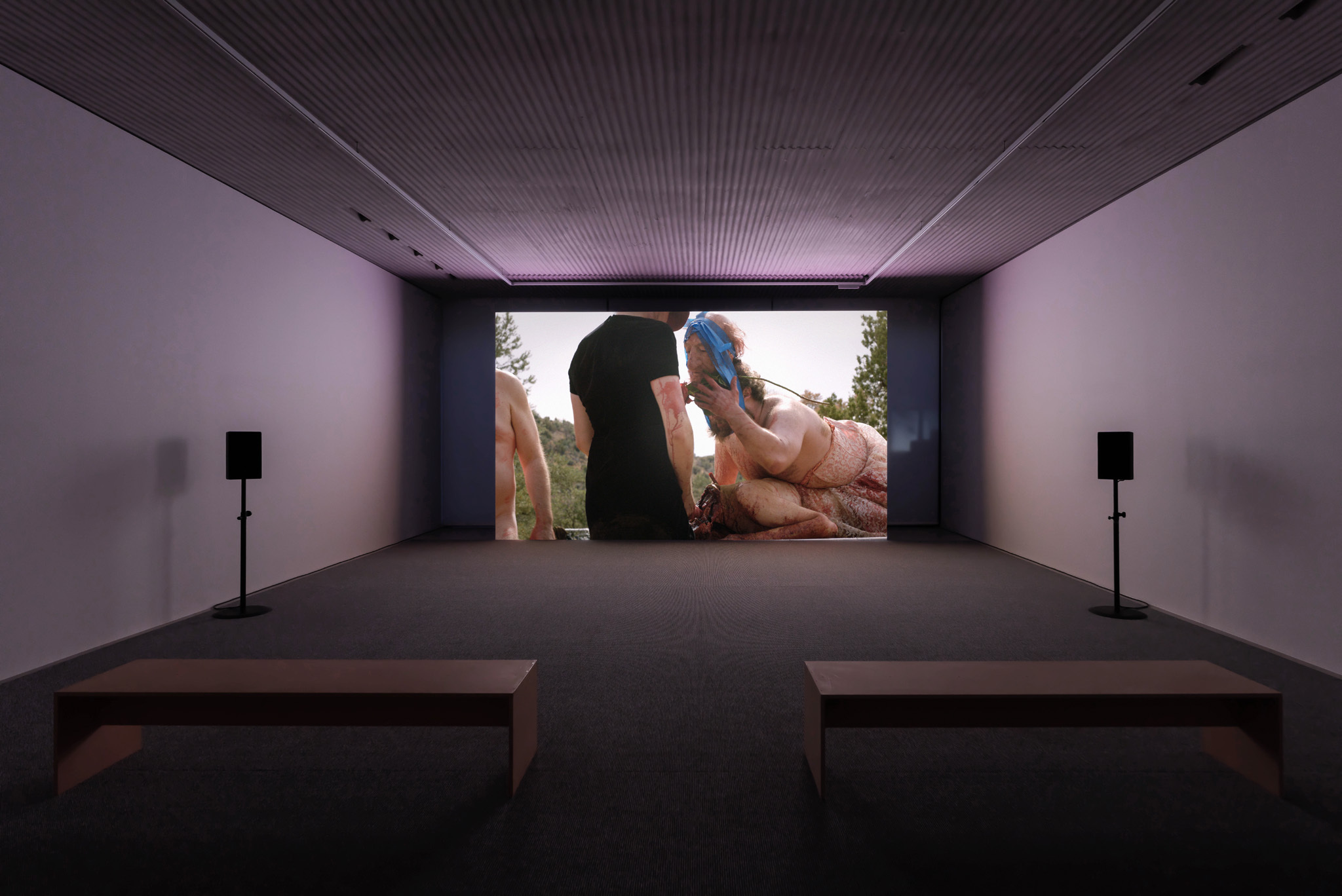 Paul McCarthy’s latest film instalment, CSSC The Dogs The Attack (2023), made in conjunction with his son Damon, revisits a disparate group of passengers as they travel through the American Midwest in a stagecoach. They are familiar, in shifting guises, from the previous films. Edited from the footage of these productions, CSSC The Dogs The Attack chronicles the group’s encounter with a gang of Bonanza-like cowboys in pristine white outfits, referred to as ‘the dogs’. Four is a significant Biblical number: are these the Four Horsemen of the Apocalypse or four depraved Evangelists? Regardless, they go berserk and launch a devastating attack on the passengers, one of whom is a character named Ronald Raygun, in turn modelled on the banker J. P. Morgan (1837-1913), played by McCarthy himself. Central to McCarthy’s stagecoach films is a pointed focus on escalating violence: from malevolent bullying to fierce but organised brutality and, finally, a no-holds-barred descent into anarchic annihilation. And as per the prior instalments, CSSC The Dogs The Attack also treads a fine line between authenticity and artifice: the fake silicone bodies are as lifelike on screen as the flashlights and plastic buckets are anachronistic. As an ensemble, the films can be read as parables of violence, whether in the historical or contemporary socio-political realm, or as tropes through which to consider the origins of barbarity and all its ramifications.