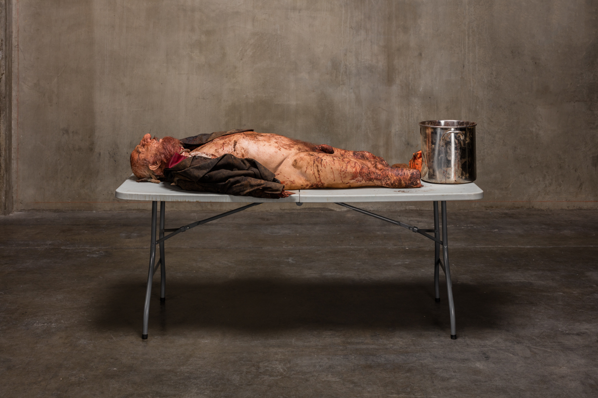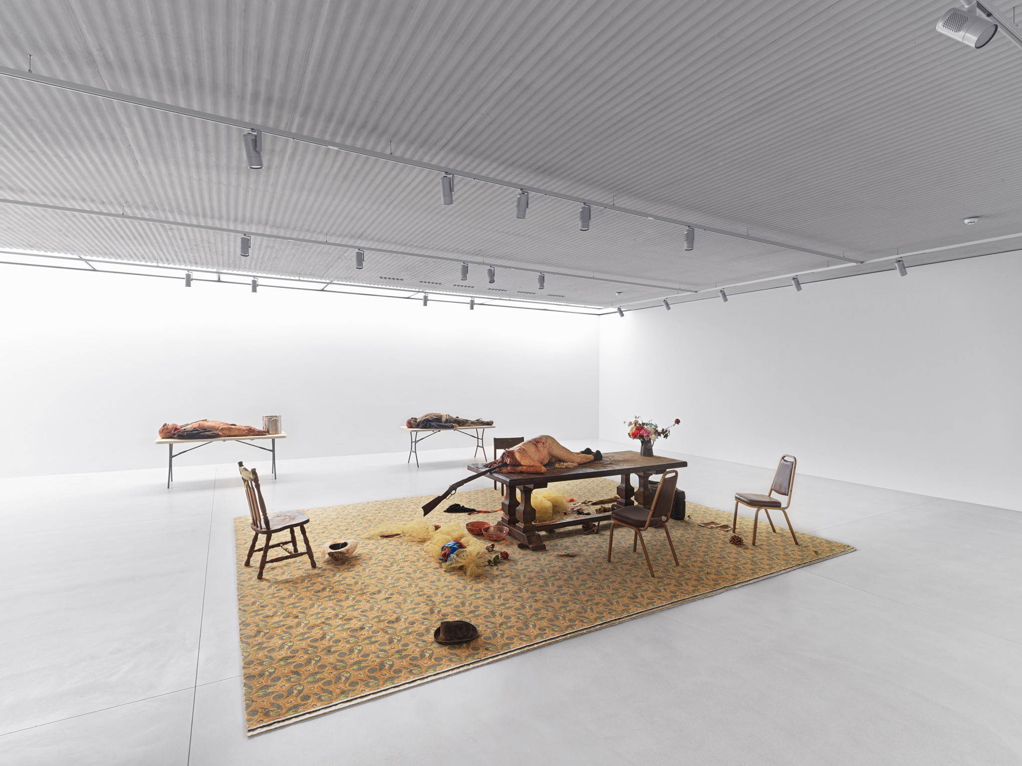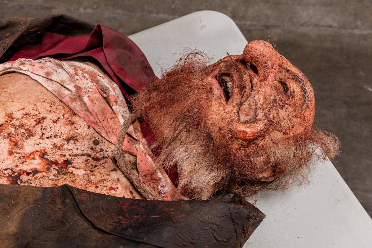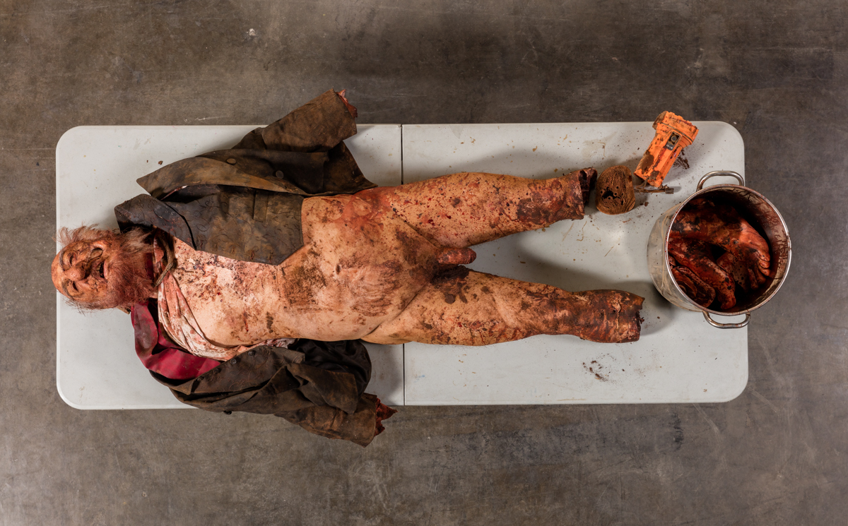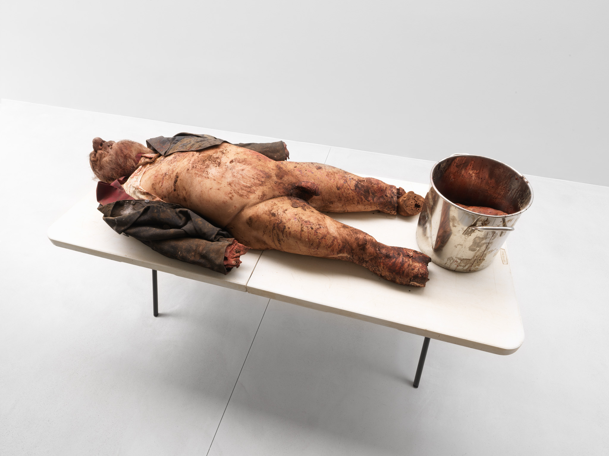 Three sculptures of McCarthy’s Ronald / J. P. Morgan character, which belong to the film, are exhibited in all their meticulously rendered detail. From an exhumed but intact, fully-clothed body to a semi-naked and half-butchered figure, the triptych concludes with a desecrated corpse that is mainly identifiable from the head on the floor. Seen in isolation from the film, the CSSC Banker sculptures raise more questions than they answer: what has led to this violence? What happened and why? The answers, of a sort, can be found on screen. As ‘relics’ of the cinematic process, so to speak, they also highlight the gap between image and reality. McCarthy presents the works twice: once in the film, during which they are passed off as ‘real’, but also in the gallery, which allows us to view them up-close, for longer, and in all their lifelike ‘unreality’. The intangible (cinematic image) and tangible (sculptures) coexist in the same space. Moreover, in every key respect, they are exact replicas of the artist, created from casts of his own body. Is this the death of a character, and everything he represents, or the death of the artist/director? This dichotomy is particularly resonant in CSSC Banker, Ronald, Table, and Flowers (2016), which is shown in an identical arrangement to the film. Three figures, instead of one, imply that the Ronald / J. P. Morgan character has died multiple times and invariably returned to life, both as a nod to the surreal nature of the film and the mantra that Hollywood stars never die: they can perish endlessly on screen but will always live to make another movie, ad nauseum (John Wayne ‘died’ in at least eight films). On another level, the sculptures touch upon existential questions around death, mortality and identity, more specifically the cross-over points between role-playing and selfhood.