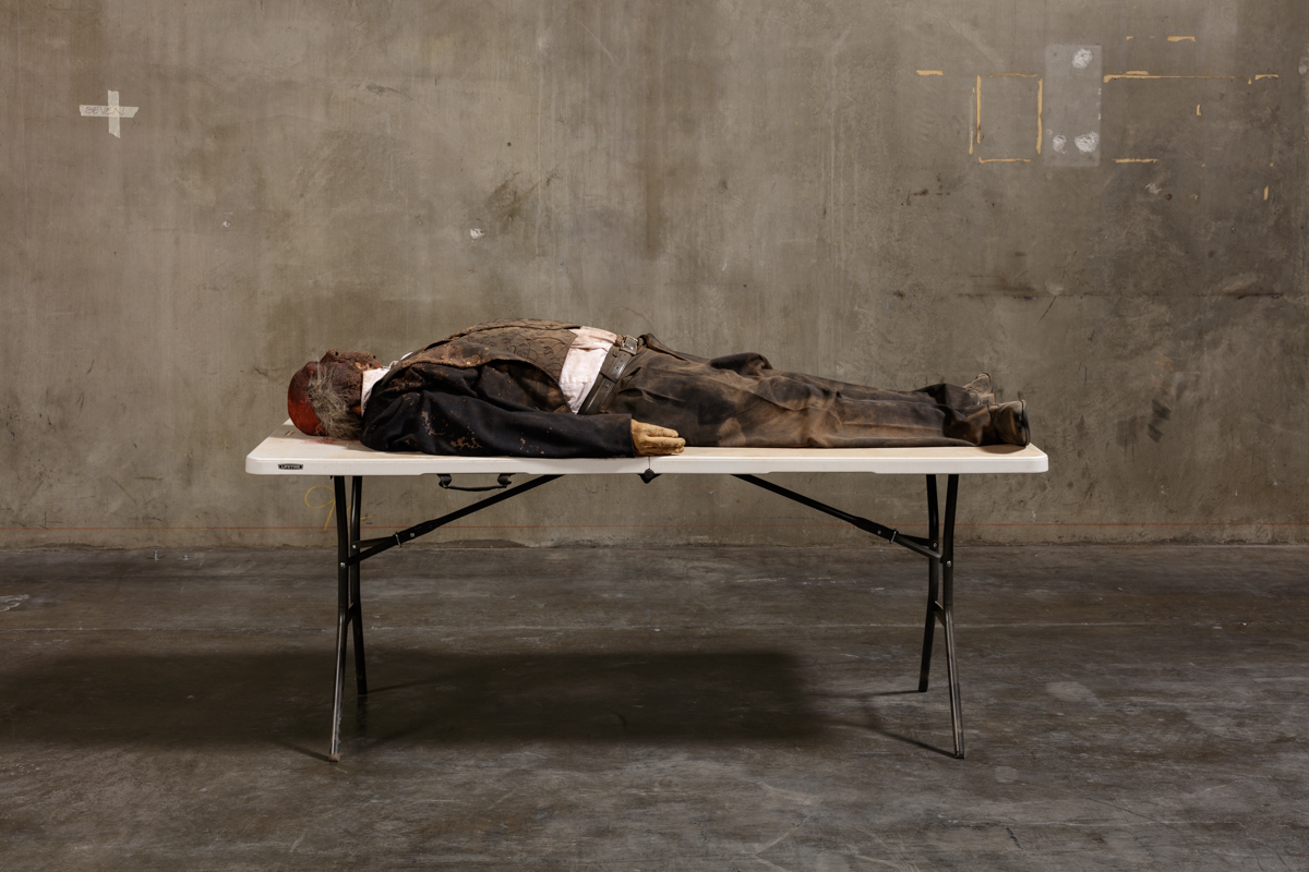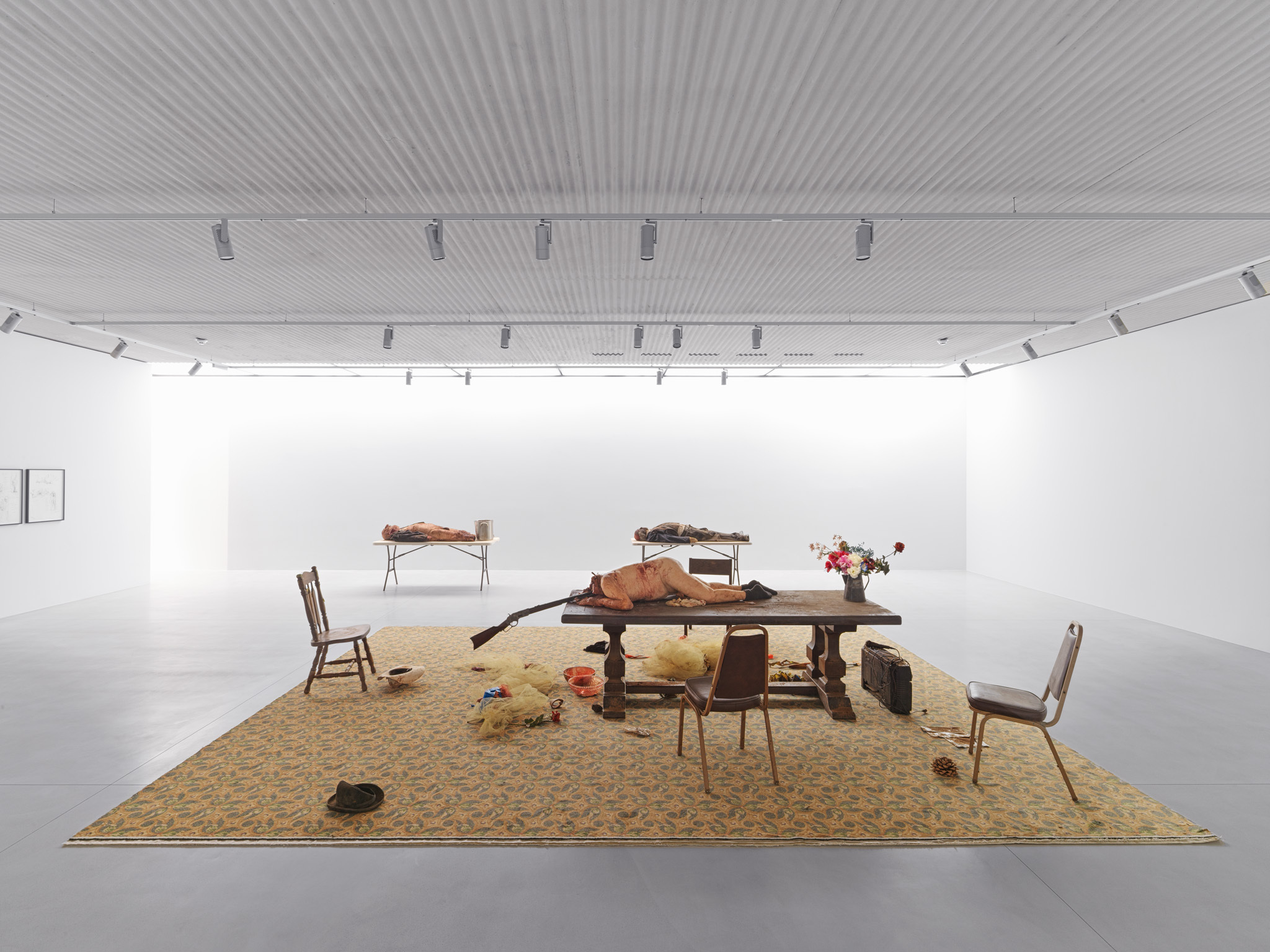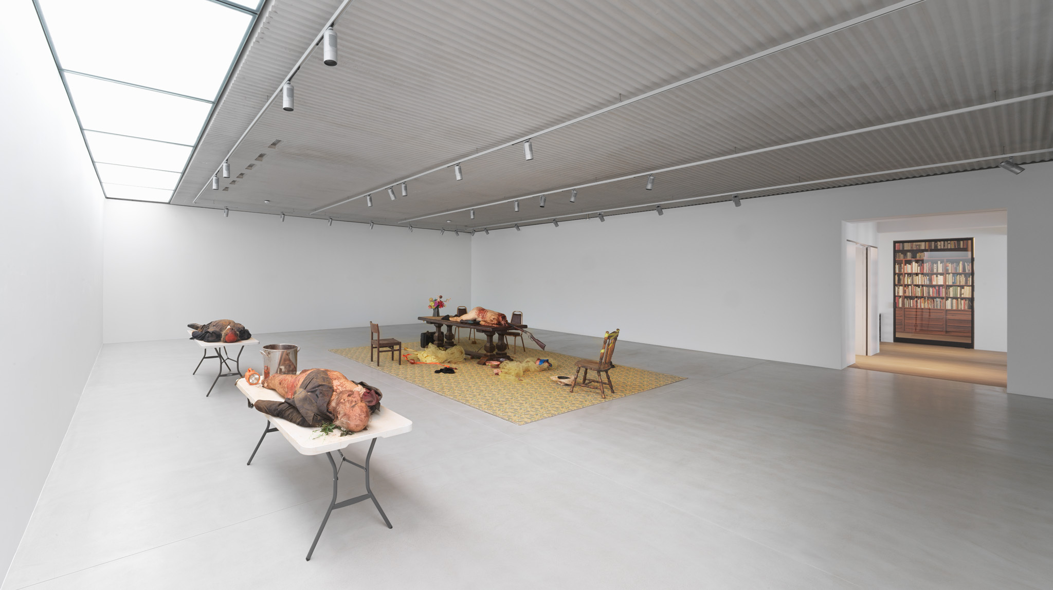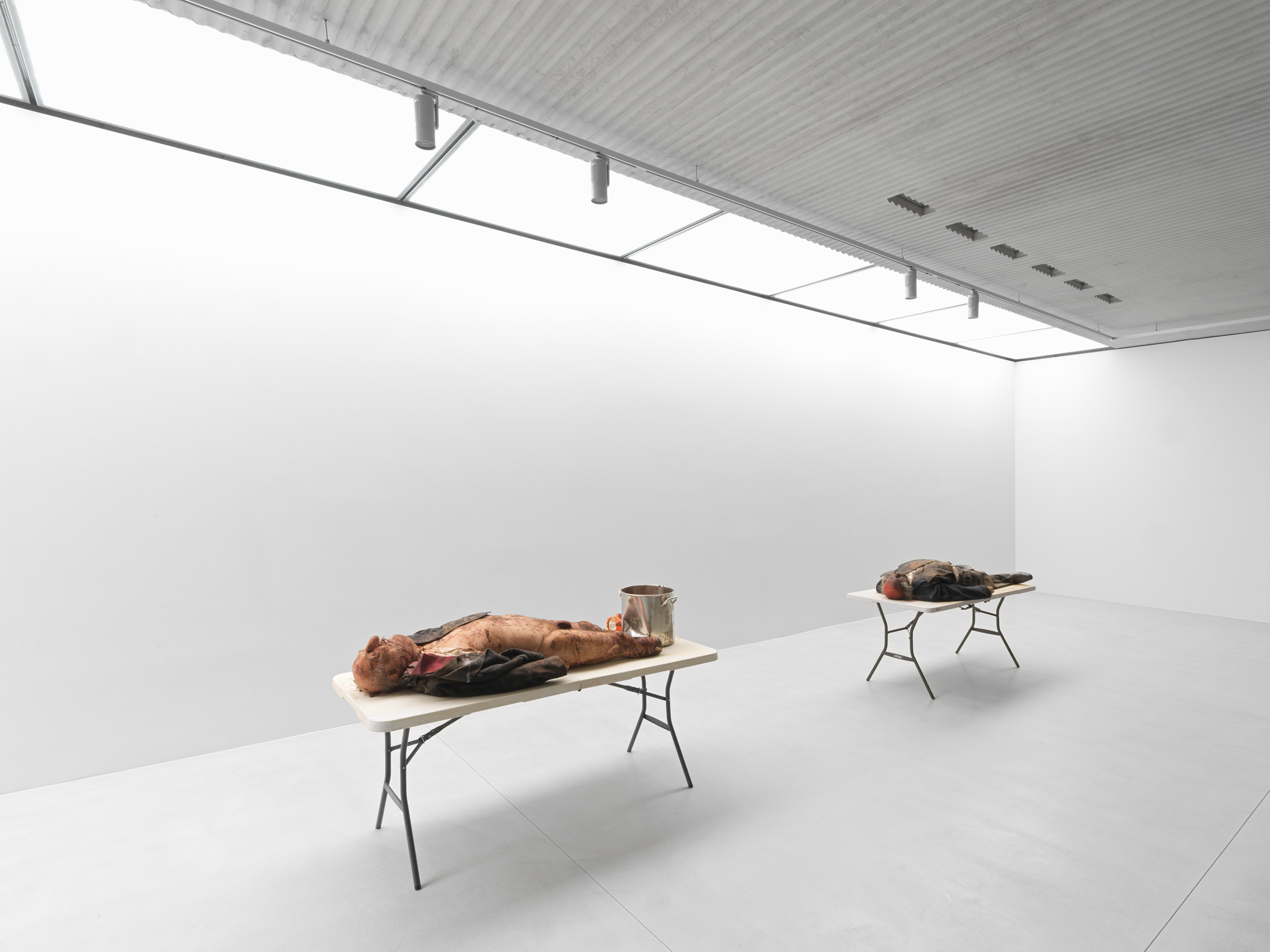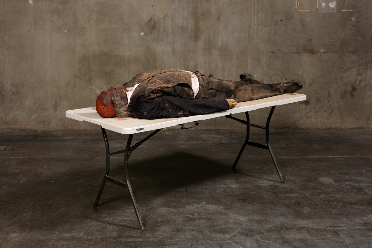 Three sculptures of McCarthy’s Ronald / J. P. Morgan character, which belong to the film, are exhibited in all their meticulously rendered detail. From an exhumed but intact, fully-clothed body to a semi-naked and half-butchered figure, the triptych concludes with a desecrated corpse that is mainly identifiable from the head on the floor. Seen in isolation from the film, the CSSC Banker sculptures raise more questions than they answer: what has led to this violence? What happened and why? The answers, of a sort, can be found on screen. As ‘relics’ of the cinematic process, so to speak, they also highlight the gap between image and reality. McCarthy presents the works twice: once in the film, during which they are passed off as ‘real’, but also in the gallery, which allows us to view them up-close, for longer, and in all their lifelike ‘unreality’. The intangible (cinematic image) and tangible (sculptures) coexist in the same space. Moreover, in every key respect, they are exact replicas of the artist, created from casts of his own body. Is this the death of a character, and everything he represents, or the death of the artist/director? This dichotomy is particularly resonant in CSSC Banker, Ronald, Table, and Flowers (2016), which is shown in an identical arrangement to the film. Three figures, instead of one, imply that the Ronald / J. P. Morgan character has died multiple times and invariably returned to life, both as a nod to the surreal nature of the film and the mantra that Hollywood stars never die: they can perish endlessly on screen but will always live to make another movie, ad nauseum (John Wayne ‘died’ in at least eight films). On another level, the sculptures touch upon existential questions around death, mortality and identity, more specifically the cross-over points between role-playing and selfhood.