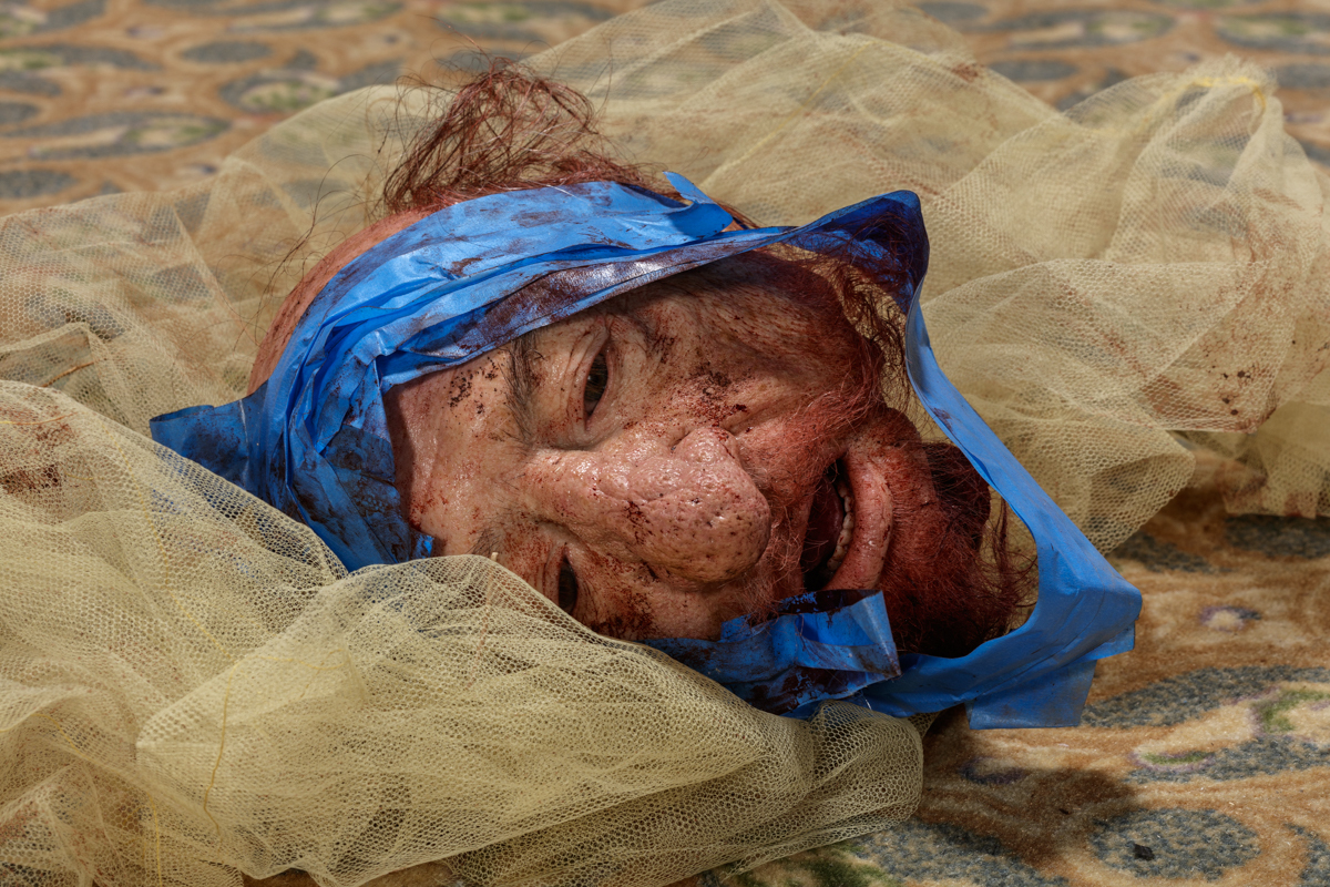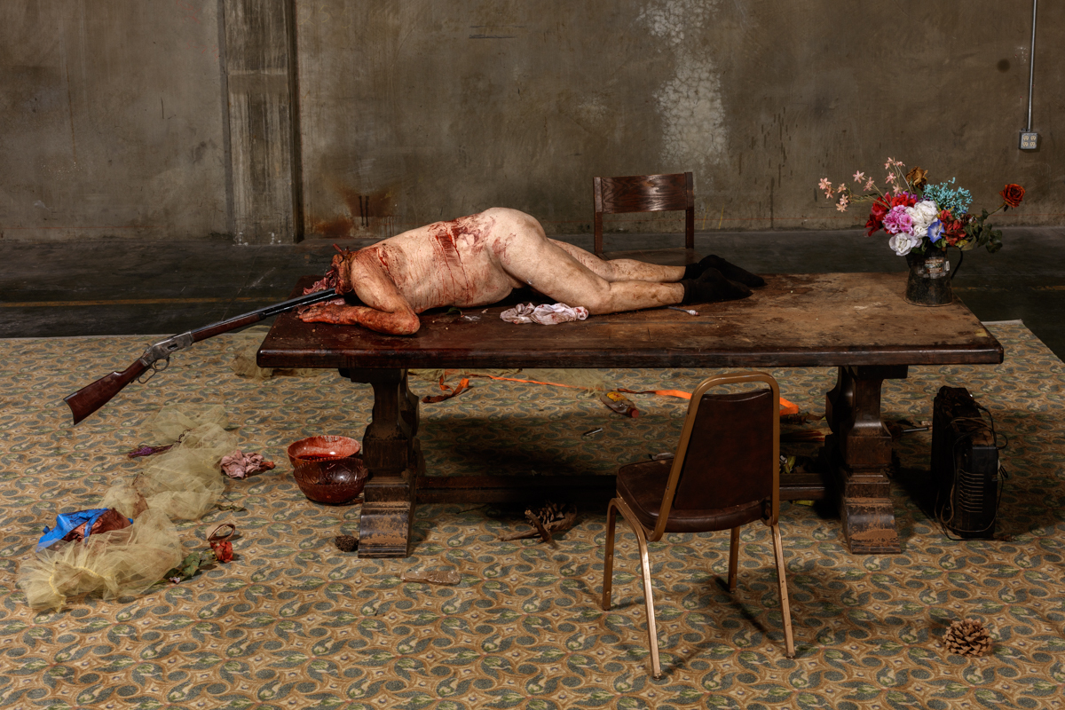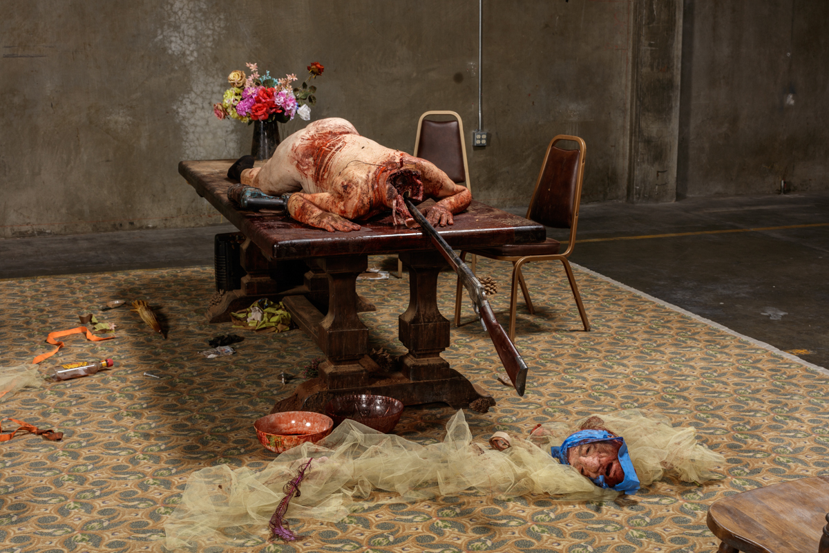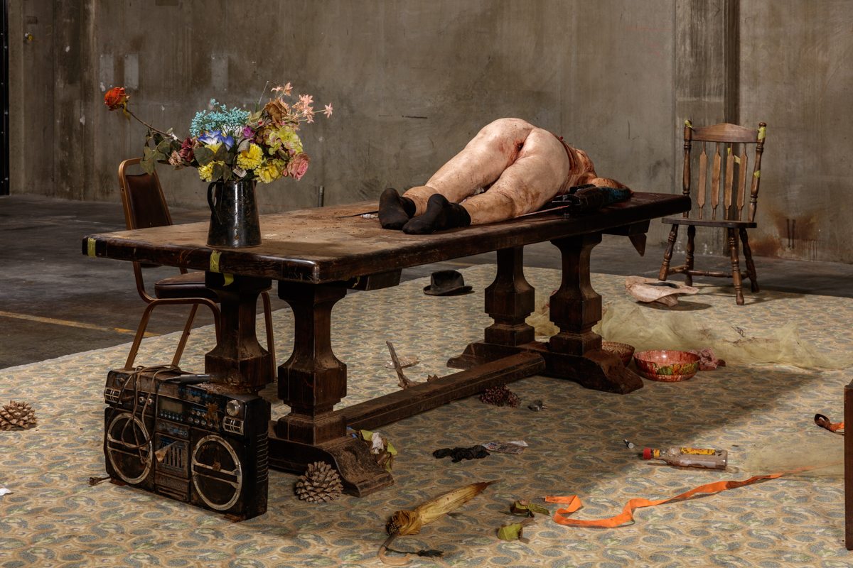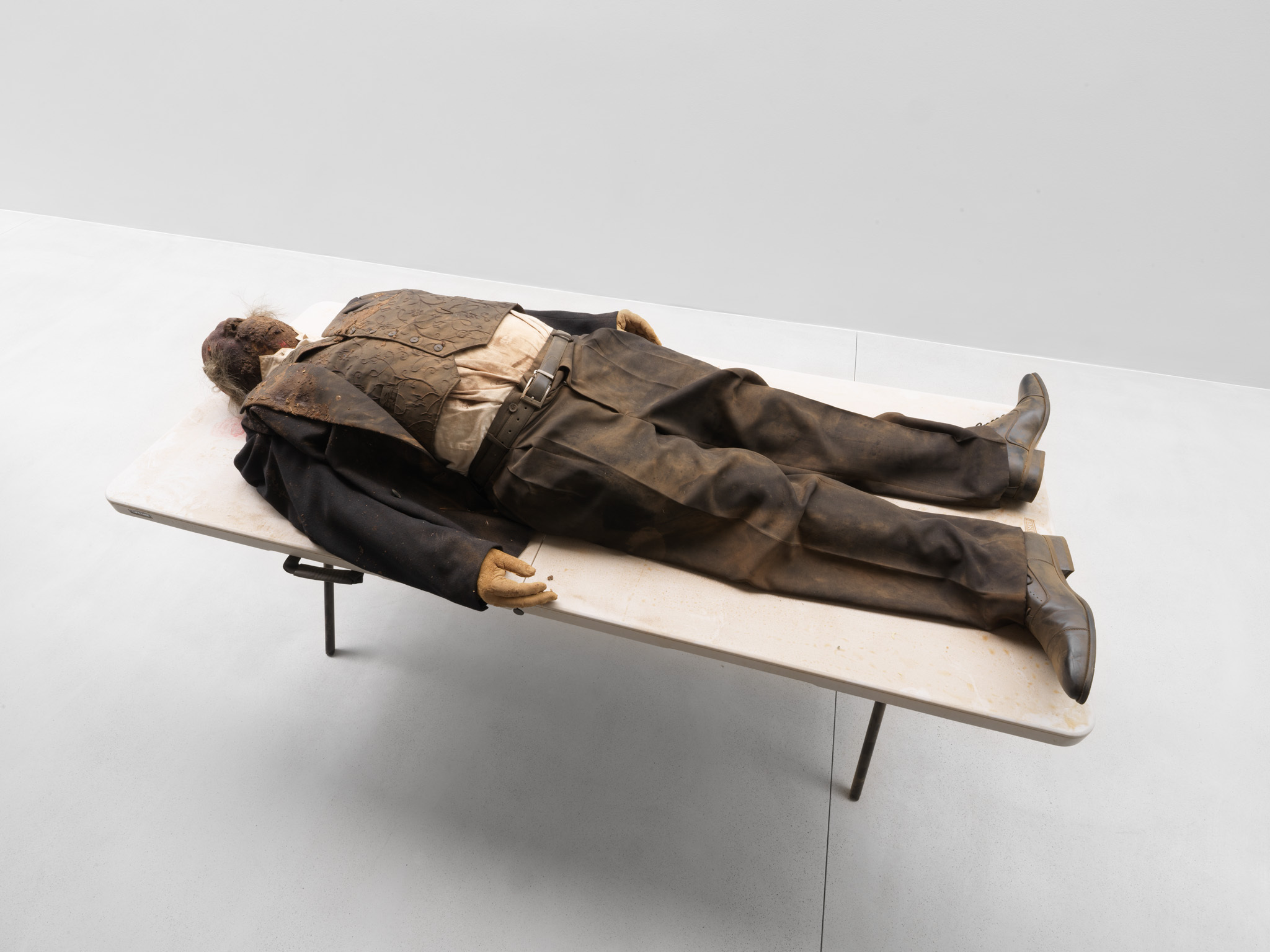 Three sculptures of McCarthy’s Ronald / J. P. Morgan character, which belong to the film, are exhibited in all their meticulously rendered detail. From an exhumed but intact, fully-clothed body to a semi-naked and half-butchered figure, the triptych concludes with a desecrated corpse that is mainly identifiable from the head on the floor. Seen in isolation from the film, the CSSC Banker sculptures raise more questions than they answer: what has led to this violence? What happened and why? The answers, of a sort, can be found on screen. As ‘relics’ of the cinematic process, so to speak, they also highlight the gap between image and reality. McCarthy presents the works twice: once in the film, during which they are passed off as ‘real’, but also in the gallery, which allows us to view them up-close, for longer, and in all their lifelike ‘unreality’. The intangible (cinematic image) and tangible (sculptures) coexist in the same space. Moreover, in every key respect, they are exact replicas of the artist, created from casts of his own body. Is this the death of a character, and everything he represents, or the death of the artist/director? This dichotomy is particularly resonant in CSSC Banker, Ronald, Table, and Flowers (2016), which is shown in an identical arrangement to the film. Three figures, instead of one, imply that the Ronald / J. P. Morgan character has died multiple times and invariably returned to life, both as a nod to the surreal nature of the film and the mantra that Hollywood stars never die: they can perish endlessly on screen but will always live to make another movie, ad nauseum (John Wayne ‘died’ in at least eight films). On another level, the sculptures touch upon existential questions around death, mortality and identity, more specifically the cross-over points between role-playing and selfhood.