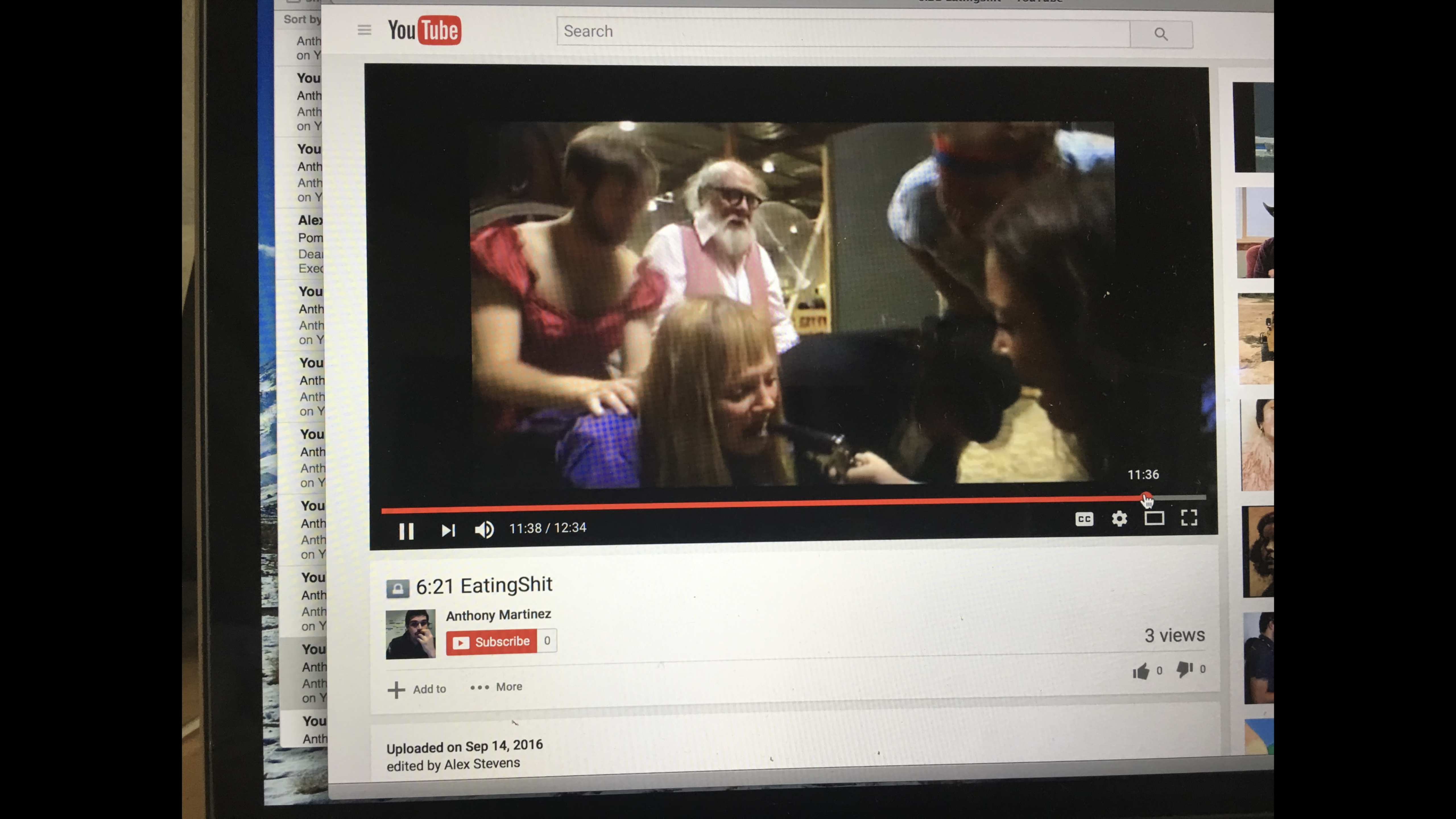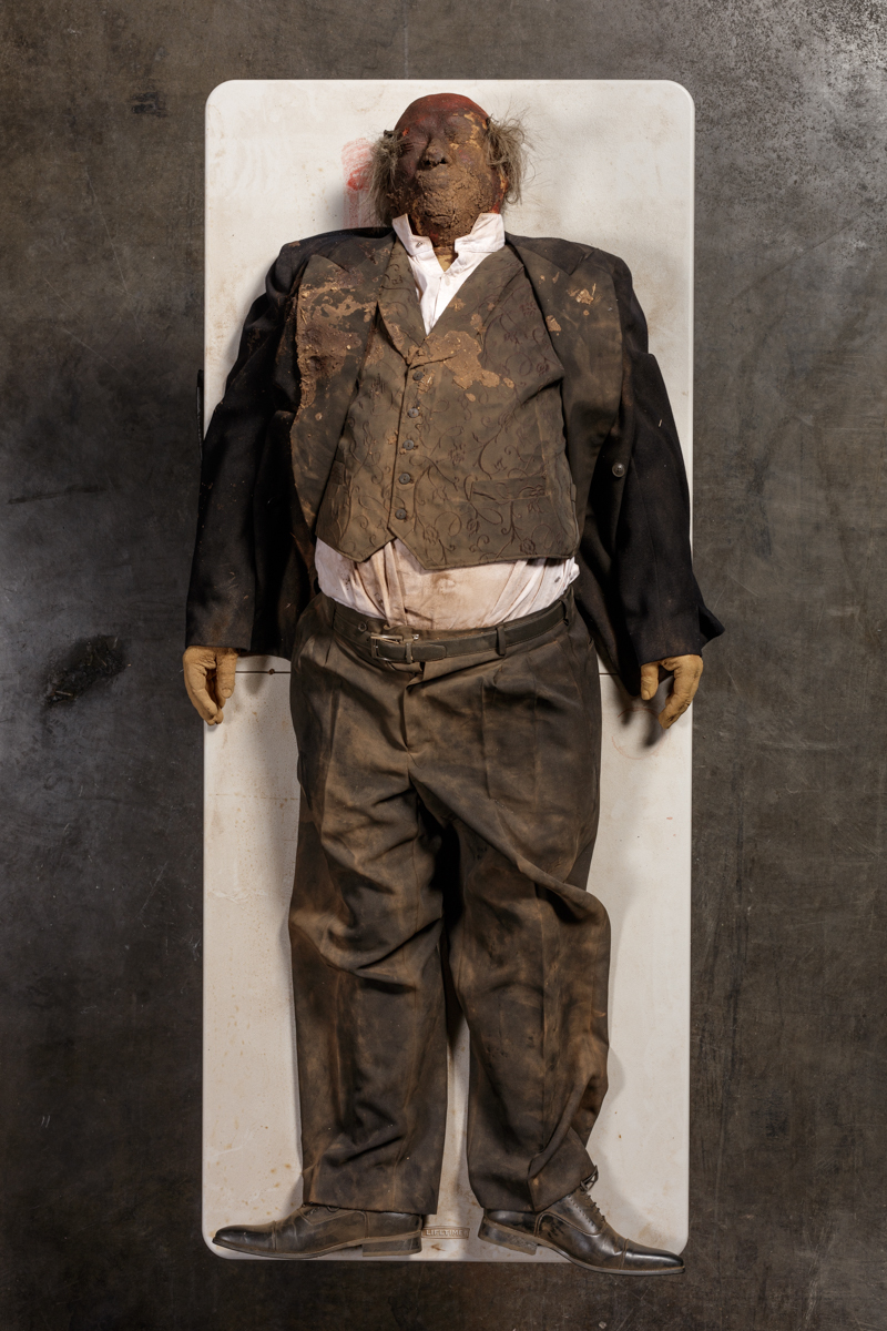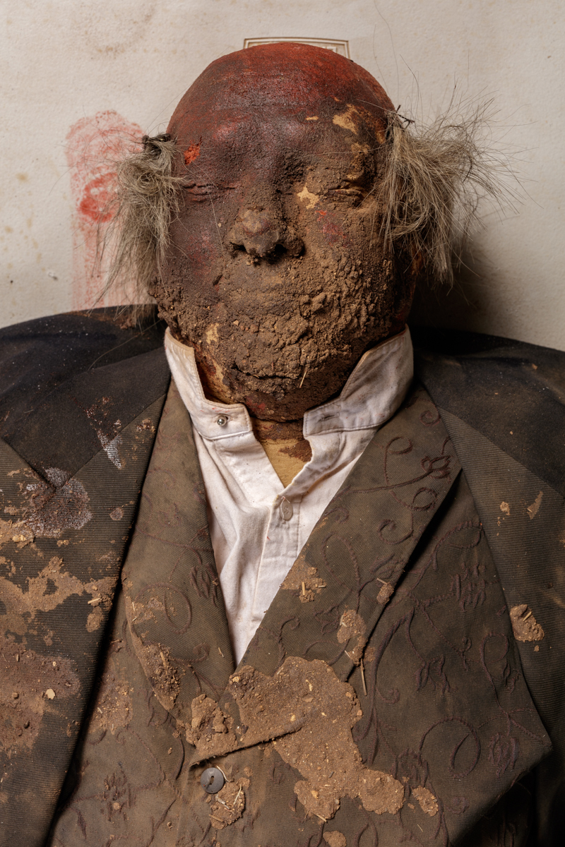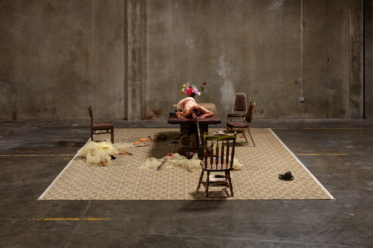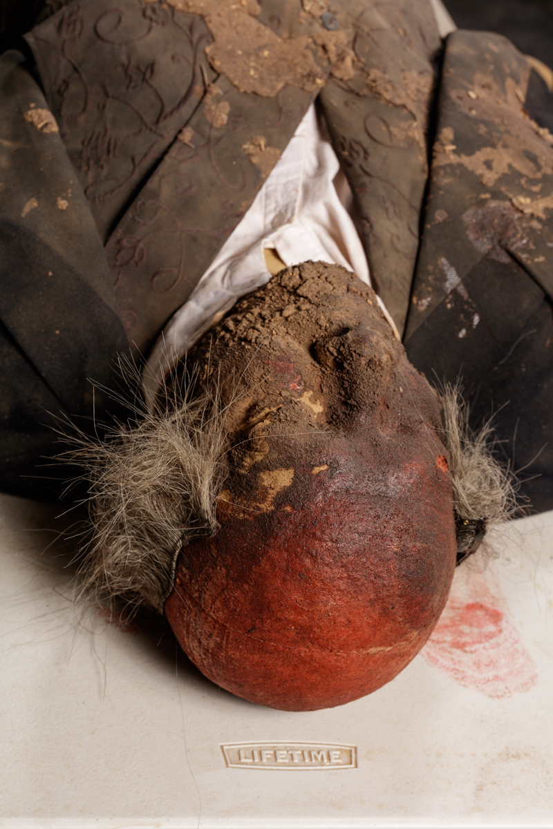 Three sculptures of McCarthy’s Ronald / J. P. Morgan character, which belong to the film, are exhibited in all their meticulously rendered detail. From an exhumed but intact, fully-clothed body to a semi-naked and half-butchered figure, the triptych concludes with a desecrated corpse that is mainly identifiable from the head on the floor. Seen in isolation from the film, the CSSC Banker sculptures raise more questions than they answer: what has led to this violence? What happened and why? The answers, of a sort, can be found on screen. As ‘relics’ of the cinematic process, so to speak, they also highlight the gap between image and reality. McCarthy presents the works twice: once in the film, during which they are passed off as ‘real’, but also in the gallery, which allows us to view them up-close, for longer, and in all their lifelike ‘unreality’. The intangible (cinematic image) and tangible (sculptures) coexist in the same space. Moreover, in every key respect, they are exact replicas of the artist, created from casts of his own body. Is this the death of a character, and everything he represents, or the death of the artist/director? This dichotomy is particularly resonant in CSSC Banker, Ronald, Table, and Flowers (2016), which is shown in an identical arrangement to the film. Three figures, instead of one, imply that the Ronald / J. P. Morgan character has died multiple times and invariably returned to life, both as a nod to the surreal nature of the film and the mantra that Hollywood stars never die: they can perish endlessly on screen but will always live to make another movie, ad nauseum (John Wayne ‘died’ in at least eight films). On another level, the sculptures touch upon existential questions around death, mortality and identity, more specifically the cross-over points between role-playing and selfhood.
