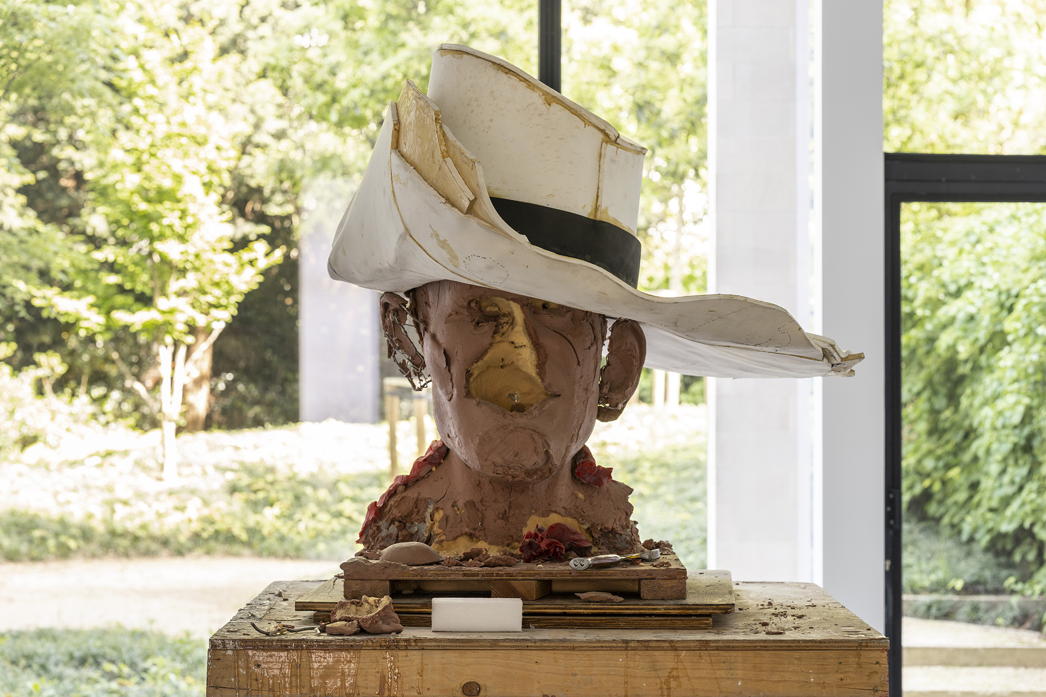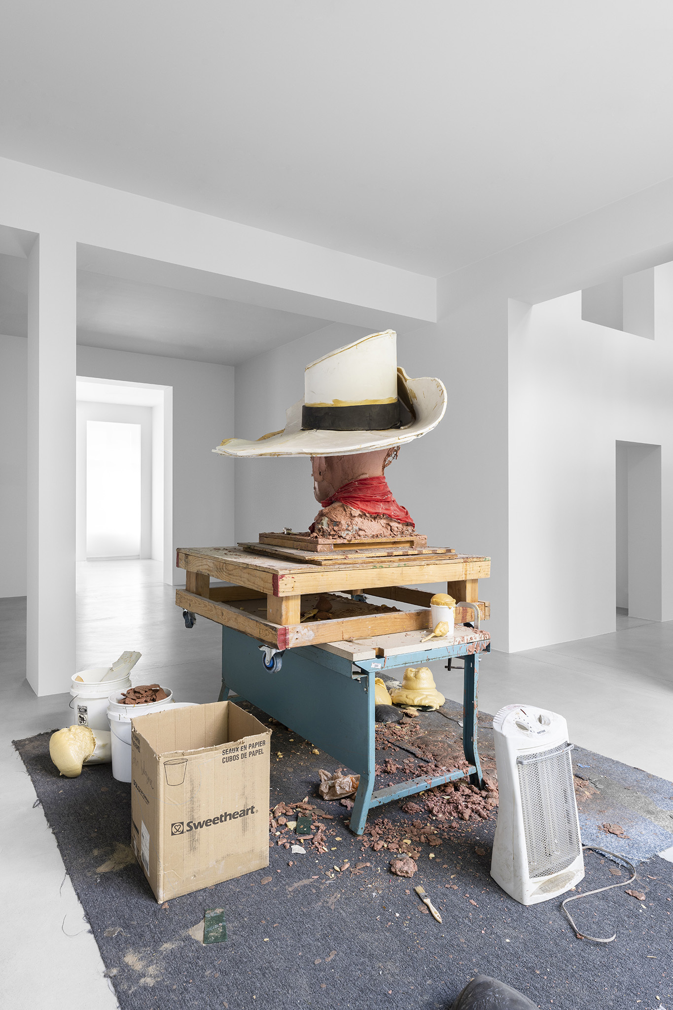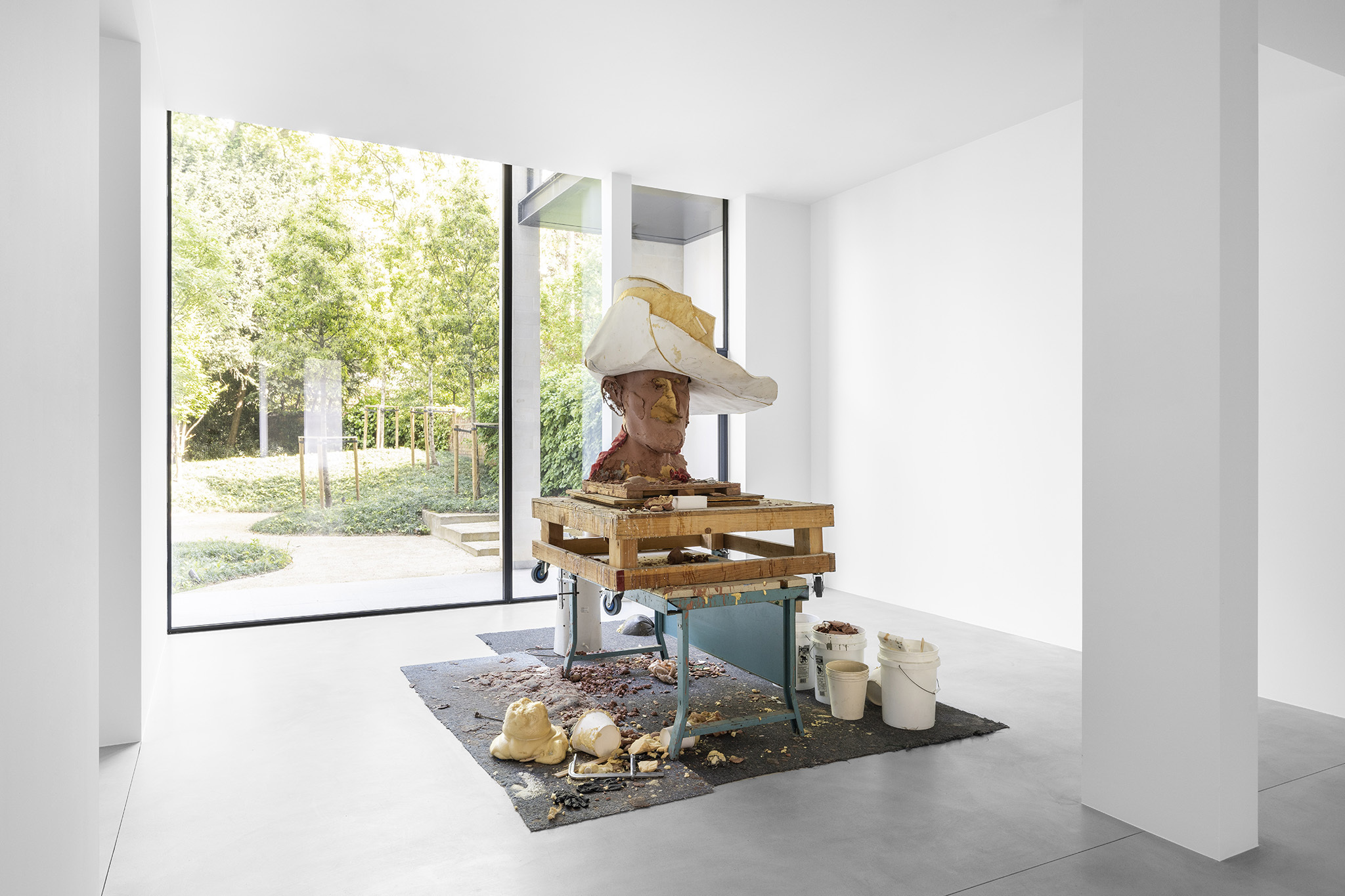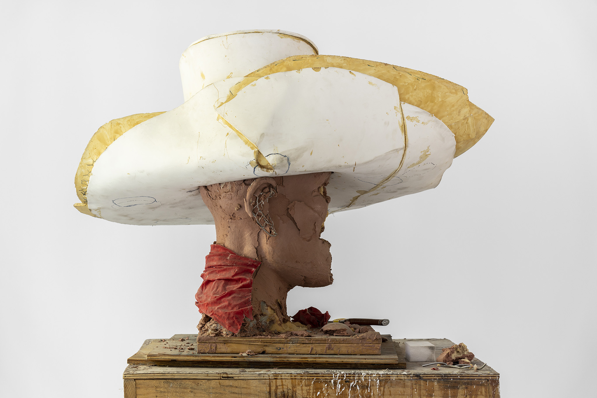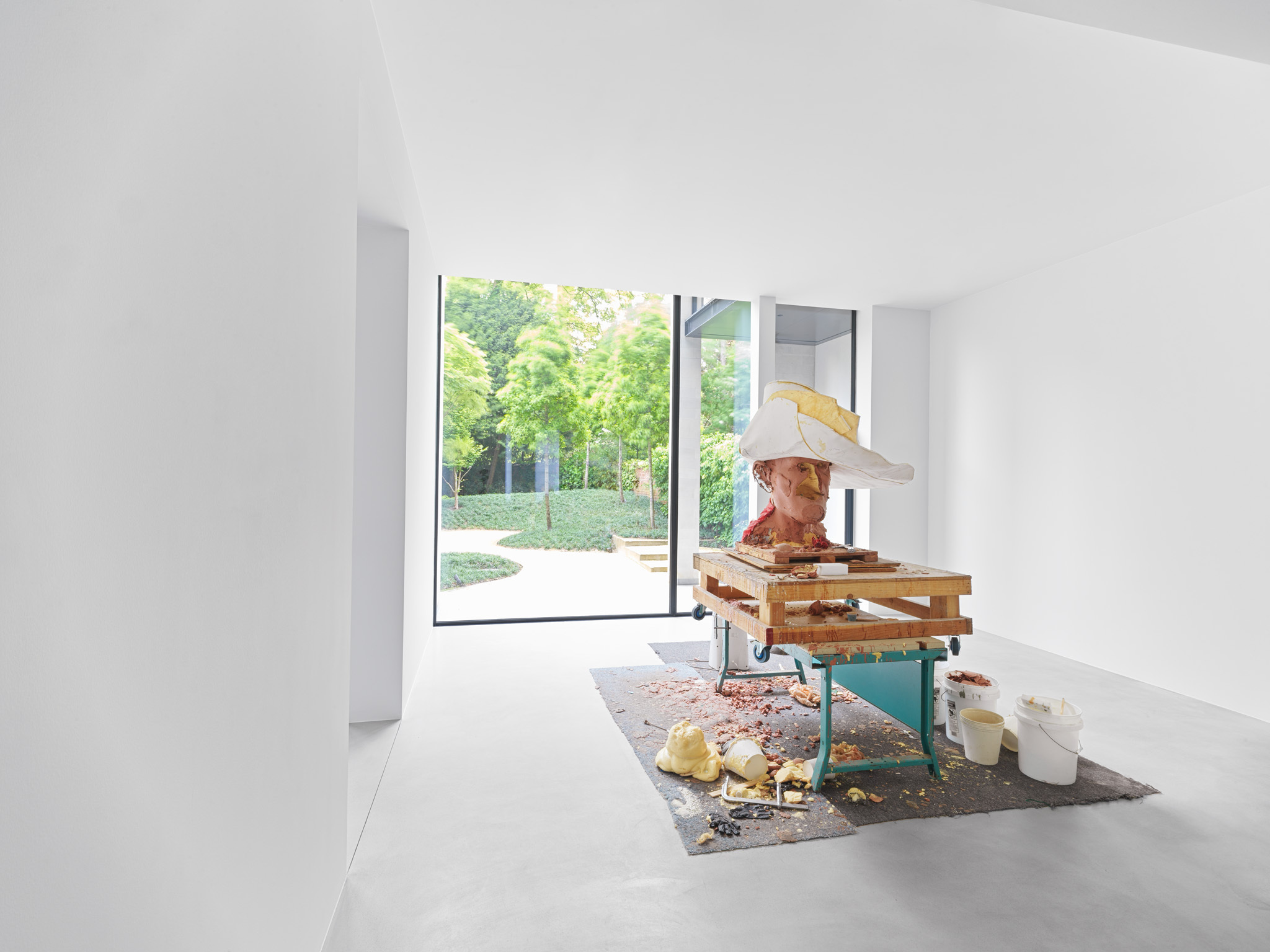 Complementing the exhibition is a large sculpture of John Wayne which relates to the overarching CSSC project. To a large extent, the artist’s films reference classic Westerns such as Stagecoach (1939), starring the aforementioned actor. When Wayne dramatically races his carriage across the desert, the wind catches the brim of his Stetson: the hat in McCarthy’s sculpture is bent at exactly the same angle. In contrast to the hyper-realistic CSSC Banker series, the exposed armatures and amalgam of model-making materials are evocative of old-school, theatrical prop-making techniques. The figure is larger than life, devoid of realistic features, yet eminently recognisable as John Wayne due to the powerful iconography. McCarthy has said of the original Stagecoach film: “It is a prime example of Hollywood westerns creating a myth about the West. A fucked-up myth. The colonialism, the imperialism of America. The atrocity of the American Indians… just the atrocity of the Americas. All of that hidden and camouflaged in racism within Hollywood of the 30s, 40s, 50s.”