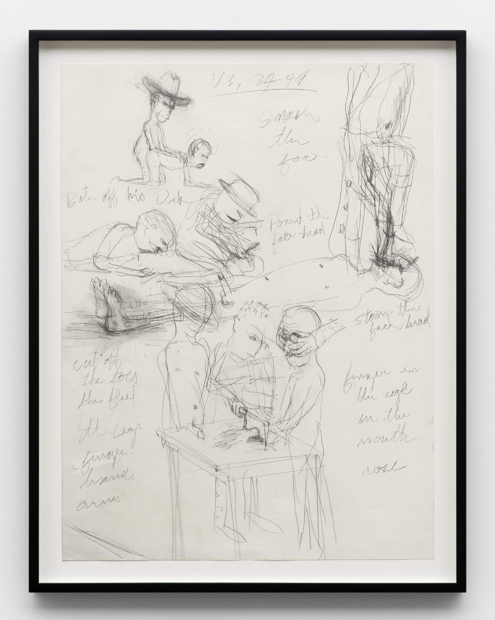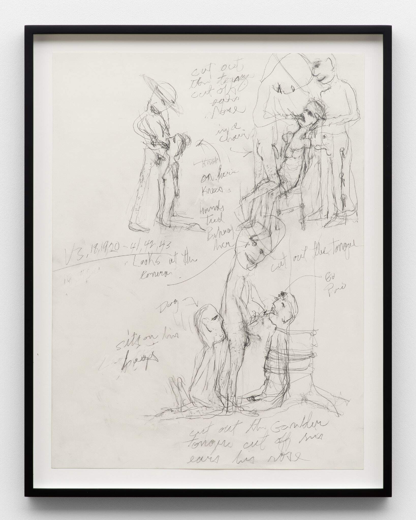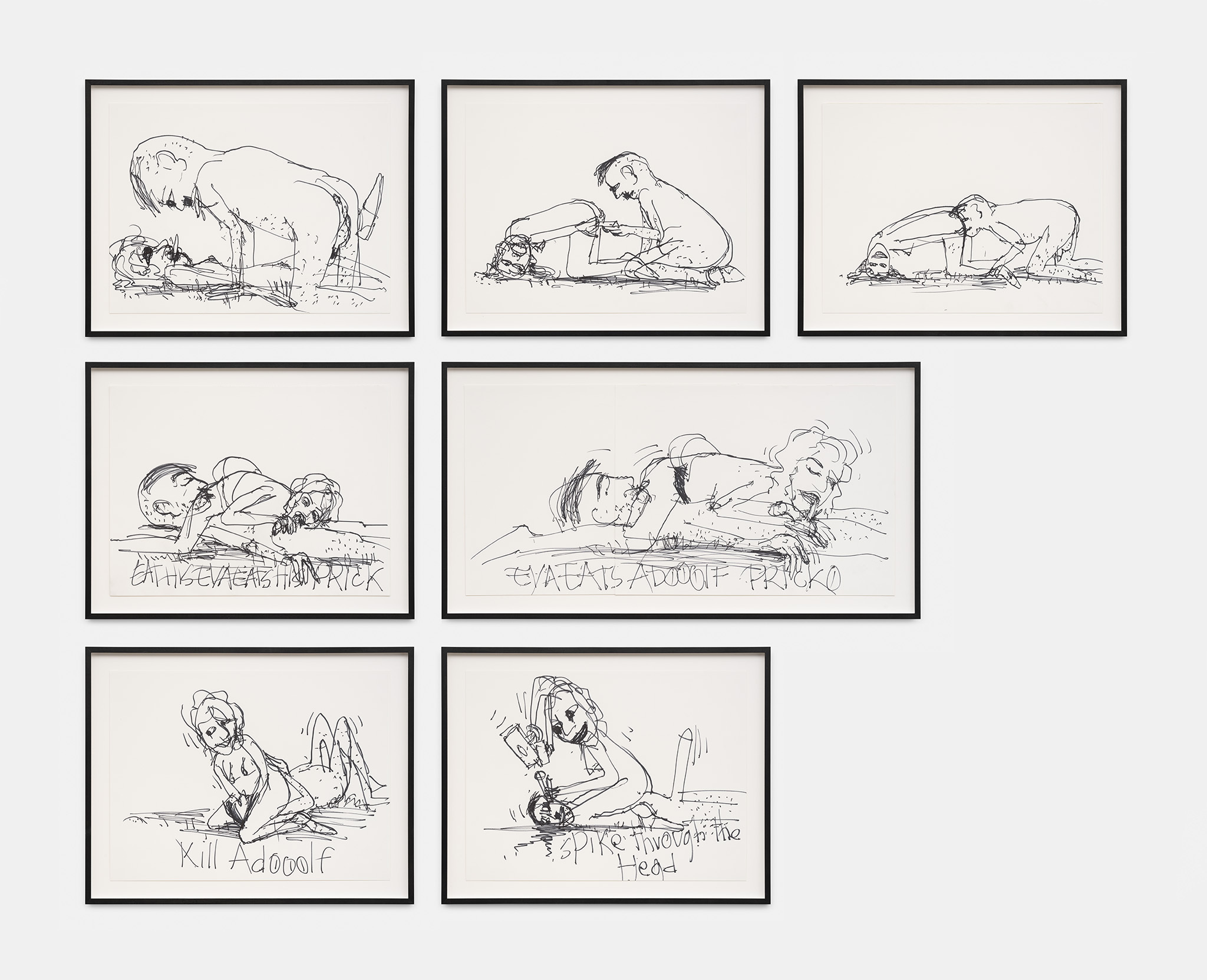 CSSC, The Dogs The Attack and related sculptures are bookended by groups of pencil drawings and oil paintings. The former predate the CSSC and DADDA films and are akin to visual scripts and storyboards, whereas the latter were created this year. While certain paintings reimagine specific scenarios from the live-action sequences – the J. P. Morgan character on the table is clearly visible, for example, in CSSC DOG GOD and CSSC GOD COD – others venture into uncharted territory. In A&E EVAEAT CANNIBAL and A&E HEAD SPIKE, for instance, characters from another performance-based work, namely Adolf and Eva/Adam and Eve (from the A&E corpus), join forces with the bloodthirsty ‘dogs’. These latter paintings, in which the CSSC and A&E characters are conflated across time and space into new propositions, reveal the porous ‘boundaries’ between McCarthy’s varied worlds.