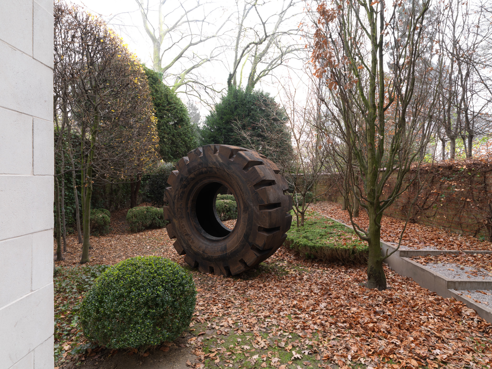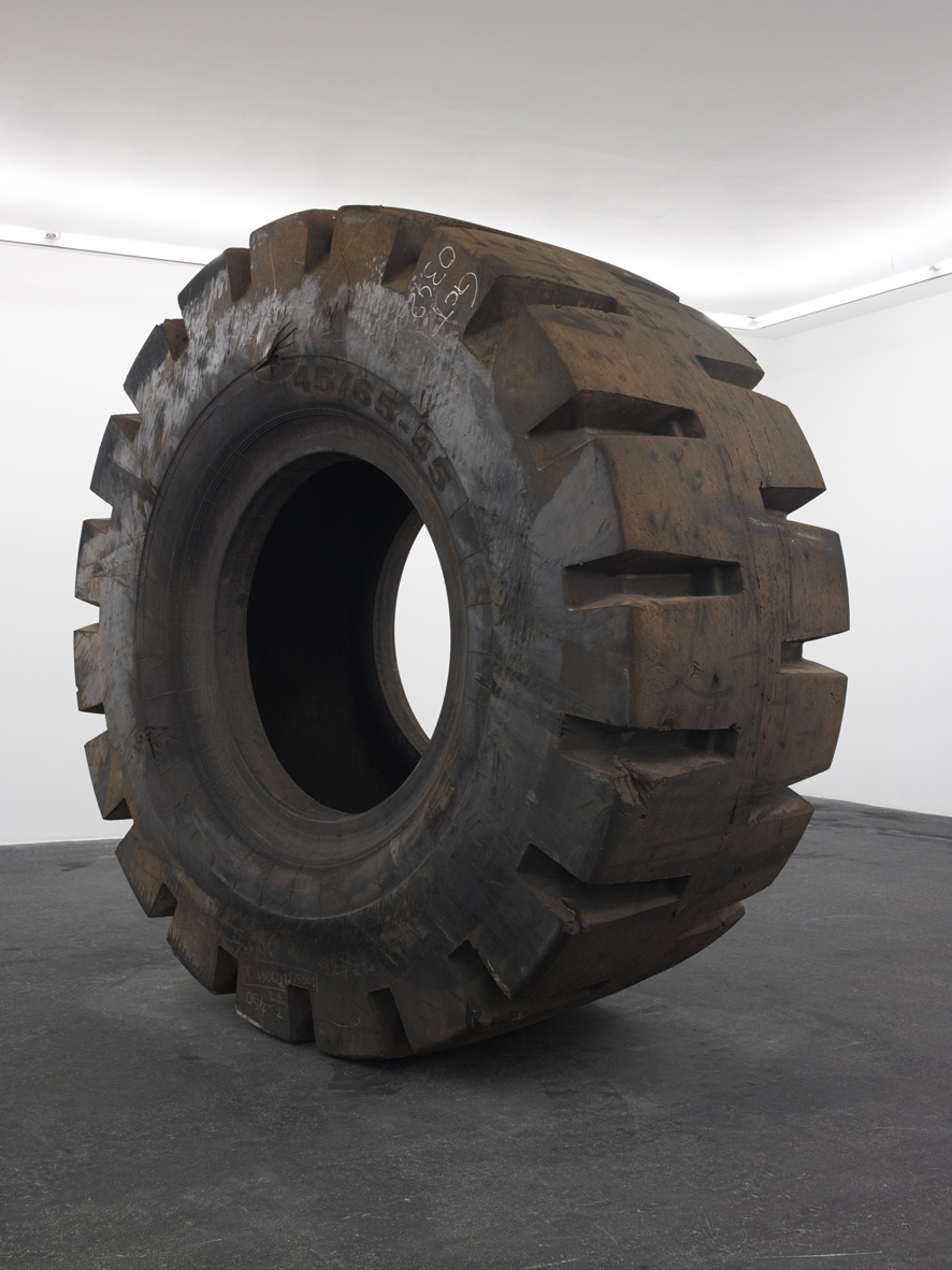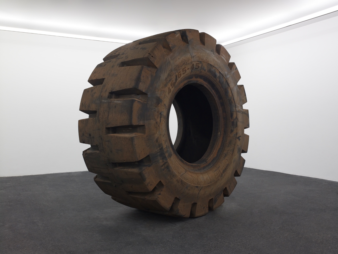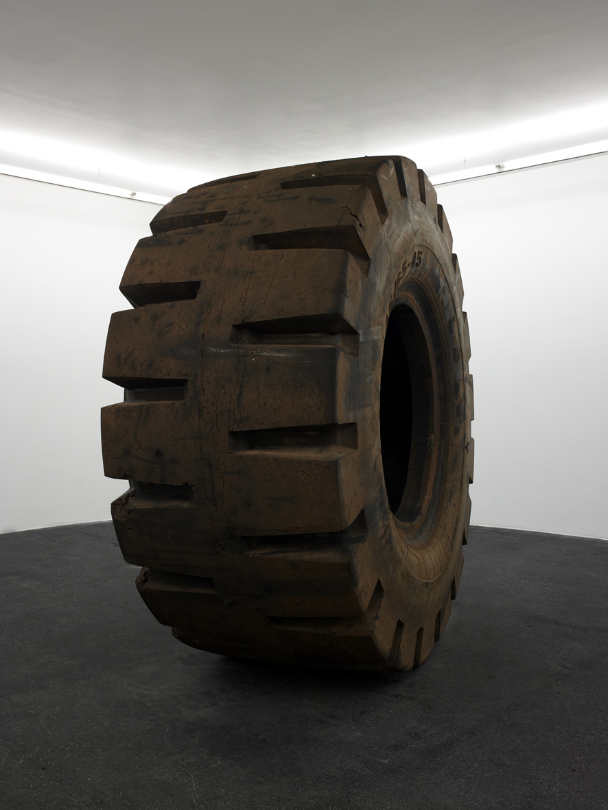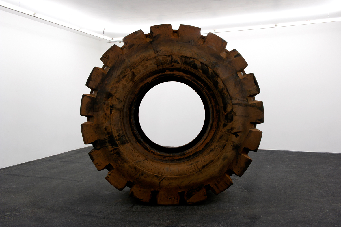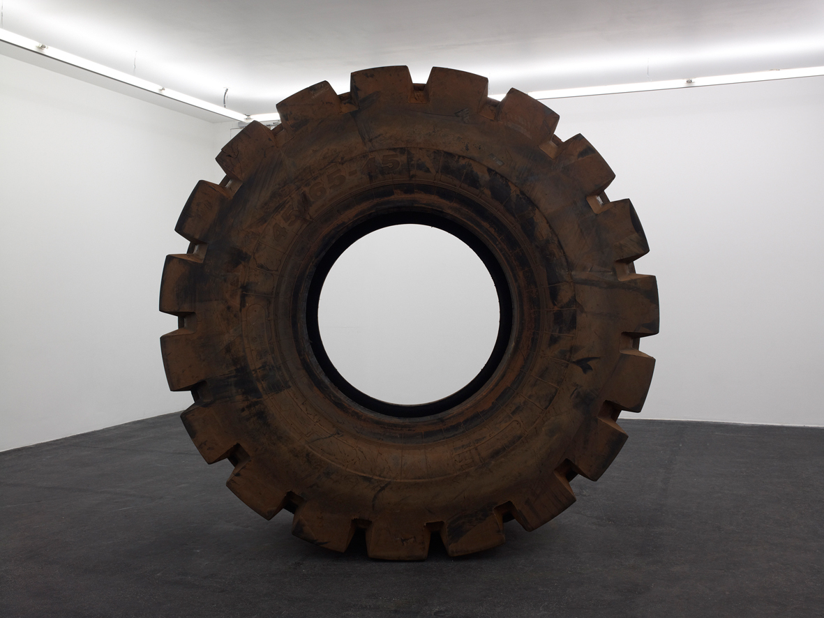 45/65-45 (2012) consists of an enormous tractor tyre with a diameter of 258 cm. The title refers to the type of tyre. As a material object, it is not the result of the artist’s intervention. Nevertheless, the meaning it acquires in the exhibition, and in the corpus of the artist’s oeuvre, is entirely his responsibility.