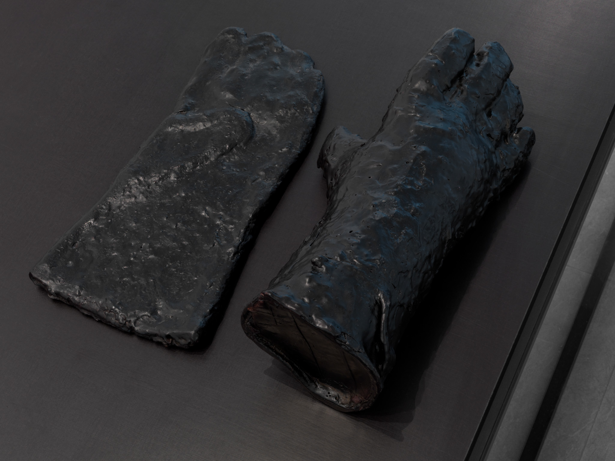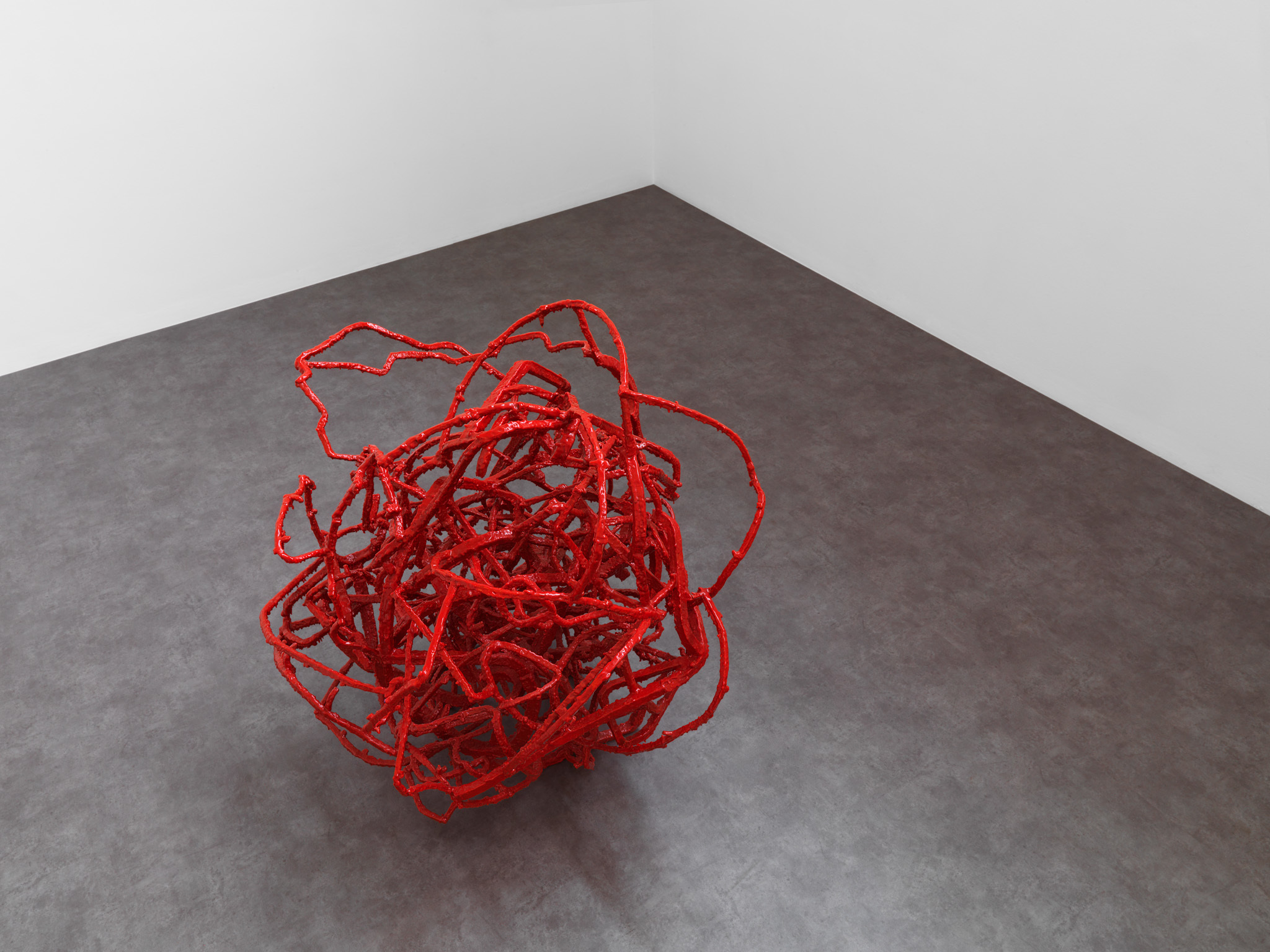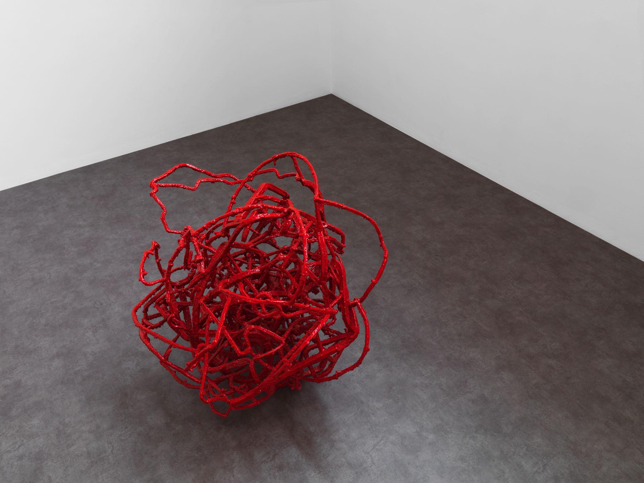 Écorché (2012) is the result of reassembling recovered fragments of bronze sculptures that have been coated with red wax. The wax that normally disappears in the classical lost wax technique is here used as the skin of the sculpture – imbuing it with an aesthetic function, rather than a purely utilitarian one.