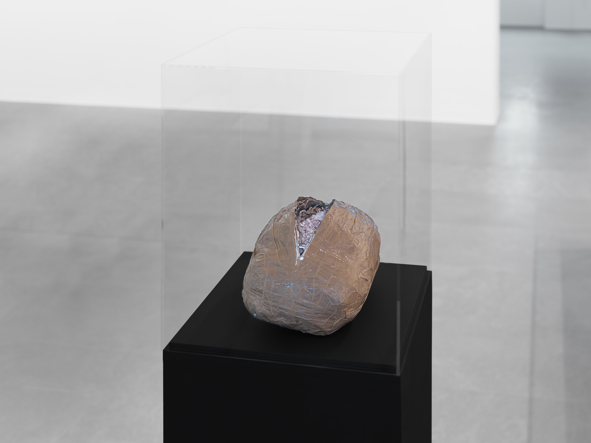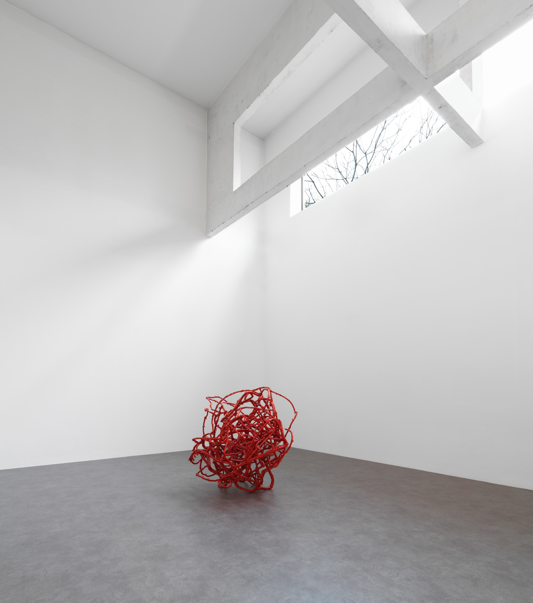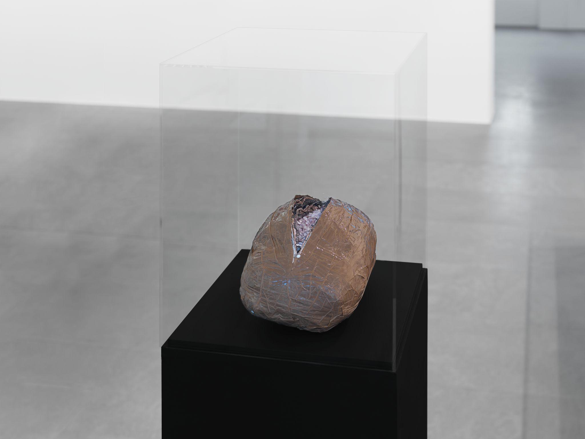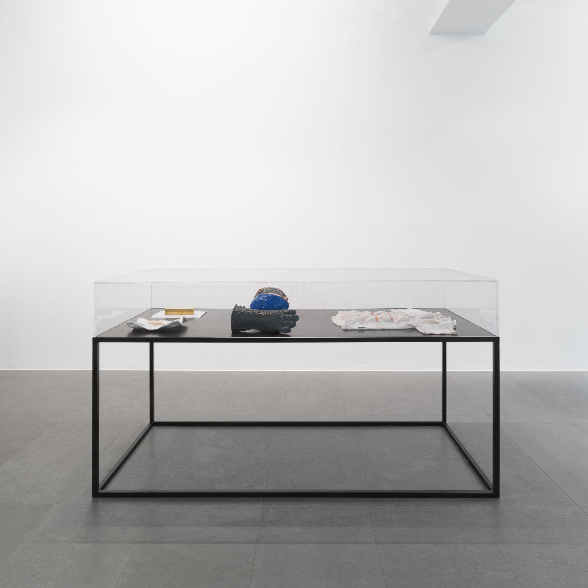 Écorché (2012) is the result of reassembling recovered fragments of bronze sculptures that have been coated with red wax. The wax that normally disappears in the classical lost wax technique is here used as the skin of the sculpture – imbuing it with an aesthetic function, rather than a purely utilitarian one.