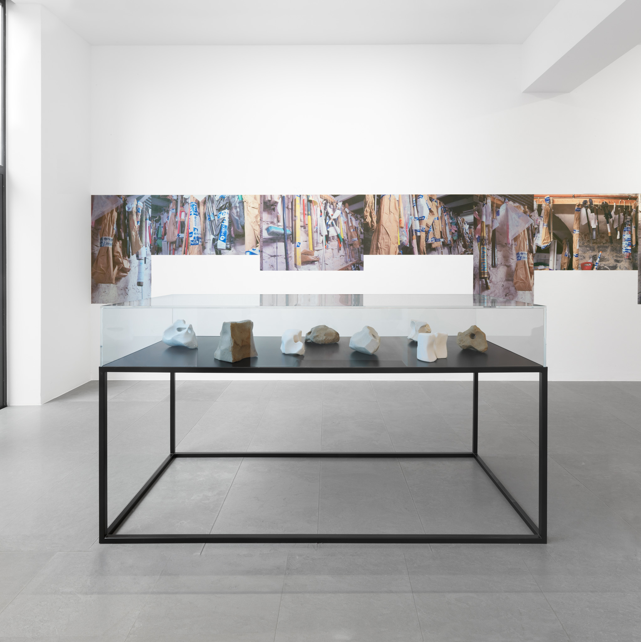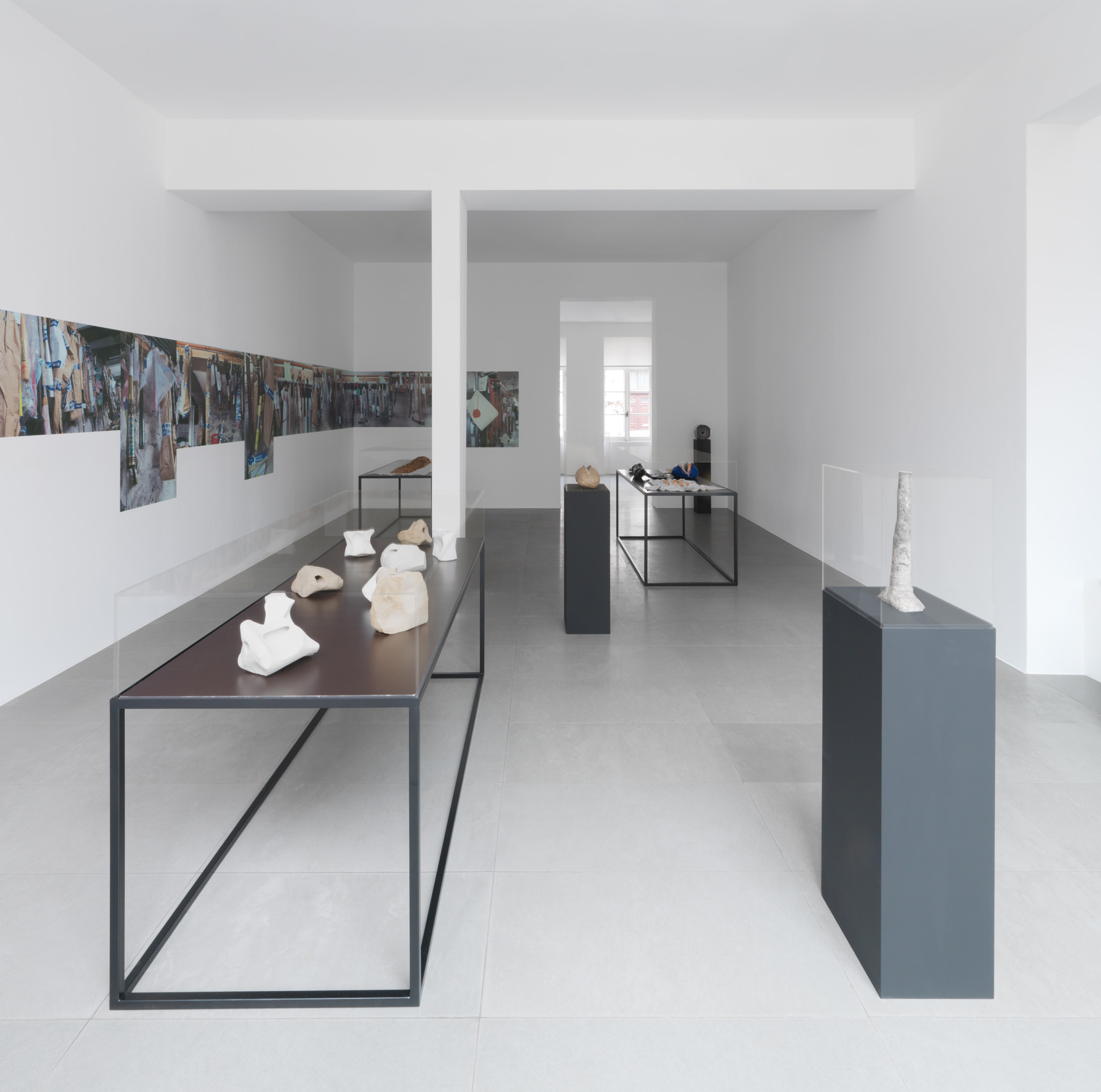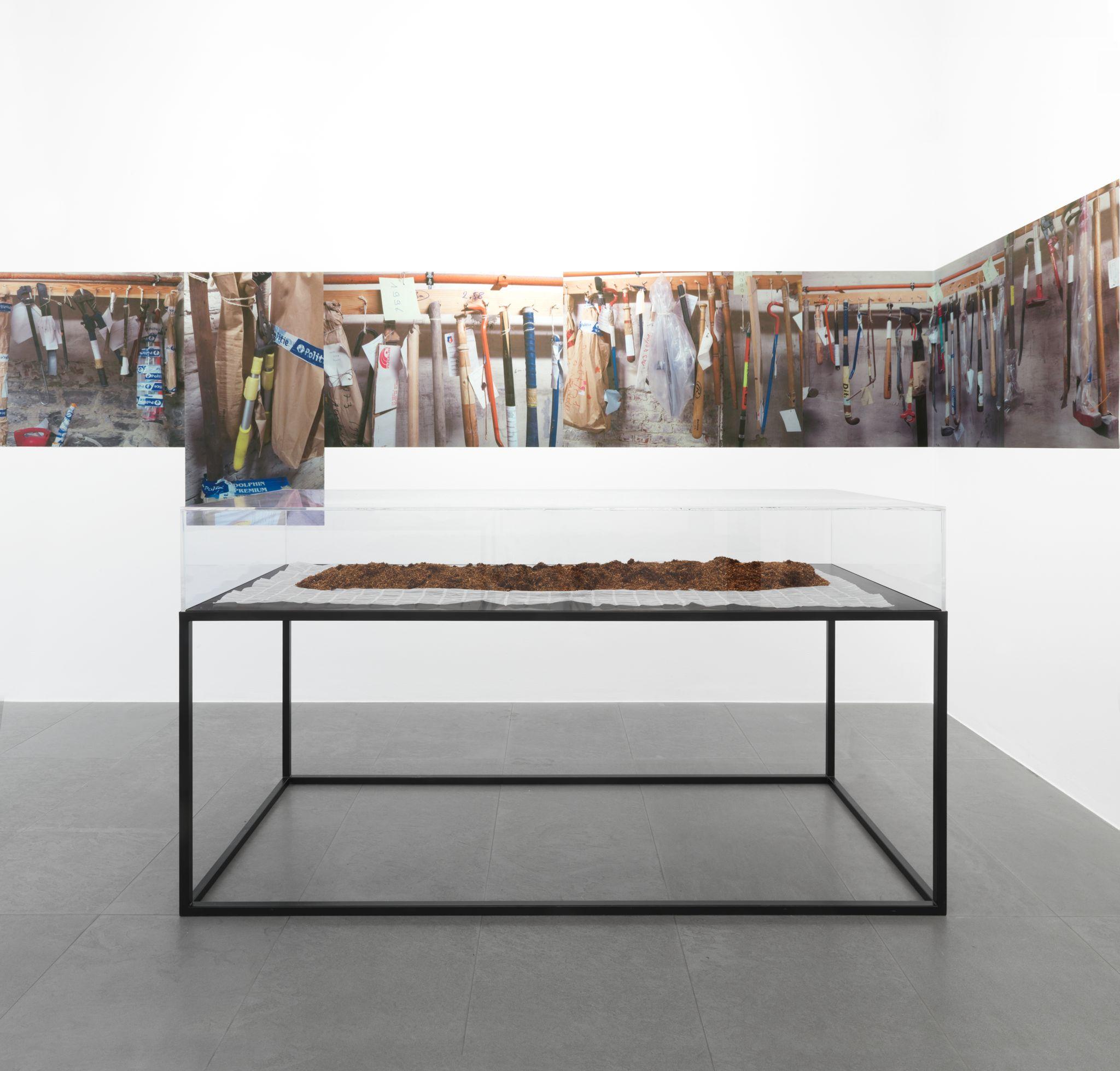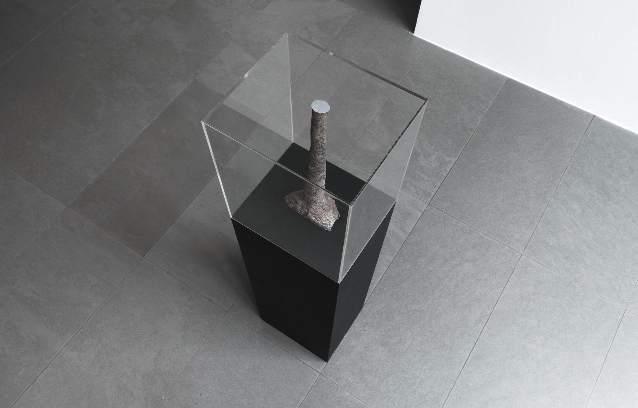 Next to these photographs he shows a number of sculptures that are, without immediately revealing their origins or the way they were made, undoubtedly the result of something that happened outside the exhibition space.