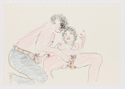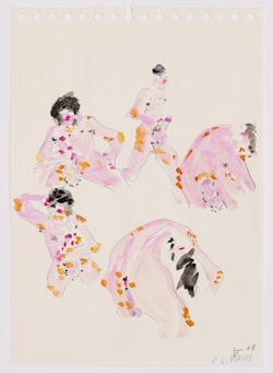The breadth of this ensemble offers insight into how his practice developed and expanded: using gouache, pencil, drawing, revisiting lost drawings made more than 30 years prior, inventing new scenes, trialing new ways of depicting figures and faces. They are uninhibited and extremely elaborate, created with great care, and at times full of humour. His drawings, Guyotat said, had to be “thought”: each of them took weeks to conceive before being realised. They have an underpinning narrative, only a piece of which is made into an image; they sometimes draw on mythological figures, or stem from the world he created himself, a world of symbolic (masculine) “whores”, which in their own exploitation embodied the destiny of humankind.