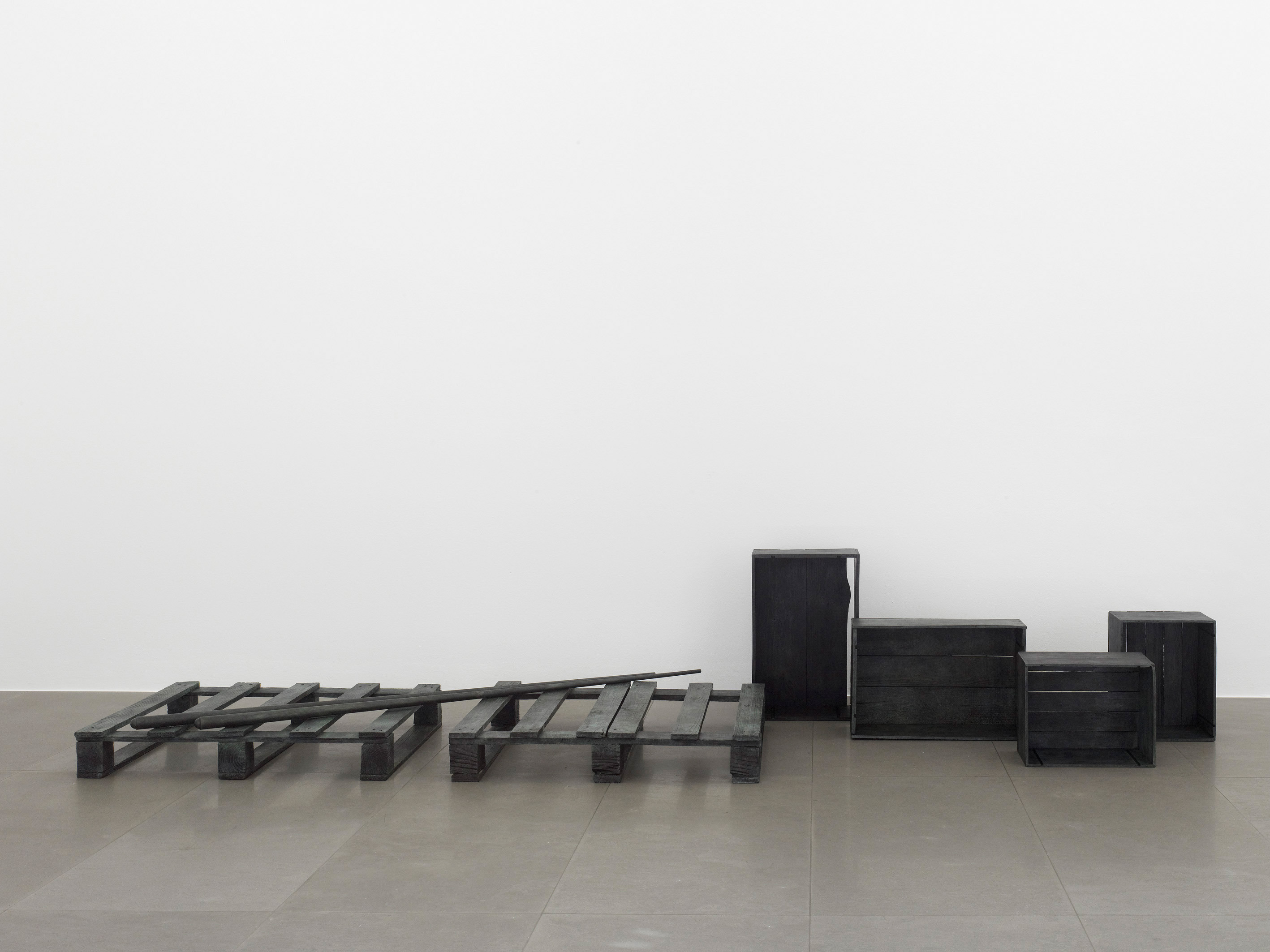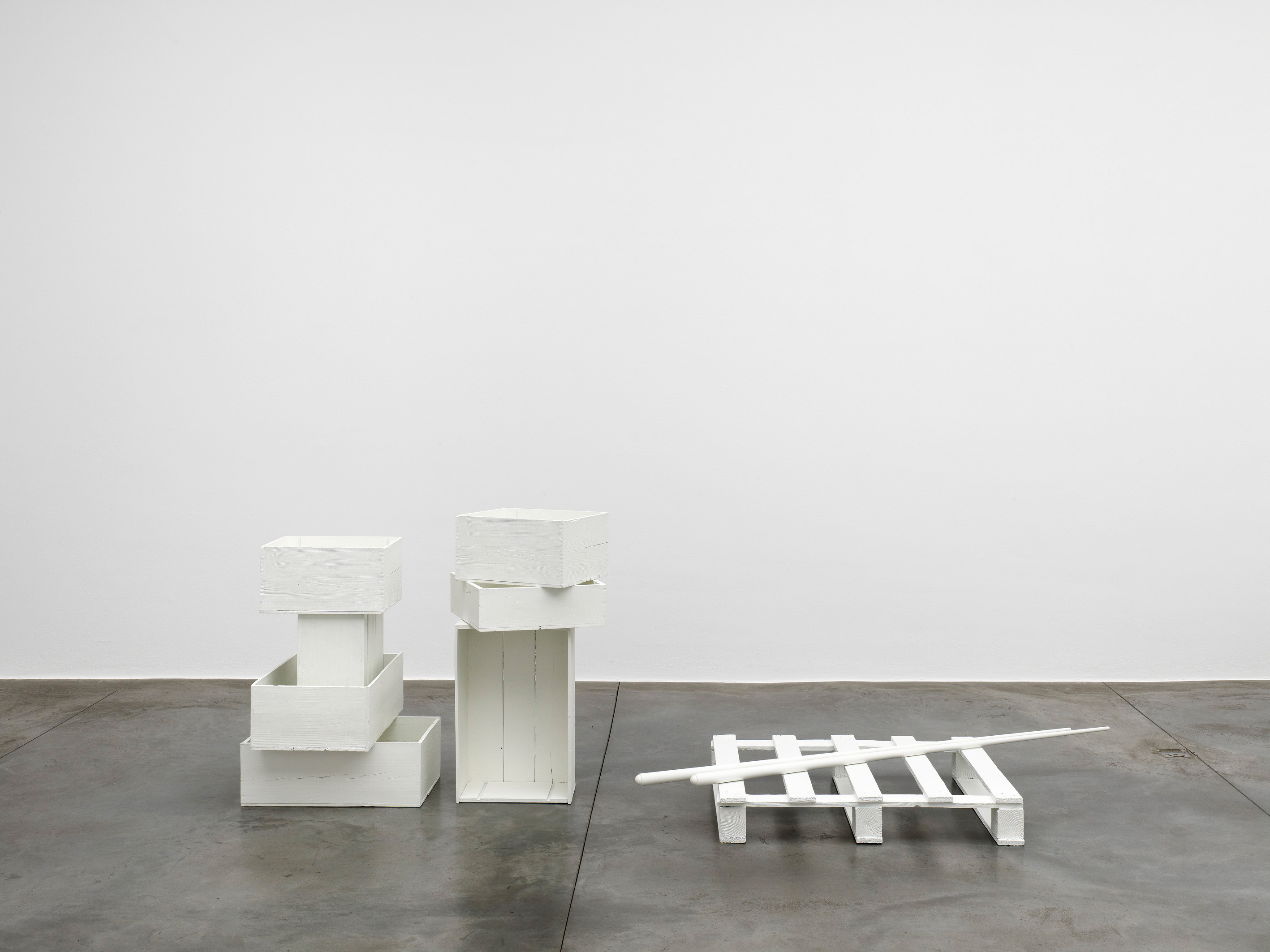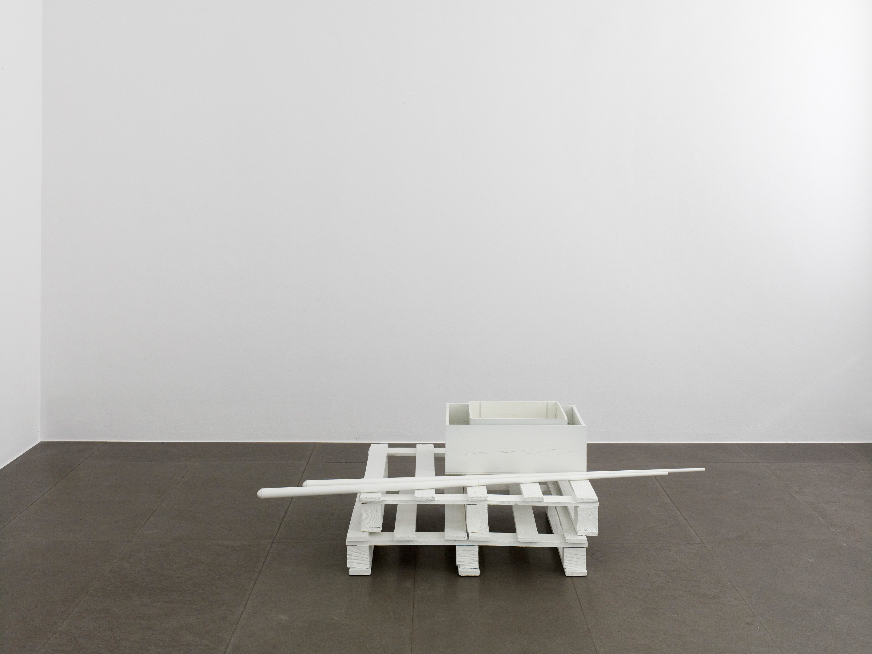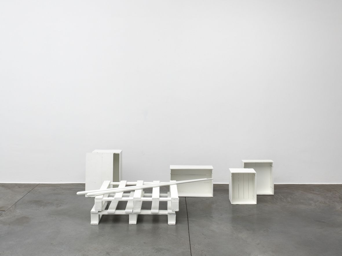 The works which Jan Vercruysse now exhibits, are part of a new series: Places [Lost]. How to initiate a first introduction, a narrative on these new works? A limited set of selected objects constitutes the base for the compositions of these works: a few wooden wine crates–of different shapes and dimensions, two wooden pallets and a pair of billiard cues. These objects are artefacts and they served a specific purpose; they have a “human” history. While a single wine crate, a single pallet or a single pair of billiard cues would be just that, it is in their combination—their compositions—that these objects transcend their primary physical characteristics: they become the remains of a journey, the silent keepers of “parts of lives”. In order to enhance the distance with these primary characteristics, the original artefacts are cast in bronze; these bronzes are thereafter painted with a chalklike white colour or sometimes patinated in the classic way. While the Places [Lost] acquire a sculptural quality—in fact, they even are sculptures—they are their own place.