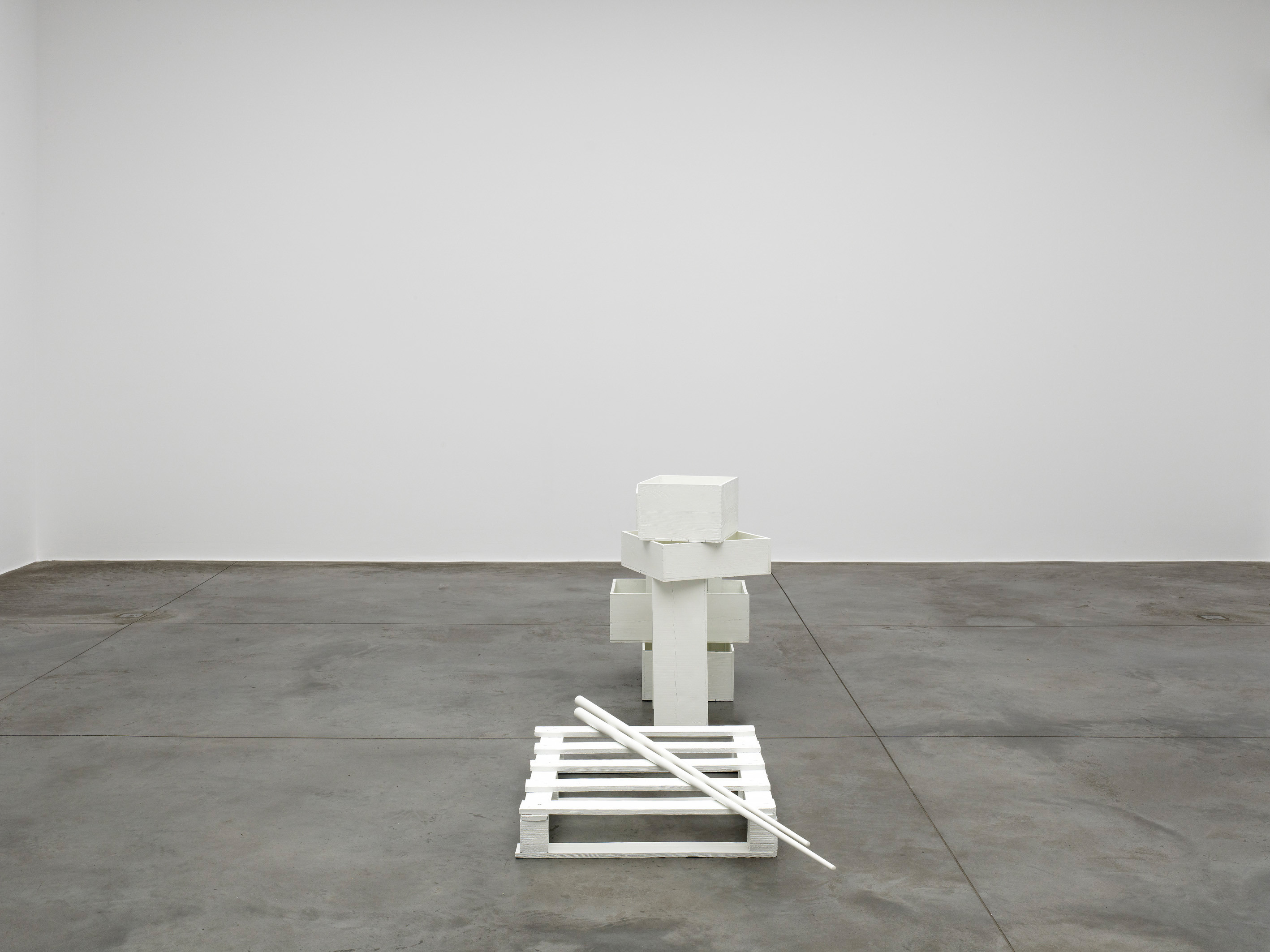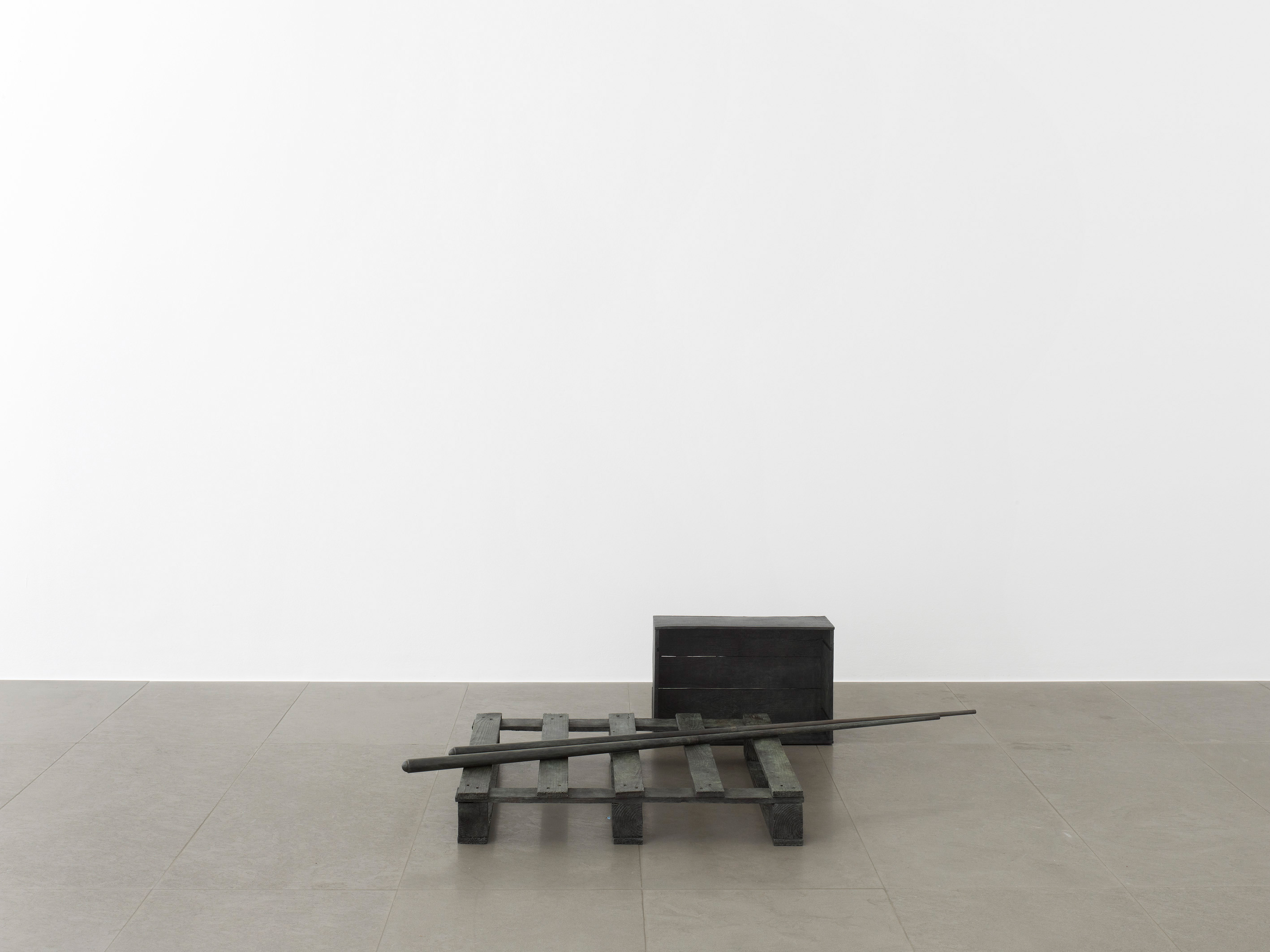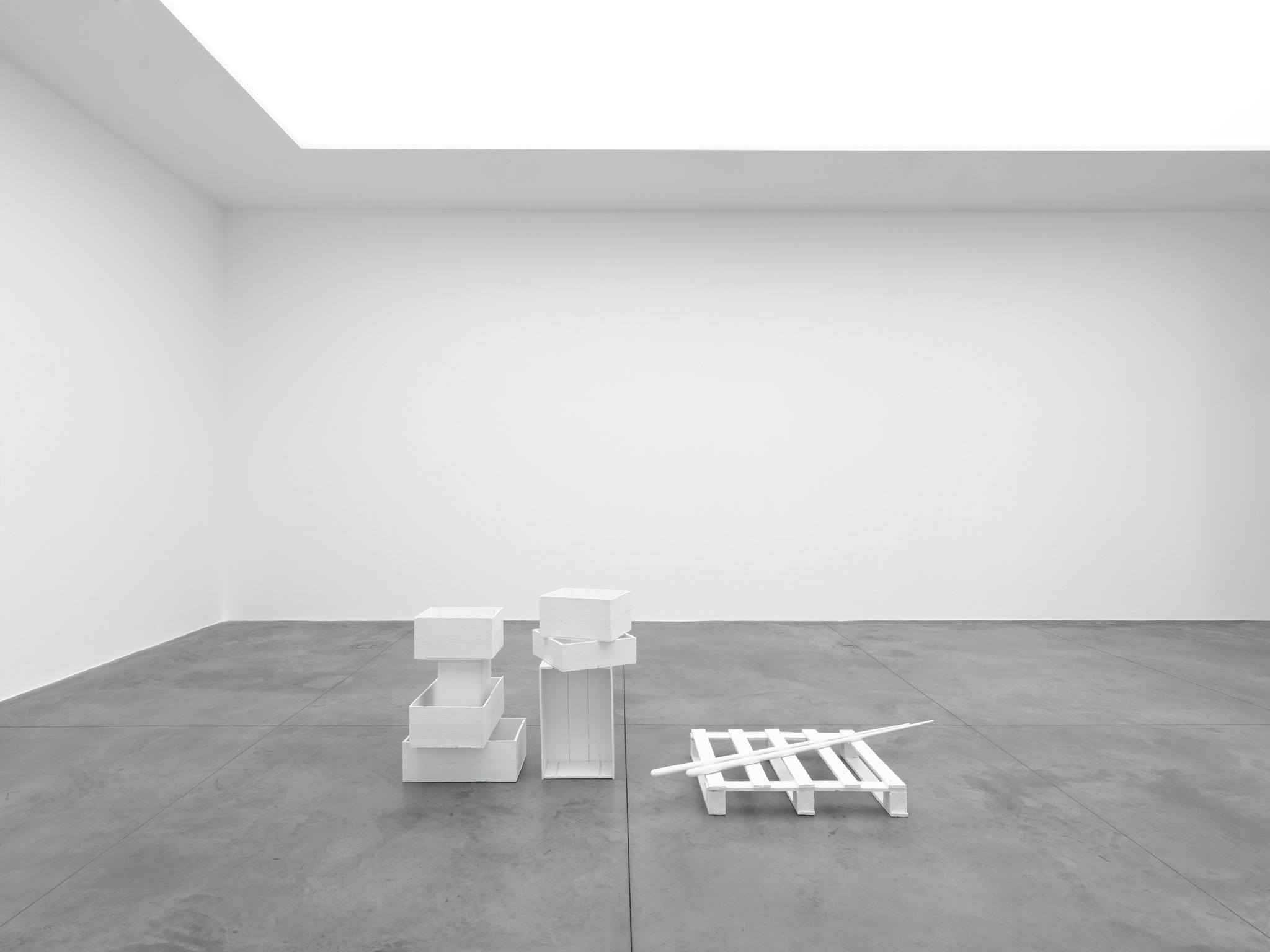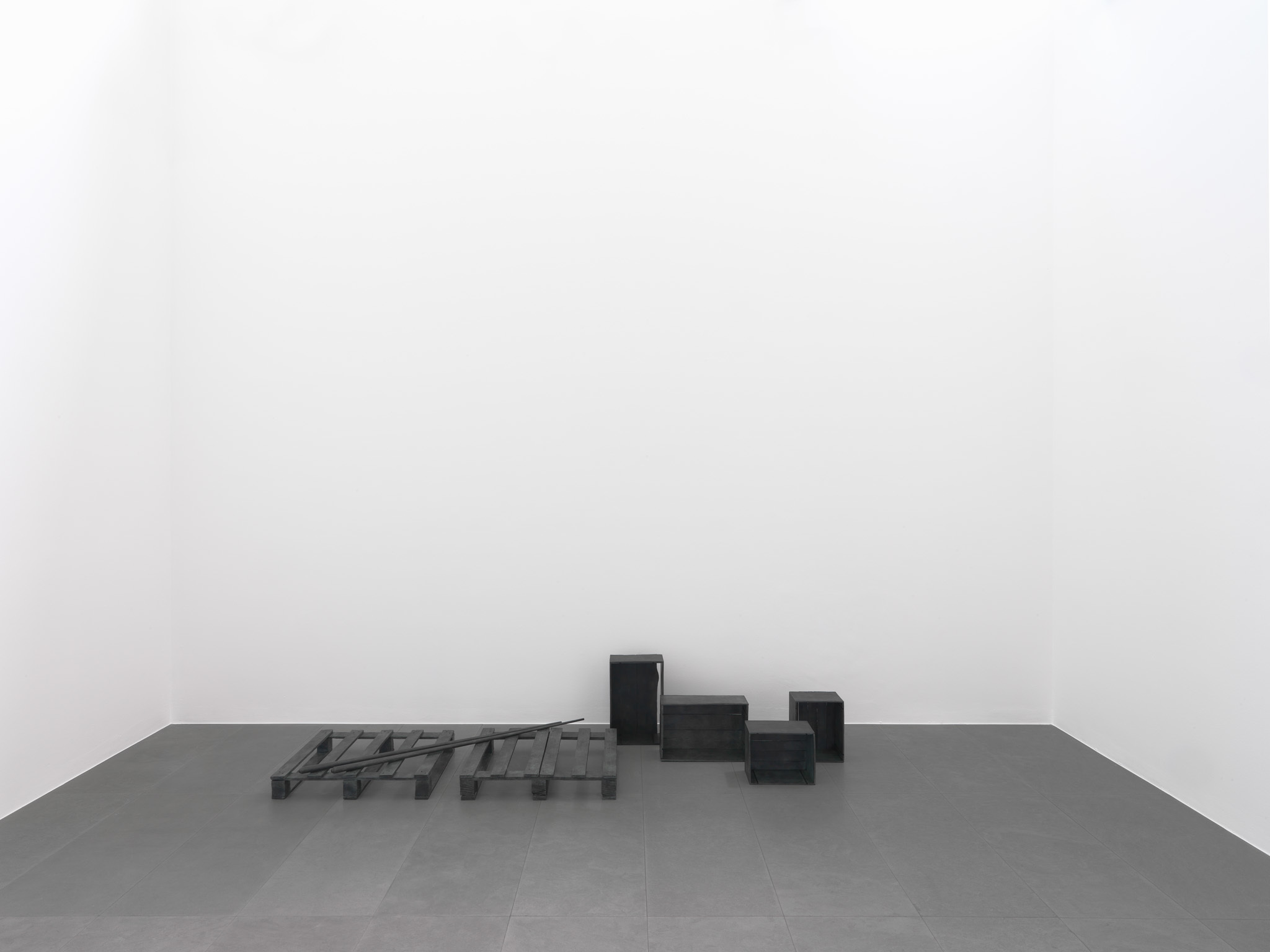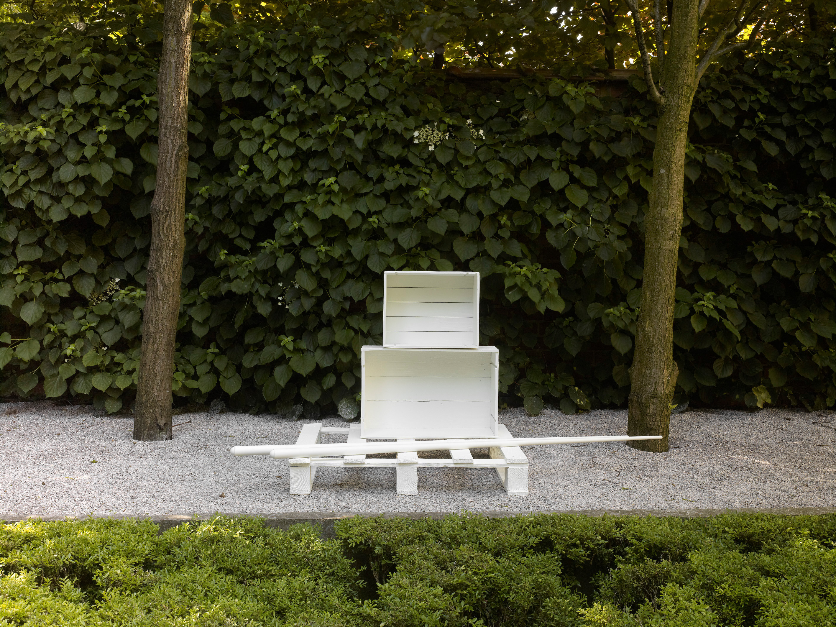 The works which Jan Vercruysse now exhibits, are part of a new series: Places [Lost]. How to initiate a first introduction, a narrative on these new works? A limited set of selected objects constitutes the base for the compositions of these works: a few wooden wine crates–of different shapes and dimensions, two wooden pallets and a pair of billiard cues. These objects are artefacts and they served a specific purpose; they have a “human” history. While a single wine crate, a single pallet or a single pair of billiard cues would be just that, it is in their combination—their compositions—that these objects transcend their primary physical characteristics: they become the remains of a journey, the silent keepers of “parts of lives”. In order to enhance the distance with these primary characteristics, the original artefacts are cast in bronze; these bronzes are thereafter painted with a chalklike white colour or sometimes patinated in the classic way. While the Places [Lost] acquire a sculptural quality—in fact, they even are sculptures—they are their own place.