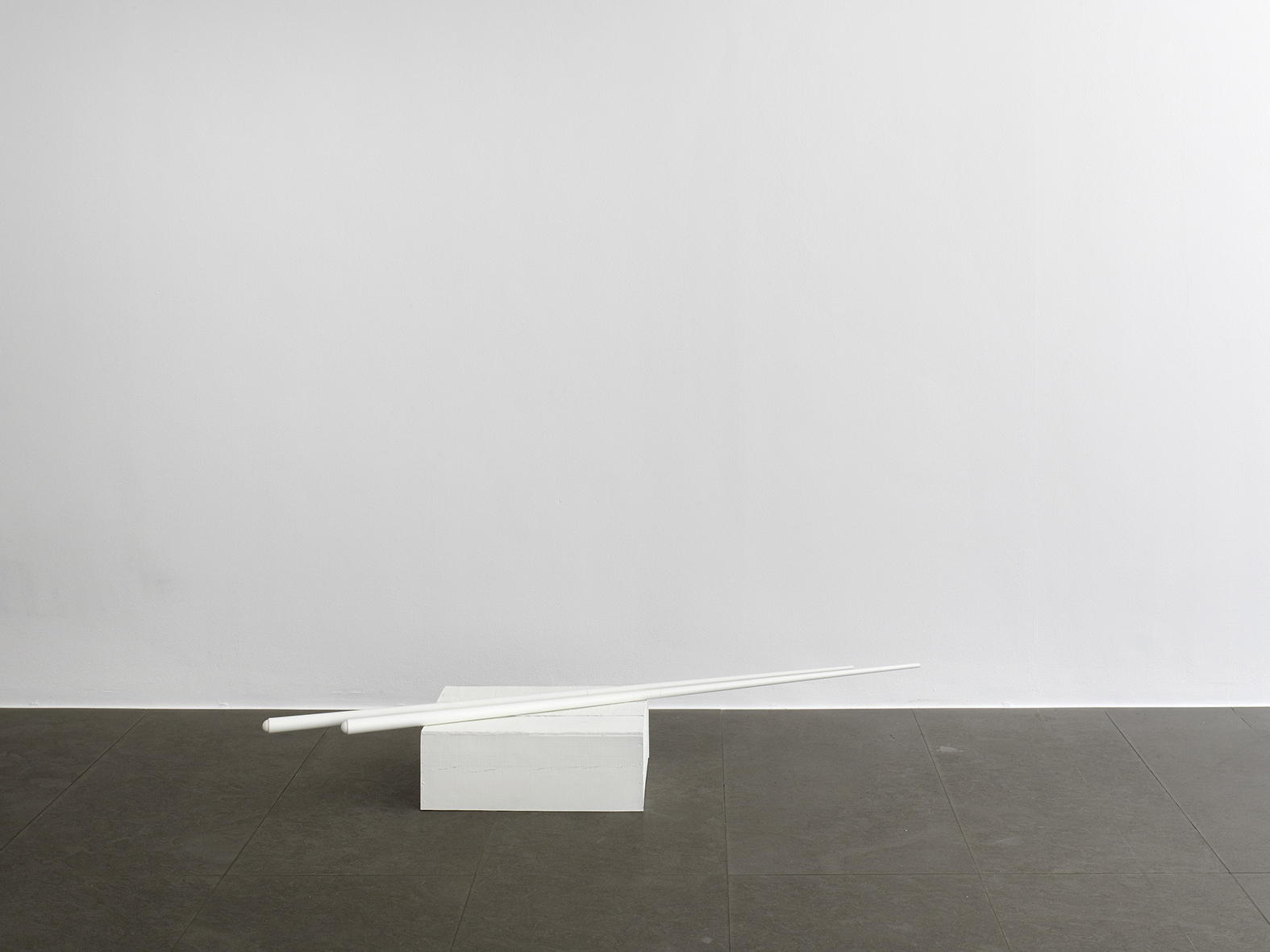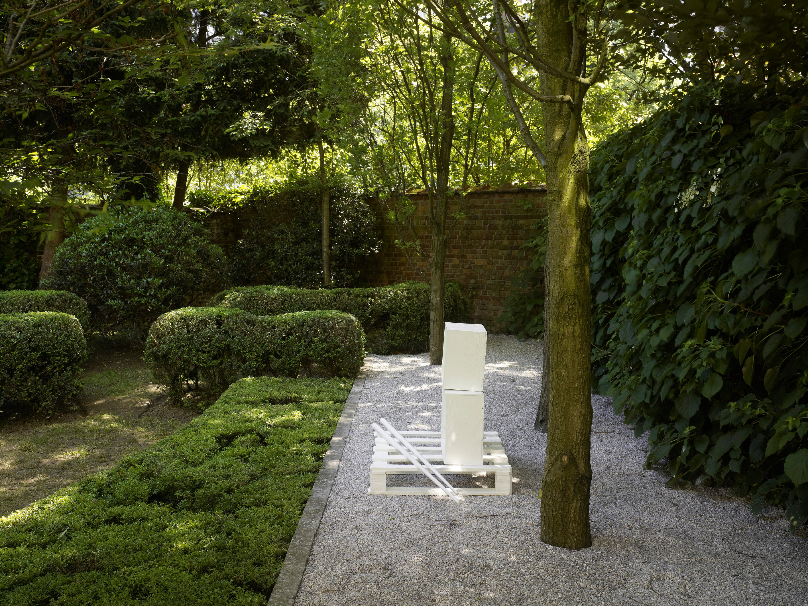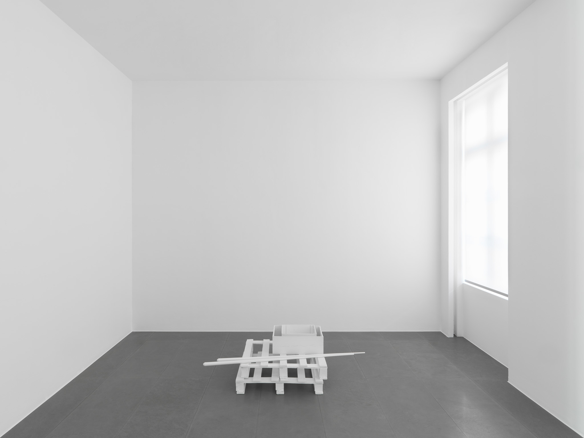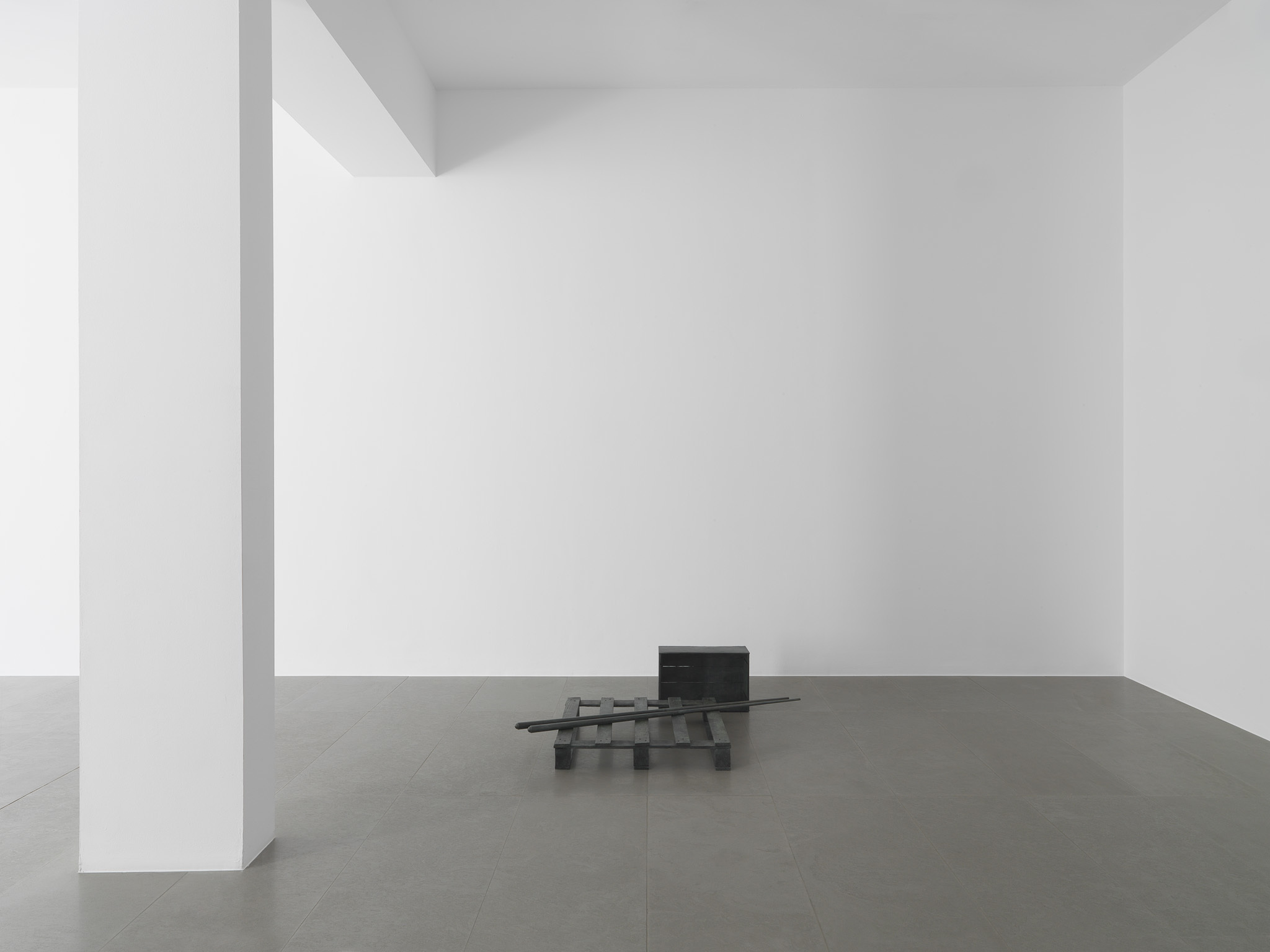 The works which Jan Vercruysse now exhibits, are part of a new series: Places [Lost]. How to initiate a first introduction, a narrative on these new works? A limited set of selected objects constitutes the base for the compositions of these works: a few wooden wine crates–of different shapes and dimensions, two wooden pallets and a pair of billiard cues. These objects are artefacts and they served a specific purpose; they have a “human” history. While a single wine crate, a single pallet or a single pair of billiard cues would be just that, it is in their combination—their compositions—that these objects transcend their primary physical characteristics: they become the remains of a journey, the silent keepers of “parts of lives”. In order to enhance the distance with these primary characteristics, the original artefacts are cast in bronze; these bronzes are thereafter painted with a chalklike white colour or sometimes patinated in the classic way. While the Places [Lost] acquire a sculptural quality—in fact, they even are sculptures—they are their own place.