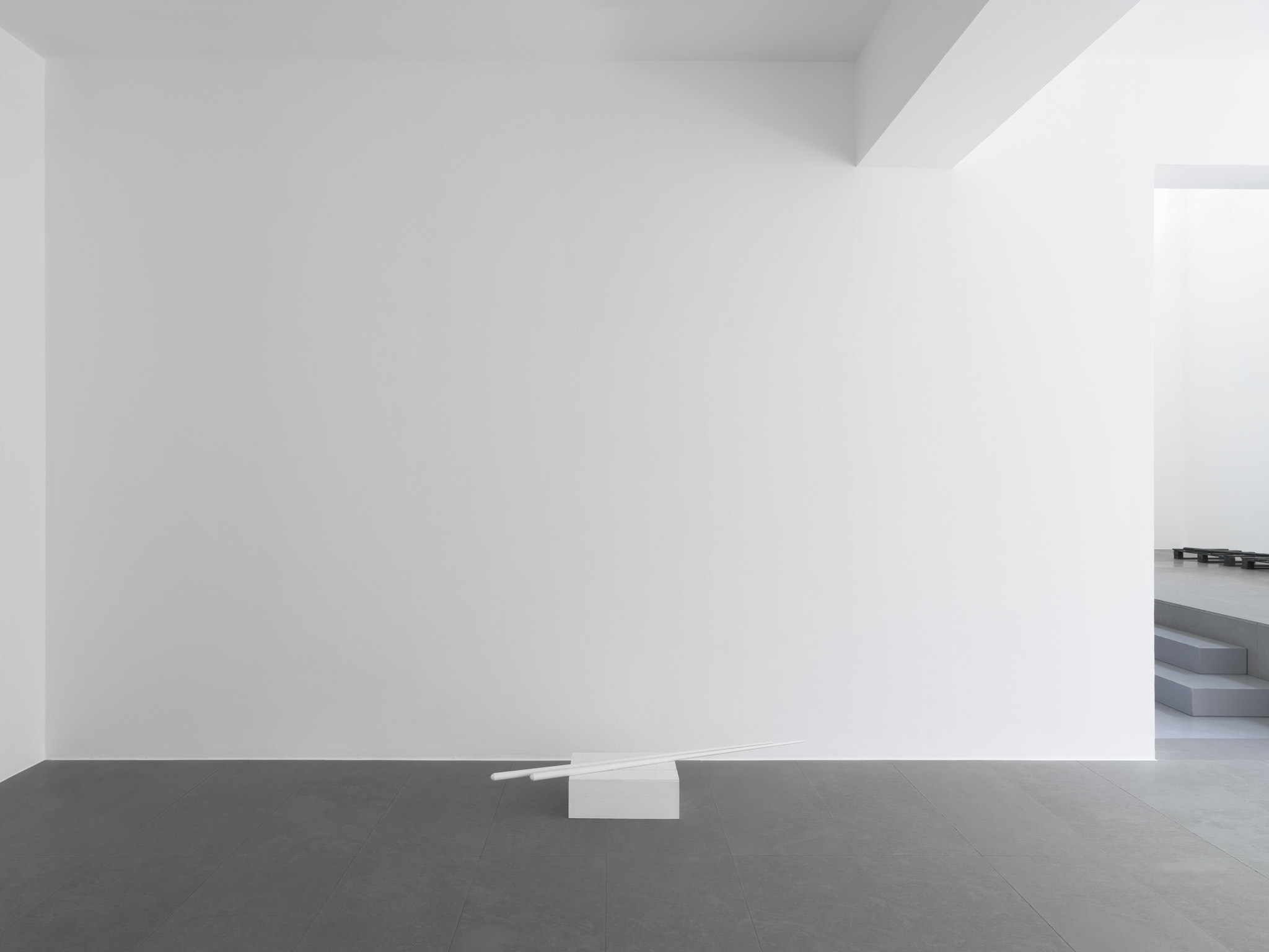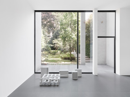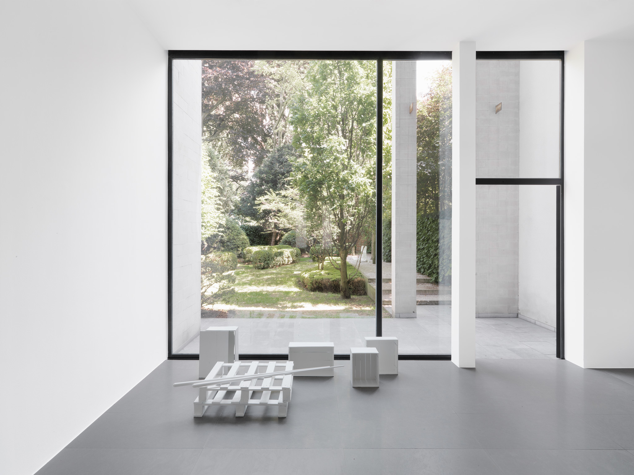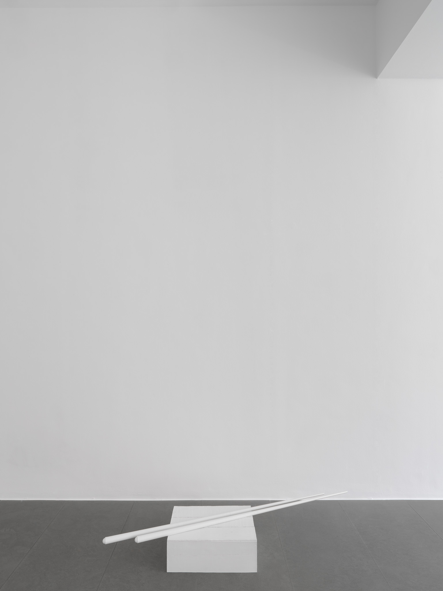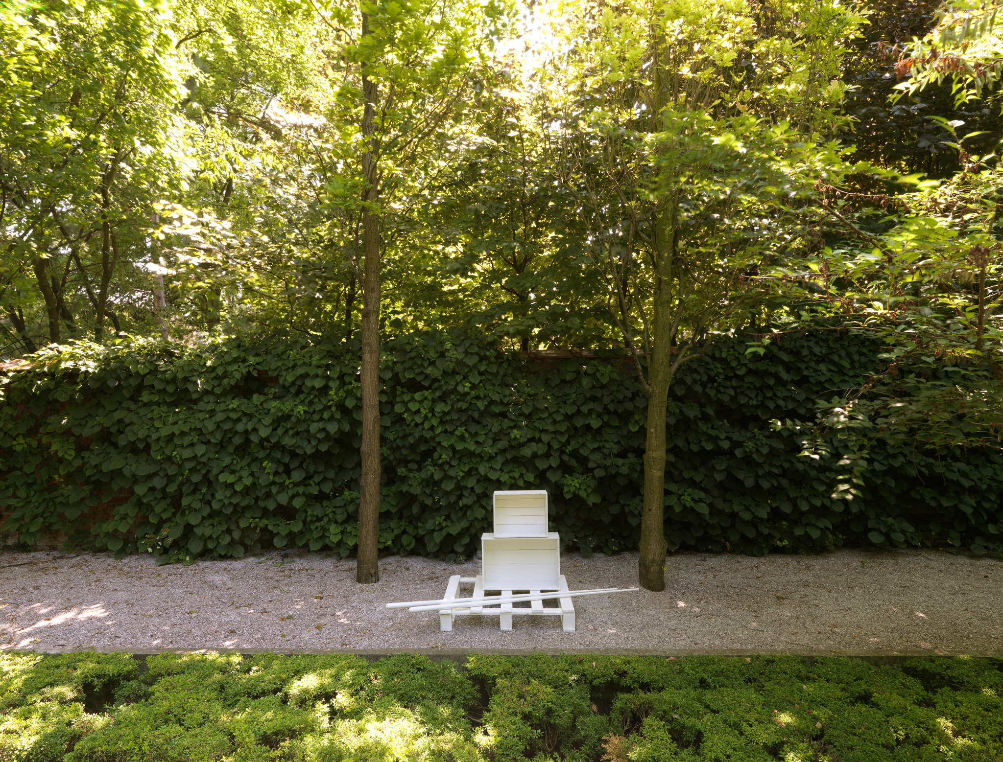 The works which Jan Vercruysse now exhibits, are part of a new series: Places [Lost]. How to initiate a first introduction, a narrative on these new works? A limited set of selected objects constitutes the base for the compositions of these works: a few wooden wine crates–of different shapes and dimensions, two wooden pallets and a pair of billiard cues. These objects are artefacts and they served a specific purpose; they have a “human” history. While a single wine crate, a single pallet or a single pair of billiard cues would be just that, it is in their combination—their compositions—that these objects transcend their primary physical characteristics: they become the remains of a journey, the silent keepers of “parts of lives”. In order to enhance the distance with these primary characteristics, the original artefacts are cast in bronze; these bronzes are thereafter painted with a chalklike white colour or sometimes patinated in the classic way. While the Places [Lost] acquire a sculptural quality—in fact, they even are sculptures—they are their own place.