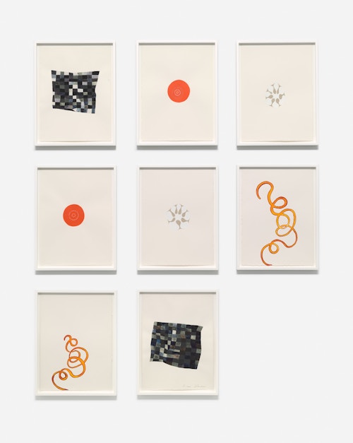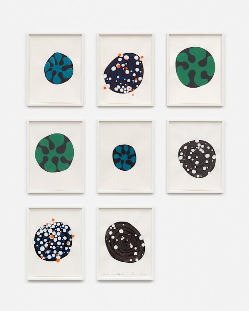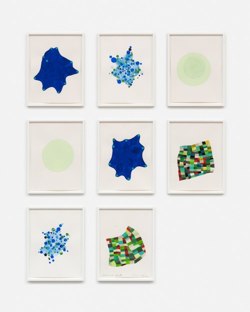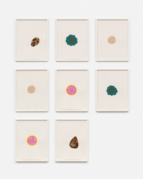 And while words are noticeably absent from the eight-part Frick and Fracks, all unique watercolours, both the series and its title allude to the idea of similarity and difference. The expression ‘frick frack’ has its origins in a Swiss comedy ice-skating partnership, Werner Groebli and Hans Mauch, whose stage names were Frick and Frack. Beginning in the 1930s, their association was so enduring (almost fifty years), and they were at one time so well known, that their names have entered the English language as slang for two people who are very close, practically inseparable, or sometimes indistinguishable. Horn’s vivid abstract shapes, placed side-by-side like upturned cards from a memory game, are non-identical pairs of pairs. In comparing and contrasting the forms, viewers become aware of the subtle correspondences and variances in the unique, hand-painted formations.