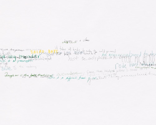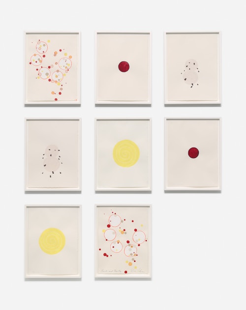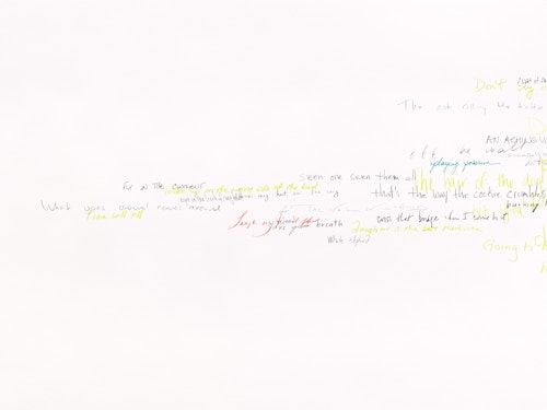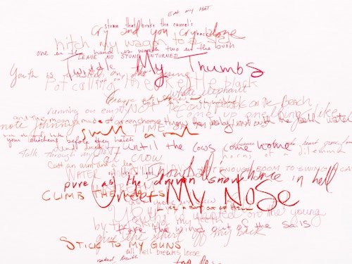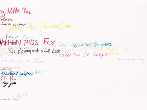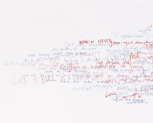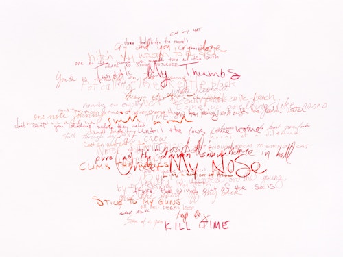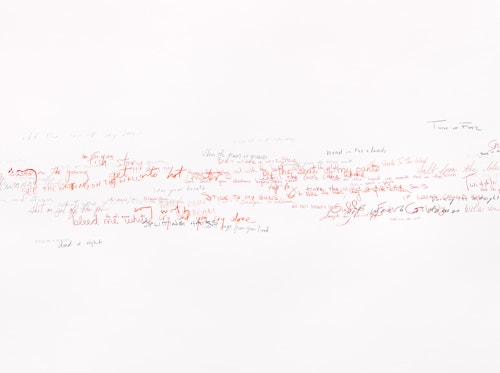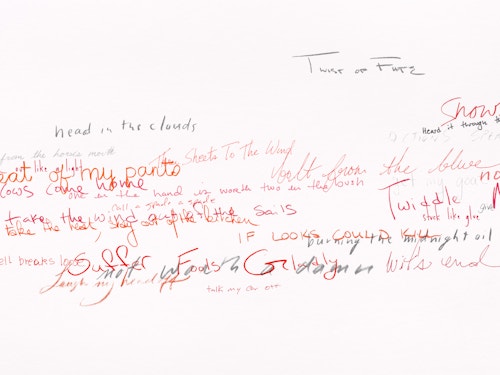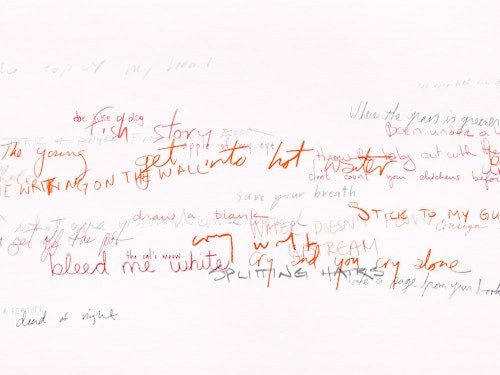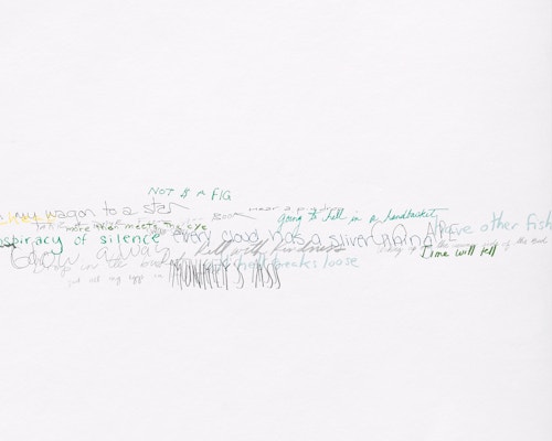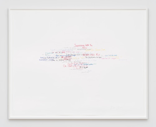 So reads the full title of the Red Figure (2022) suite, one of three new bodies of work that American artist Roni Horn is presenting in her fifth exhibition at the gallery. The presentation, which also includes Wits’ End Mash (2019) and Frick and Fracks (2018/2022), emphasises the primacy of drawing in the artist’s practice and highlights the new directions in which she is taking the medium. Clouds of handwritten idiomatic expressions (Wits’ End Mash) and a log (Red Figure) — in which the artist records the passage of time through enigmatic juxtapositions of words and images — testify to a broadening and deepening of Horn’s fascination with language, identity and meaning. These ensembles are accompanied by a series of abstract, eight-part watercolours — the Frick and Fracks — wherein Horn explores the concepts of similarity and difference.
