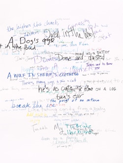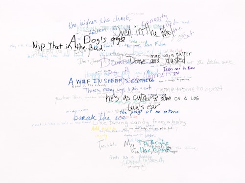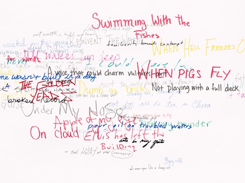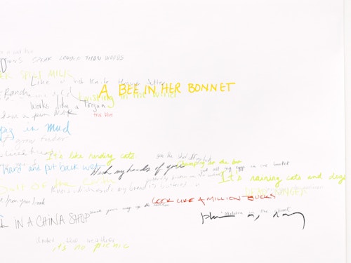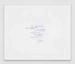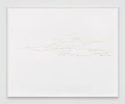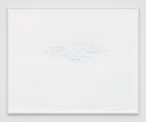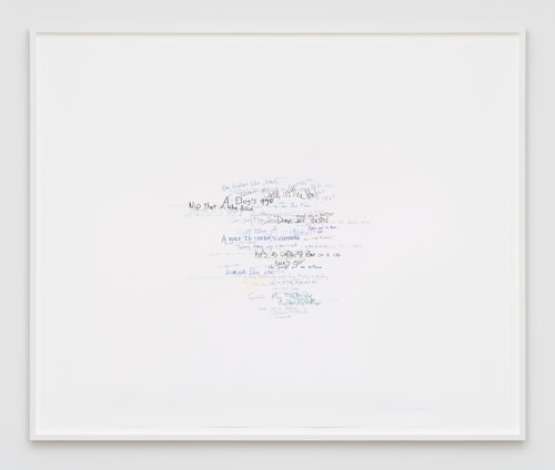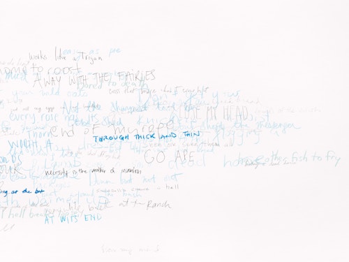 Roni Horn has been creating innovative and technically complex works on paper for almost four decades. Describing drawing as her ‘primary activity’ and ‘a kind of breathing activity on a daily level’, it is the only medium that she has consistently worked in throughout her extensive career. In the Wits’ End Mash series, displayed on the ground floor, the artist explores the complexities and ambiguities of language through handwritten idioms, clichés, and colloquialisms. ‘Away with the fairies’, ‘laugh my head off’ and ‘fly in the ointment’ are just a few of the peculiar yet recognisable phrases that she takes as source material. Horn asked 300 people to each commit five such vernacular phrases to paper, which she subsequently made into individual silkscreens. In Wits’ End Sampler, shown at the Menil Collection in Houston (2018-19), the artist screen-printed the phrases directly onto the gallery walls. In this new iteration of the work, clusters of 75 to 350 idioms converge in dense, cloud-like formations. Each phrase is individually printed in a complex and layered process. Superimposed and overlapping, the words are sometimes legible, at other times indecipherable. Idioms, by definition, are phrases whose sense cannot be ascertained from the individual meanings of the constituent words: ‘up in the air’ means ‘undecided’, for example. This shift from recognition to incomprehension in Wits’ End Mash, as well as from readability to illegibility, gives charged visual expression to the ambiguities and vagaries of written and verbal communication.