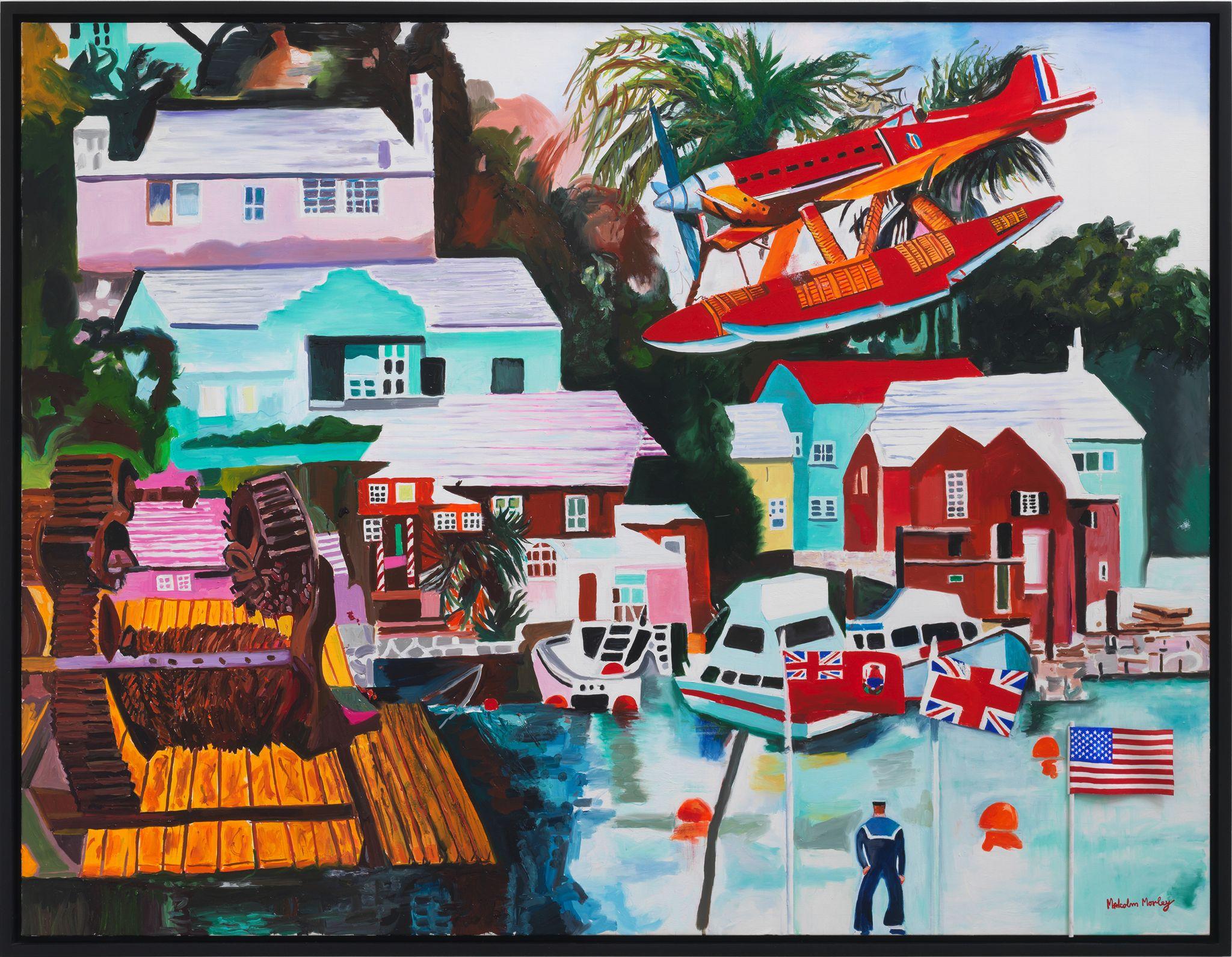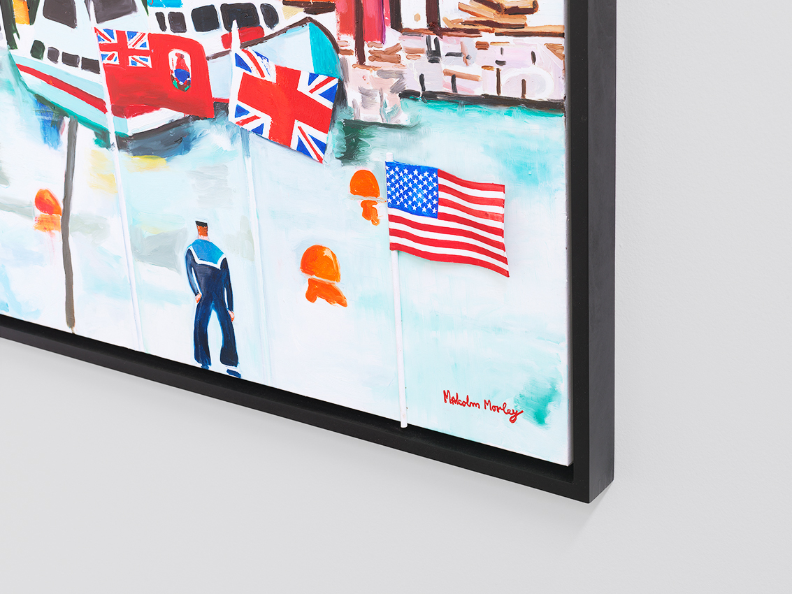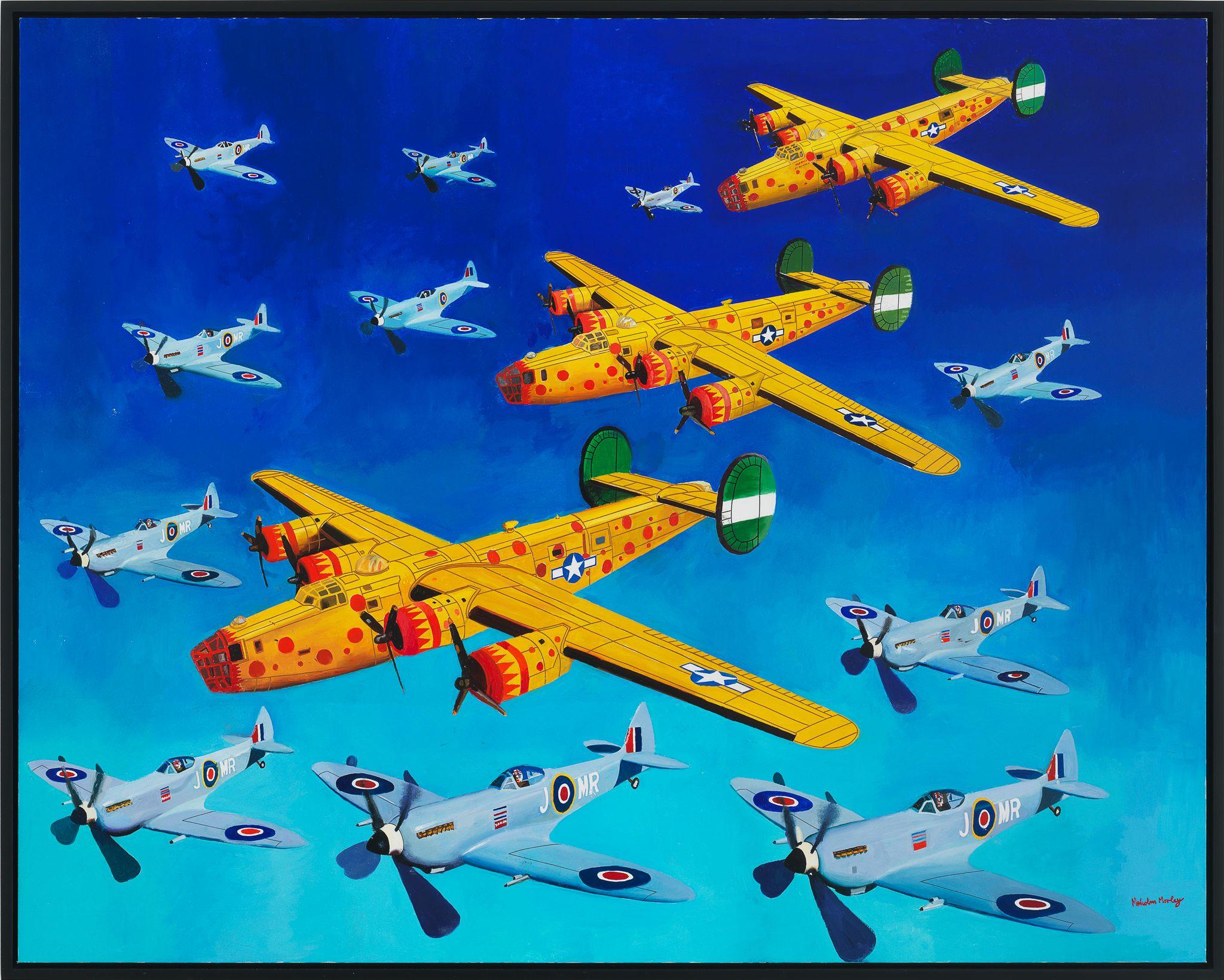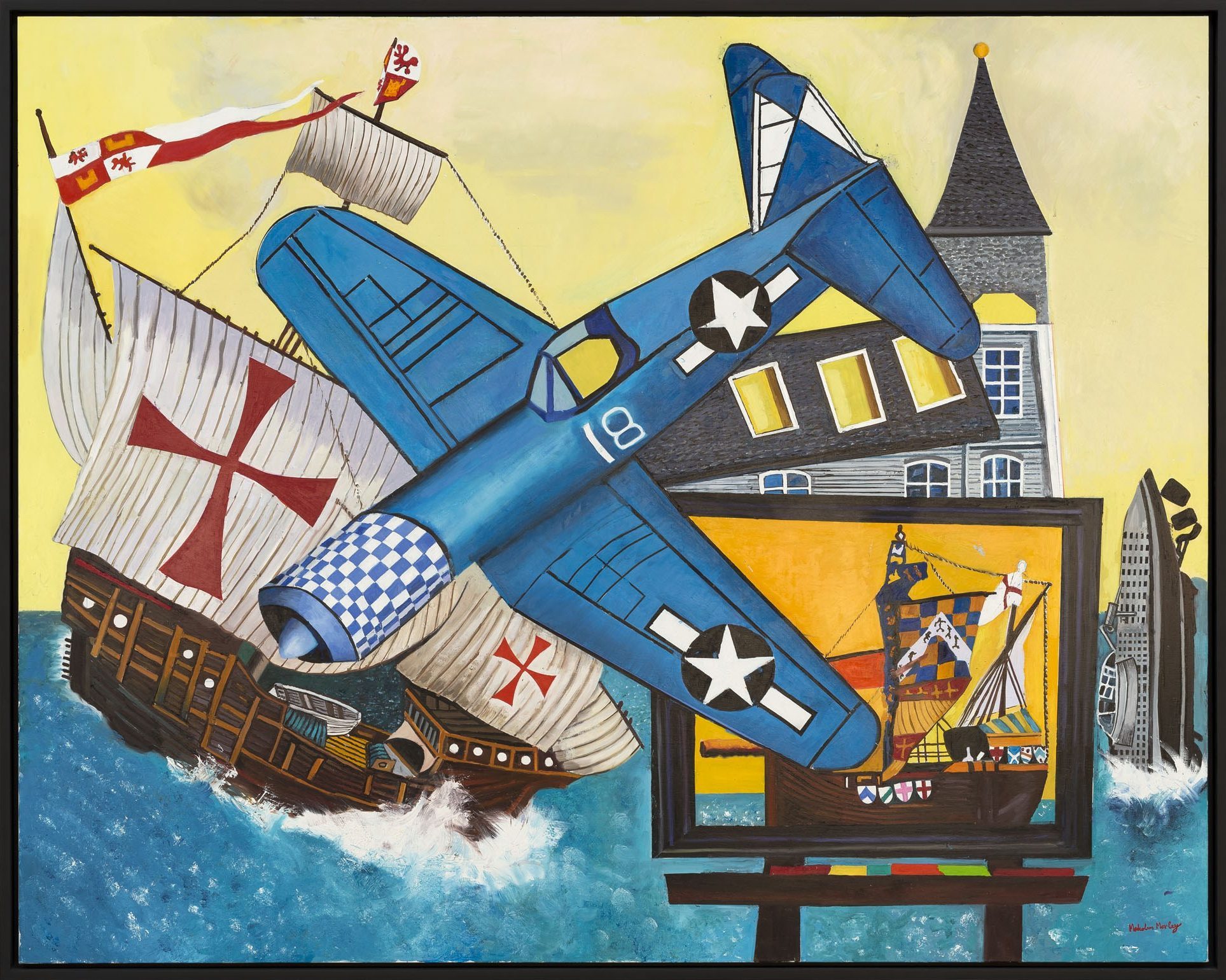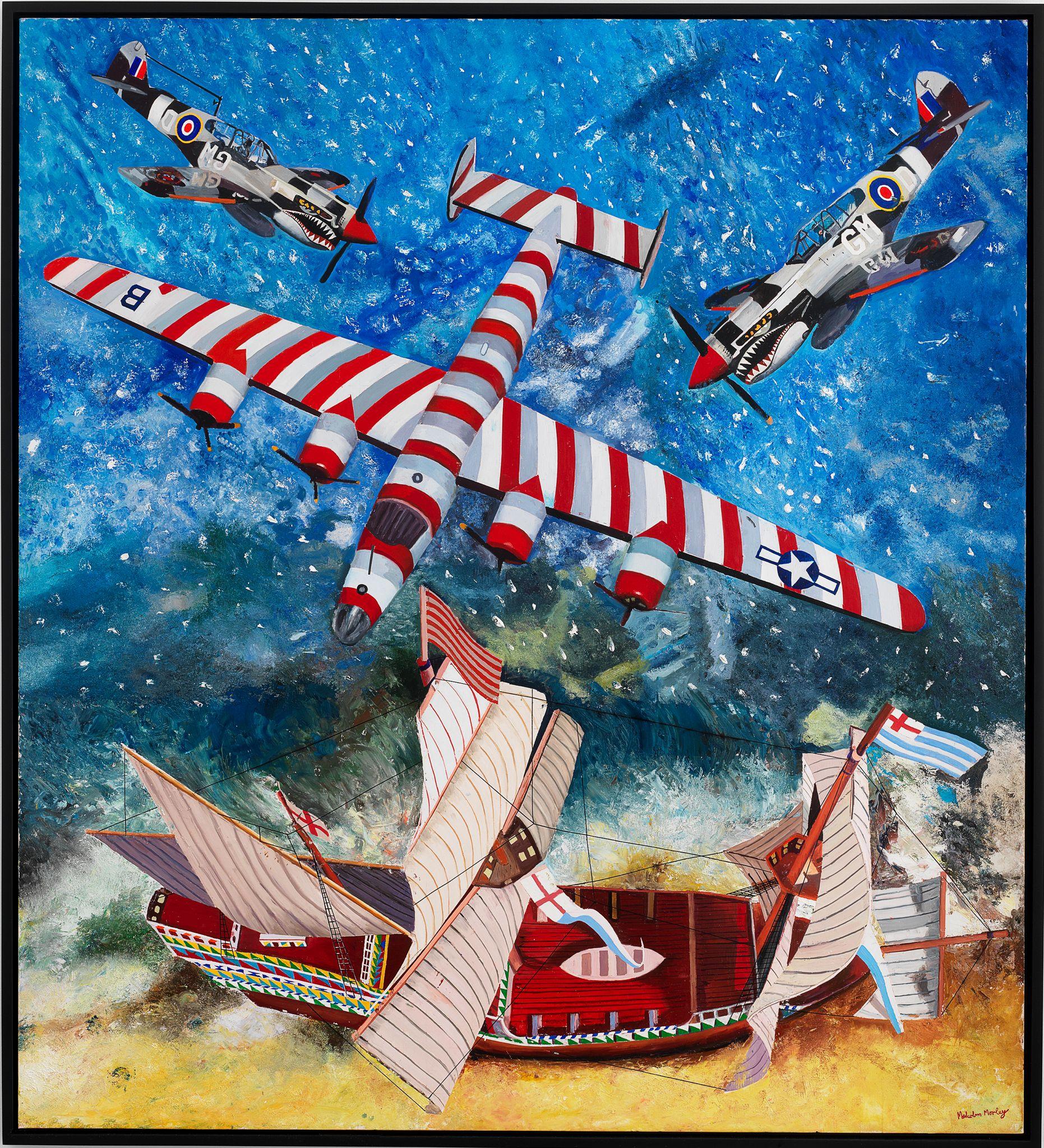 In these recent works, Morley combines his signature subjects – ships and old airplanes, advertising images, the Second World War, England, and British and American history – with the epic themes of discoveries (of Bermuda, a British overseas territory, and America) and disasters (most notably shipwrecks). Corsair and Santa Maria (2011), for example, combines the image of a Corsair fighter aircraft (a type that saw service in World War II and the Korean War) with one of La Santa Maria, the largest of the three ships sailed by Columbus on his first voyage to the New World – and which was shipwrecked on Christmas Day, 1492.