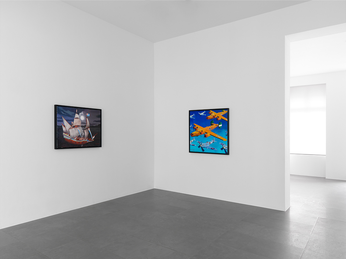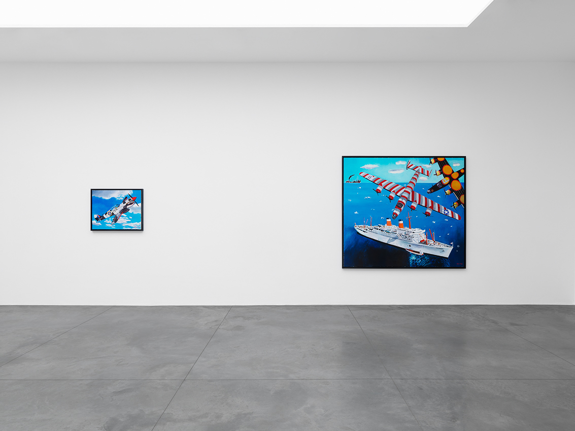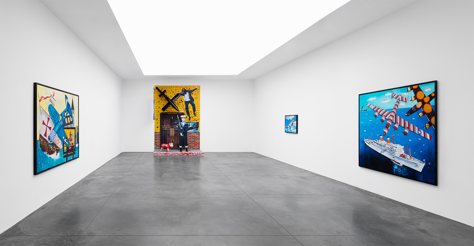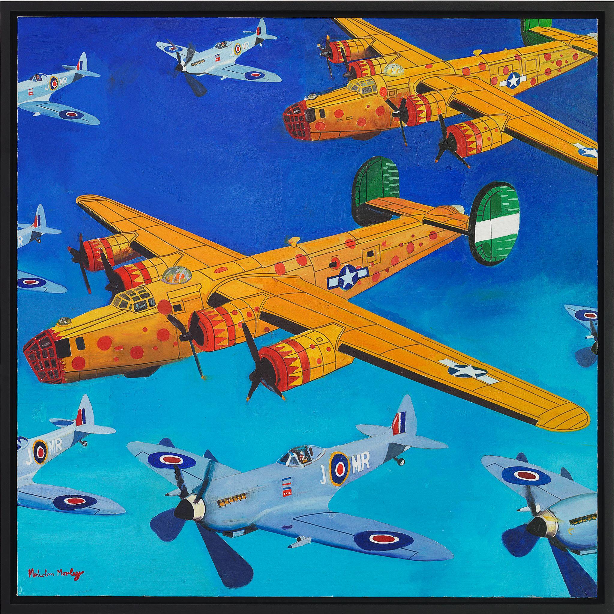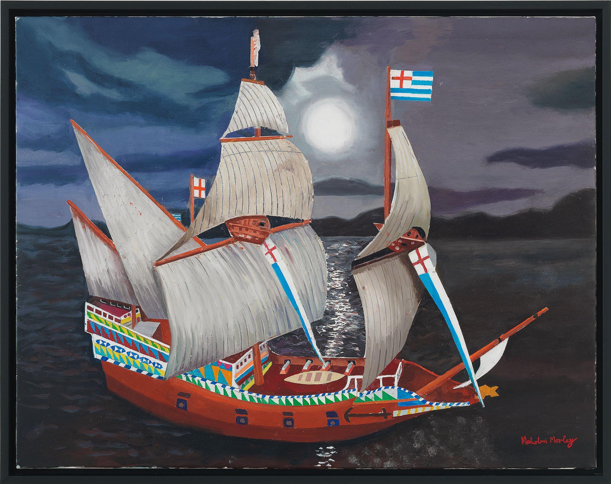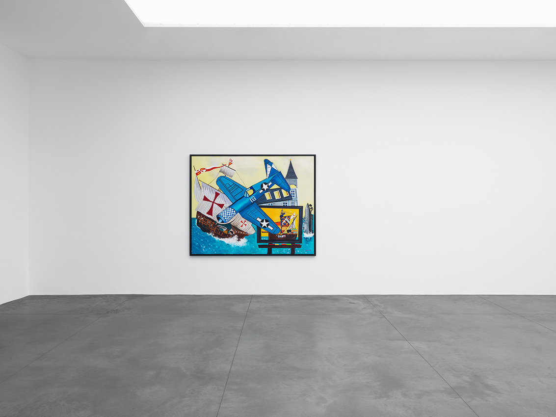 In these recent works, Morley combines his signature subjects – ships and old airplanes, advertising images, the Second World War, England, and British and American history – with the epic themes of discoveries (of Bermuda, a British overseas territory, and America) and disasters (most notably shipwrecks). Corsair and Santa Maria (2011), for example, combines the image of a Corsair fighter aircraft (a type that saw service in World War II and the Korean War) with one of La Santa Maria, the largest of the three ships sailed by Columbus on his first voyage to the New World – and which was shipwrecked on Christmas Day, 1492.