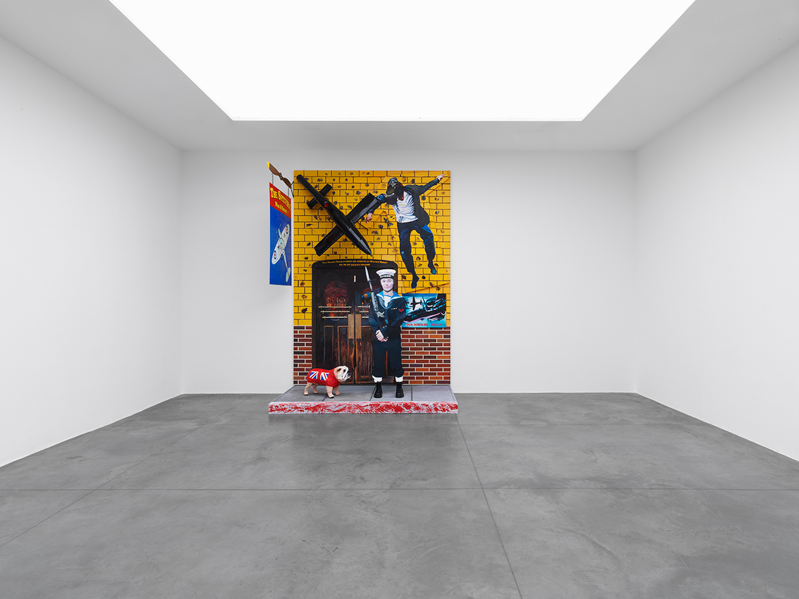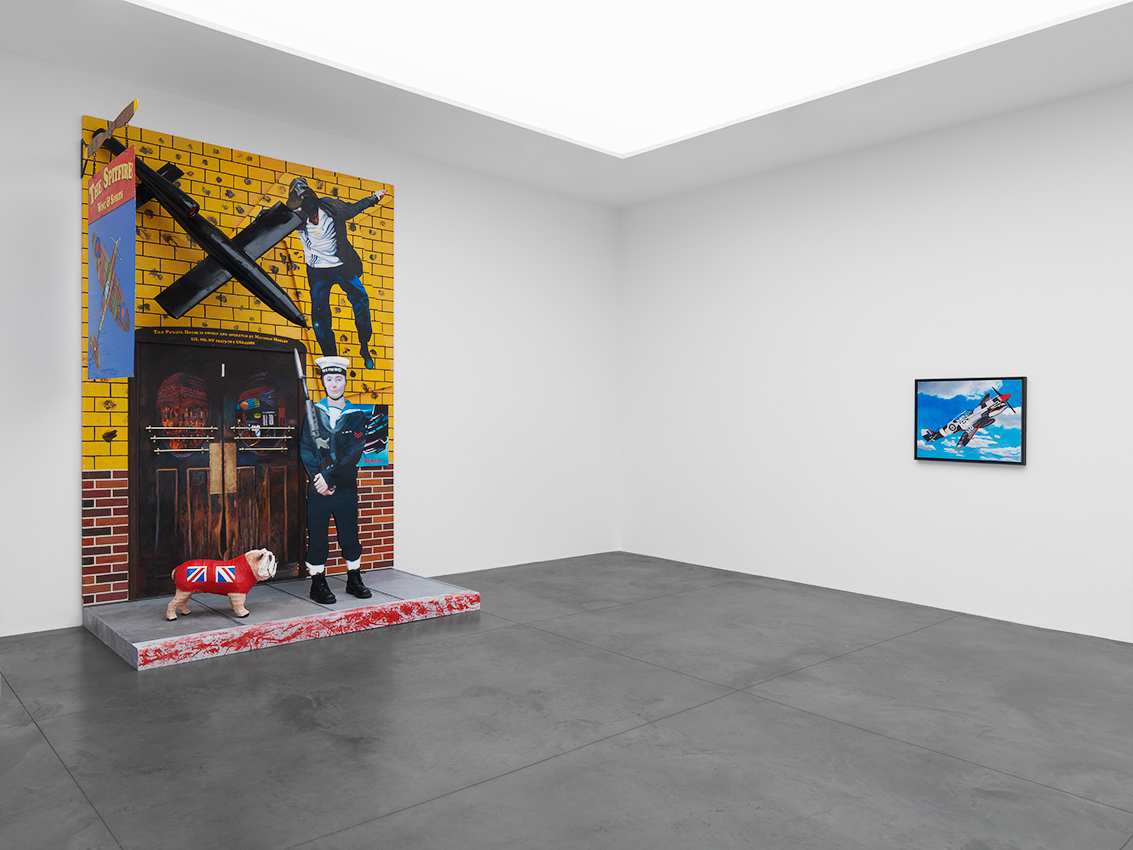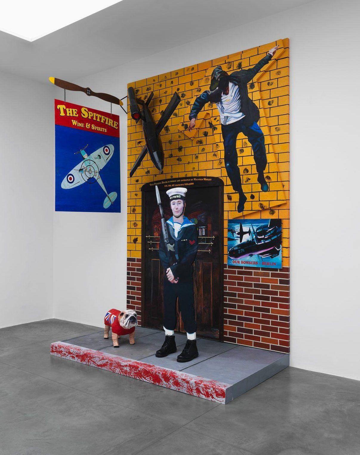Morley, who grew up in the midst of World War II, and is an avid reader of historical books about the period, has vivid memories of the Blitz that destroyed his childhood home. The war is a recurrent theme in his oeuvre and the artist returns to it once more in the striking painting-installation entitled The Spitfire (2012). The work takes its name from Morley’s hand-painted, double-sided pub ‘sign’ that hangs perpendicular to a large painting of the ‘Spitfire pub’ itself. Morley is particularly interested in the fact that when viewers stand in front of the pub sign, it is reduced to a black line and seems to disappear. He also had a friend shoot through the ‘sign’ with a gun. Other typically British elements include the painted cut out of a naval officer and the bulldog with the British flag, which refer to the Royal Navy and Winston Churchill. Juxtaposed with these is the image of the young Palestinian man jumping over the wall. This figure derives from an earlier painting, Wall Jumpers (2002), the source of which was a media image showing Palestinians scrambling over the separation barrier built by Israel in the occupied territories. The Spitfire is a world in which the personal and public collide.