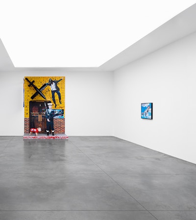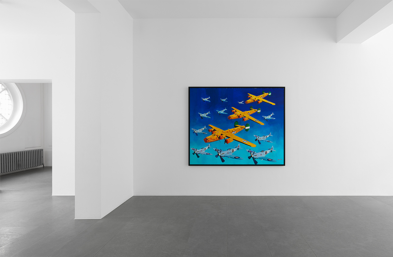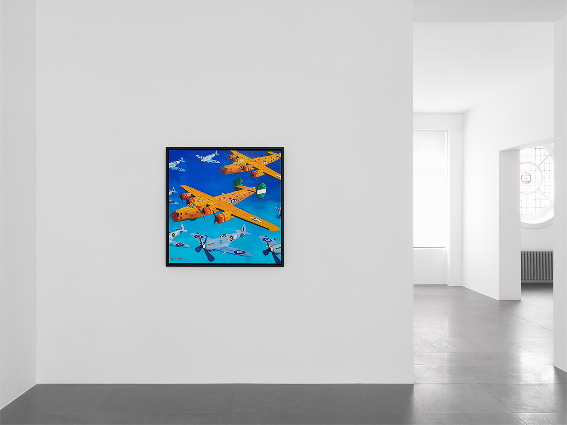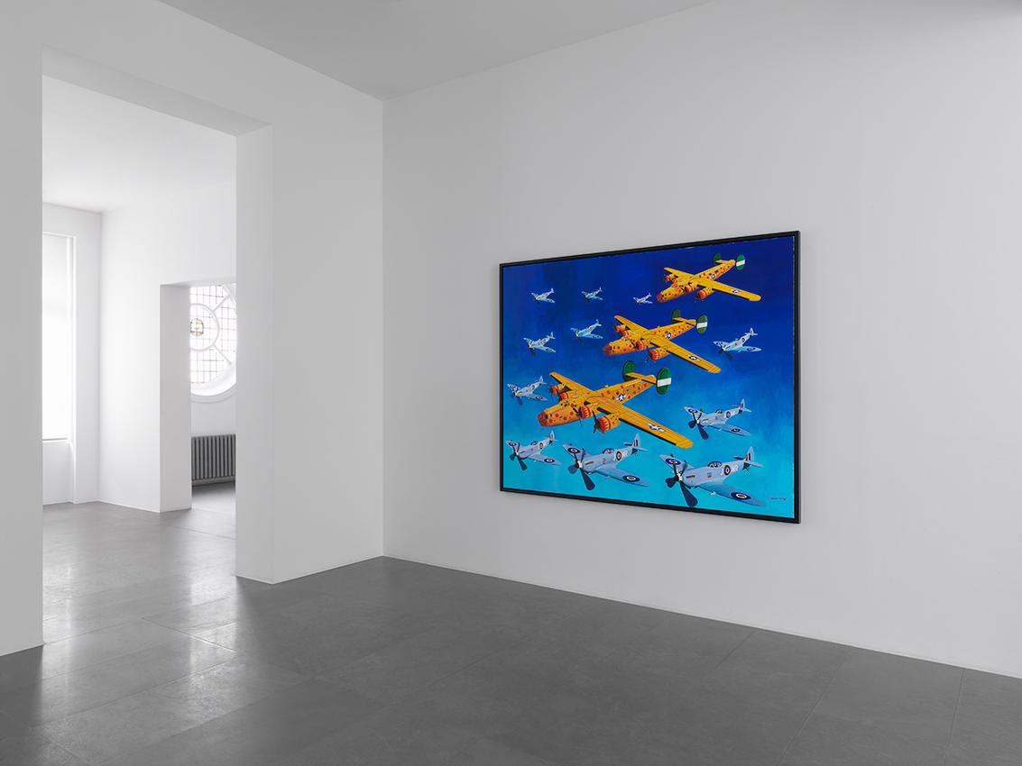 Morley, who grew up in the midst of World War II, and is an avid reader of historical books about the period, has vivid memories of the Blitz that destroyed his childhood home. The war is a recurrent theme in his oeuvre and the artist returns to it once more in the striking painting-installation entitled The Spitfire (2012). The work takes its name from Morley’s hand-painted, double-sided pub ‘sign’ that hangs perpendicular to a large painting of the ‘Spitfire pub’ itself. Morley is particularly interested in the fact that when viewers stand in front of the pub sign, it is reduced to a black line and seems to disappear. He also had a friend shoot through the ‘sign’ with a gun. Other typically British elements include the painted cut out of a naval officer and the bulldog with the British flag, which refer to the Royal Navy and Winston Churchill. Juxtaposed with these is the image of the young Palestinian man jumping over the wall. This figure derives from an earlier painting, Wall Jumpers (2002), the source of which was a media image showing Palestinians scrambling over the separation barrier built by Israel in the occupied territories. The Spitfire is a world in which the personal and public collide.