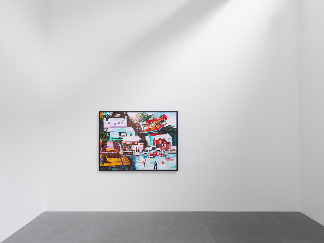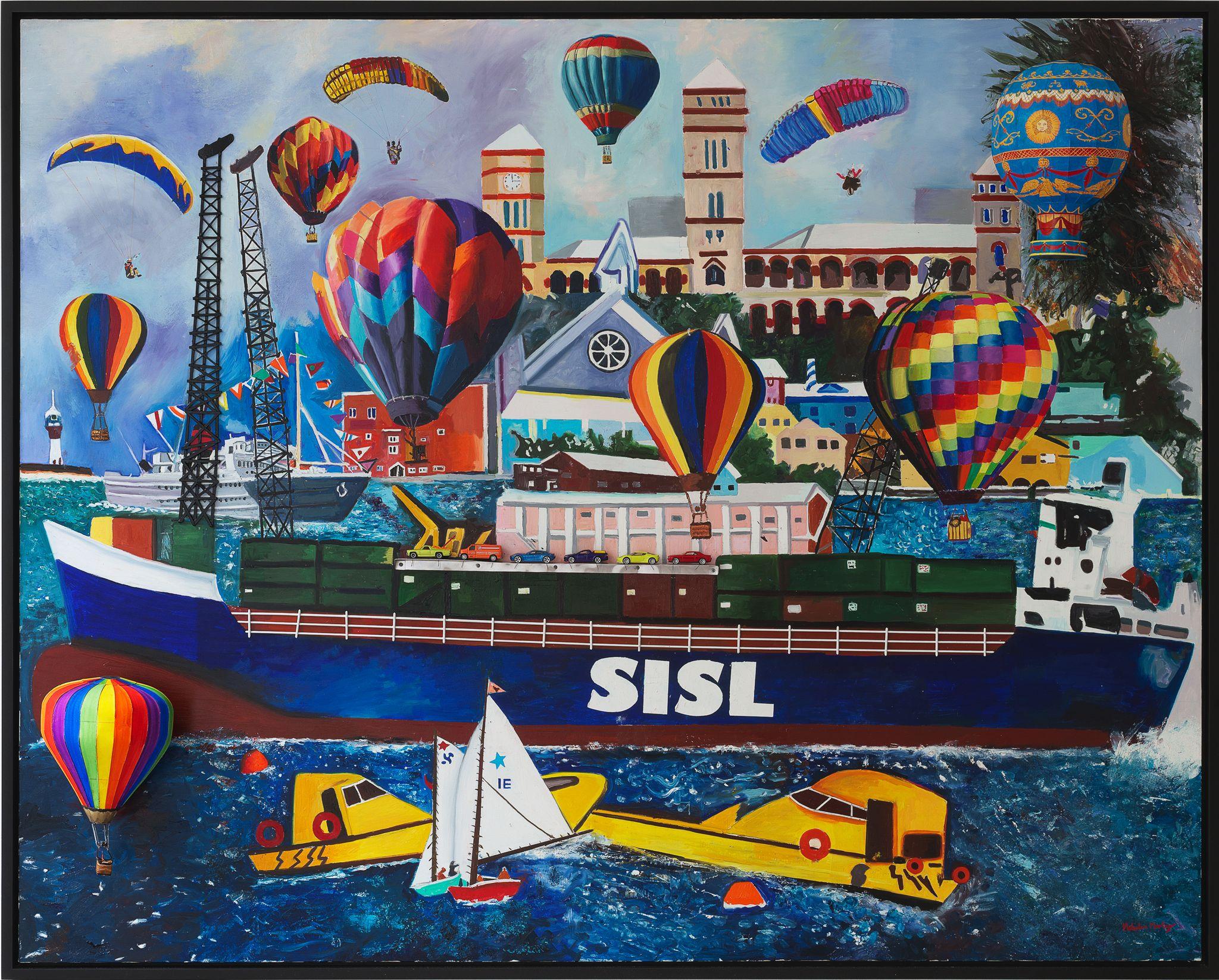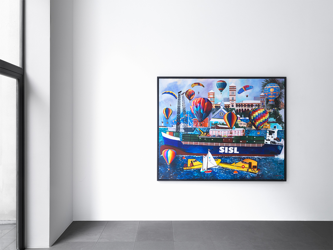 Bermuda, which features in several works in the exhibition, was colonised as the result of a shipwreck. In 1609, British Admiral Sir George Somers steered his ship to safety there during a ferocious storm. The island’s past resurfaces in Balloons Over Hamilton (2012), which depicts a scene in the capital of Bermuda. The work shows the historic Sessions House (built in 1817), the interior layout of which is identical to the Houses of Parliament in London, and a boat painted with the letters ‘SISL’, is a reference to Somers Isles Shipping Ltd (a modern-day Bermudian freight shipping company named after Admiral Somers).