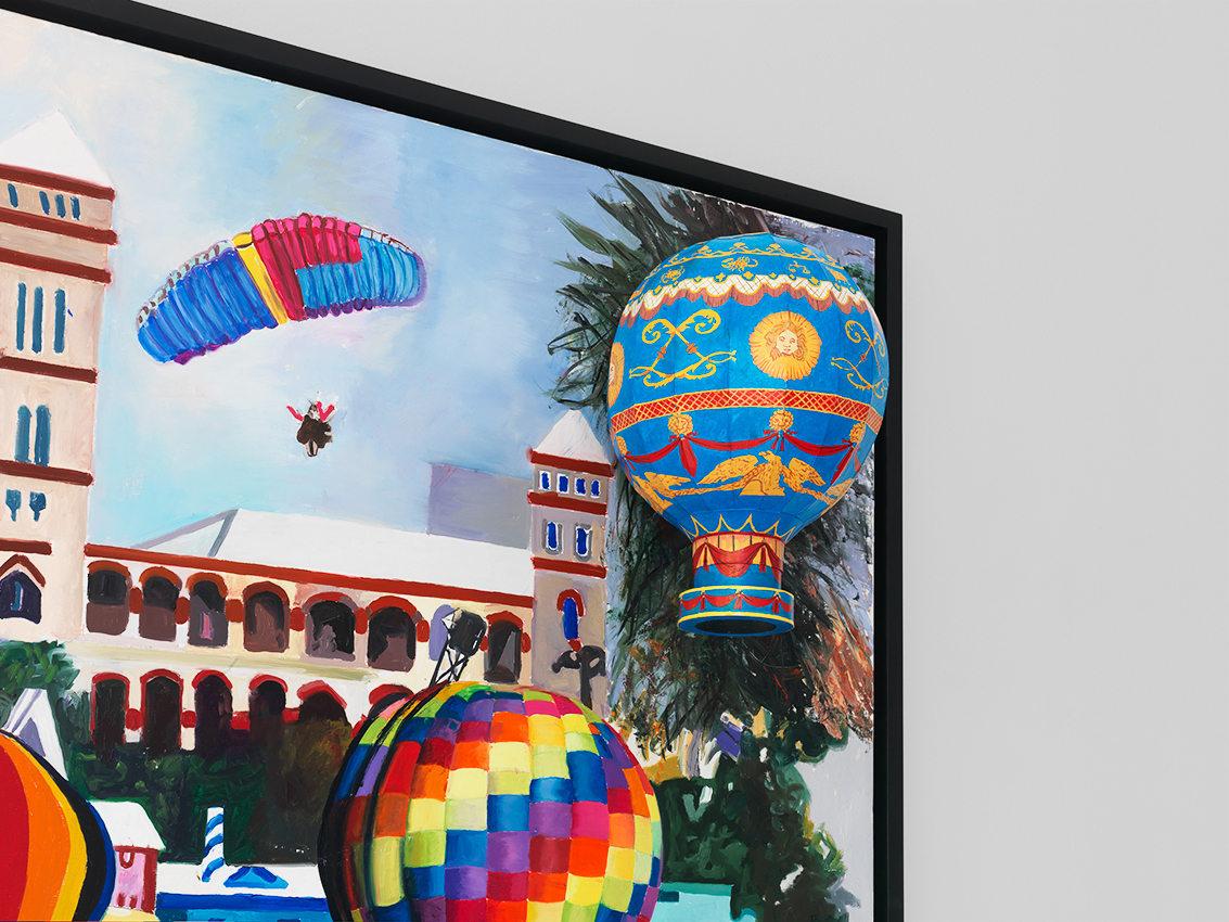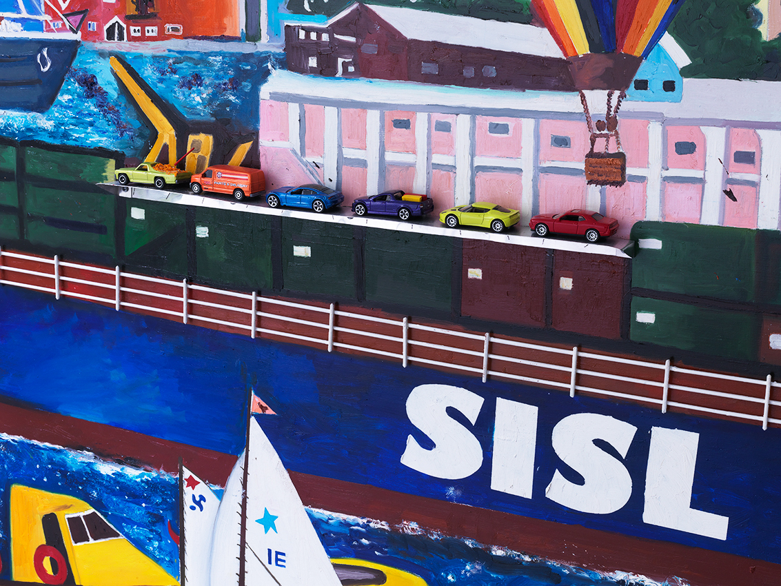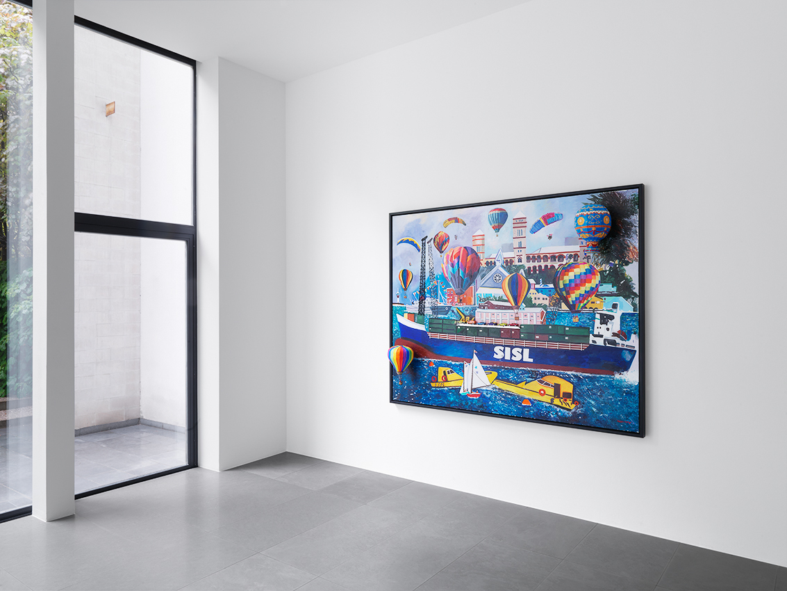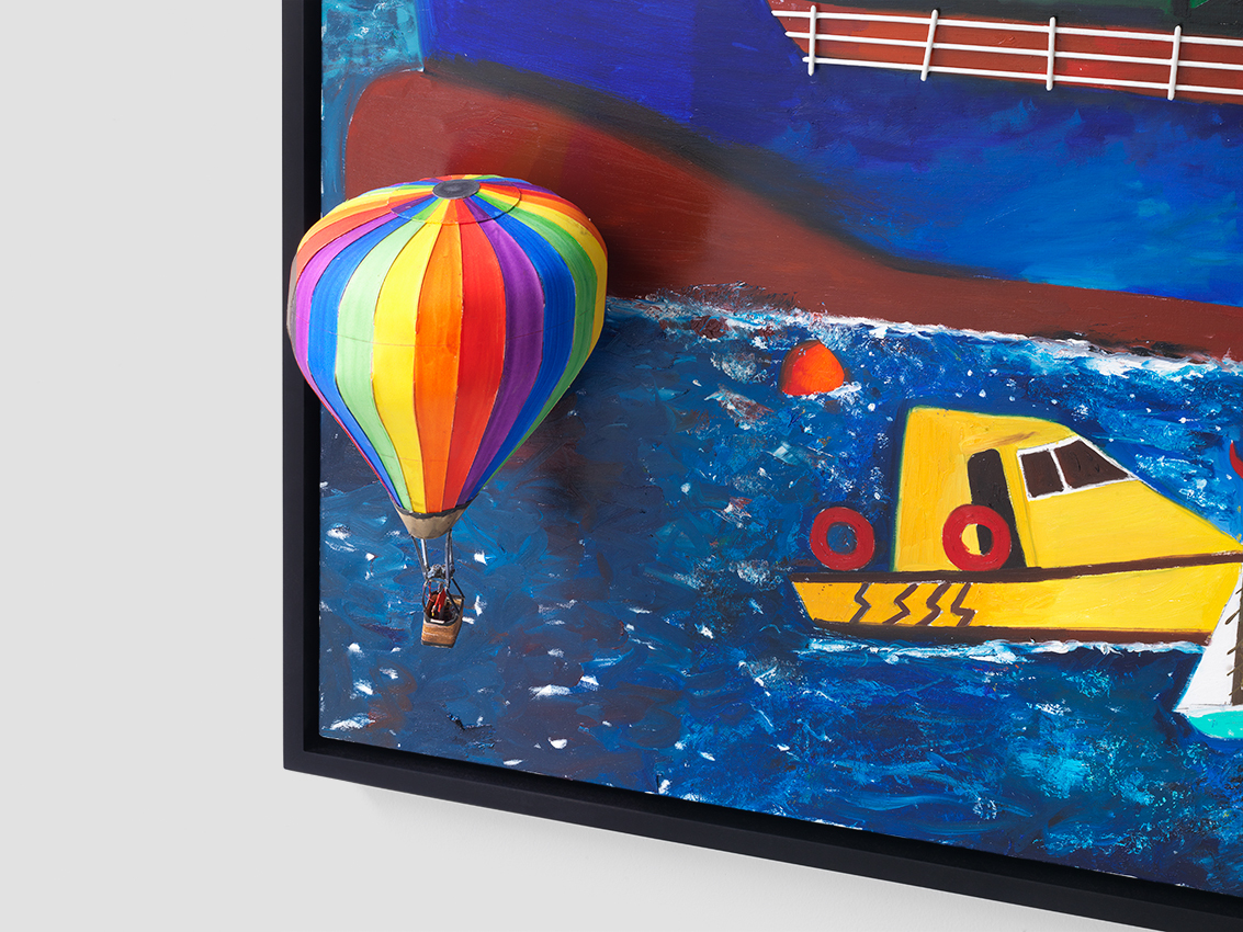 Bermuda, which features in several works in the exhibition, was colonised as the result of a shipwreck. In 1609, British Admiral Sir George Somers steered his ship to safety there during a ferocious storm. The island’s past resurfaces in Balloons Over Hamilton (2012), which depicts a scene in the capital of Bermuda. The work shows the historic Sessions House (built in 1817), the interior layout of which is identical to the Houses of Parliament in London, and a boat painted with the letters ‘SISL’, is a reference to Somers Isles Shipping Ltd (a modern-day Bermudian freight shipping company named after Admiral Somers).