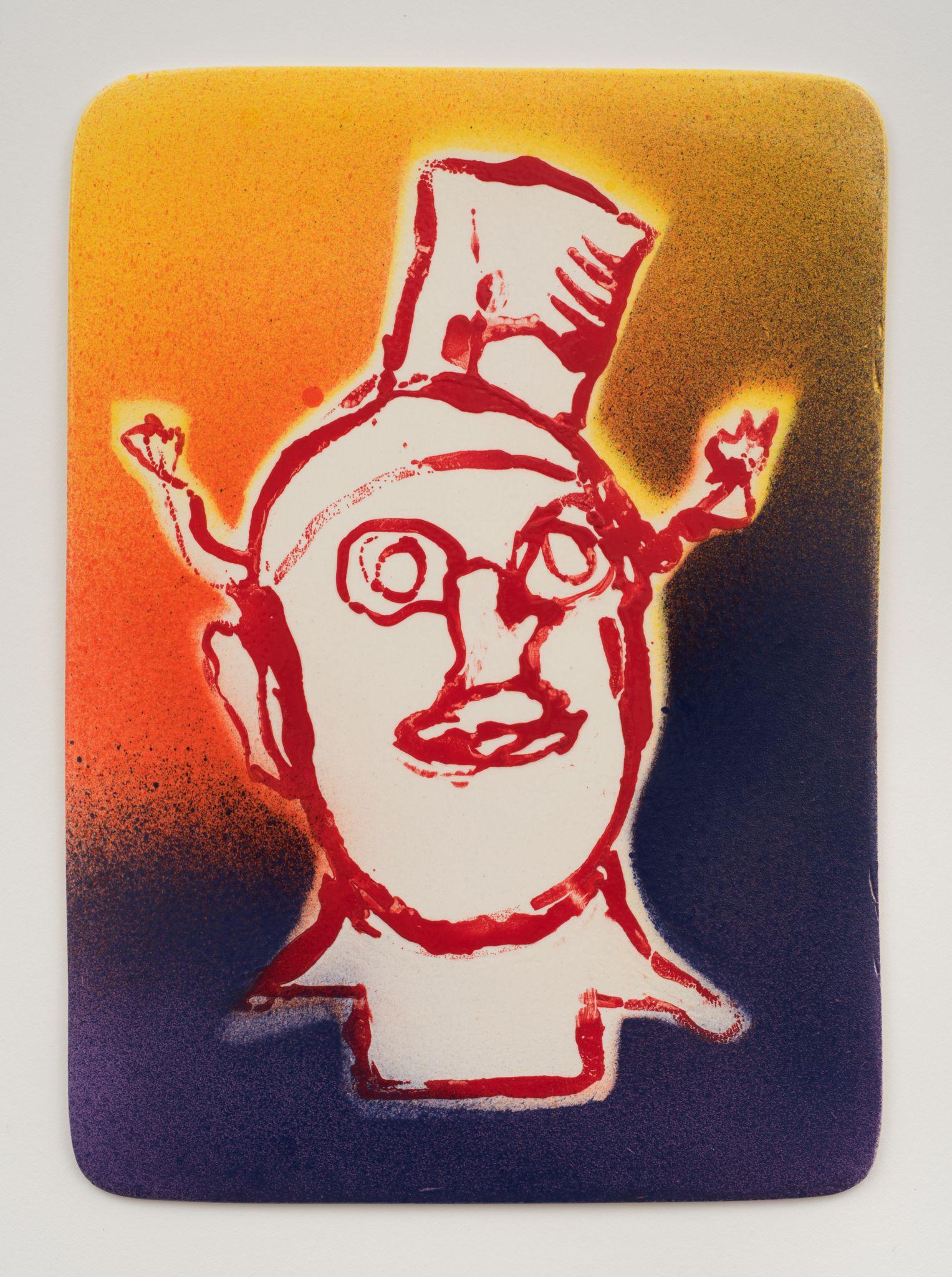 Testa Matta – which means ‘madcap’ or ‘screwball’ – is Pessoli’s second solo show with the gallery. Central to the exhibition is Fortunello, an imaginary Dadaist character created by the Italian actor and playwright Ettore Petrolini (1884-1936). Based on a cartoon character, and hinging on slapstick, parody and nonsense, Petrolini’s semi-mechanical performances as Fortunello captured the attention of the Italian Futurists. Marinetti described the character as ‘the most difficult to analyse of all Petrolini’s masterpieces’. Deeply engaged with both history and art history, Pessoli uses Fortunello as the springboard for a poetic, personal and richly layered visual essay on the themes of culture, identity and about what it means to be an artist.