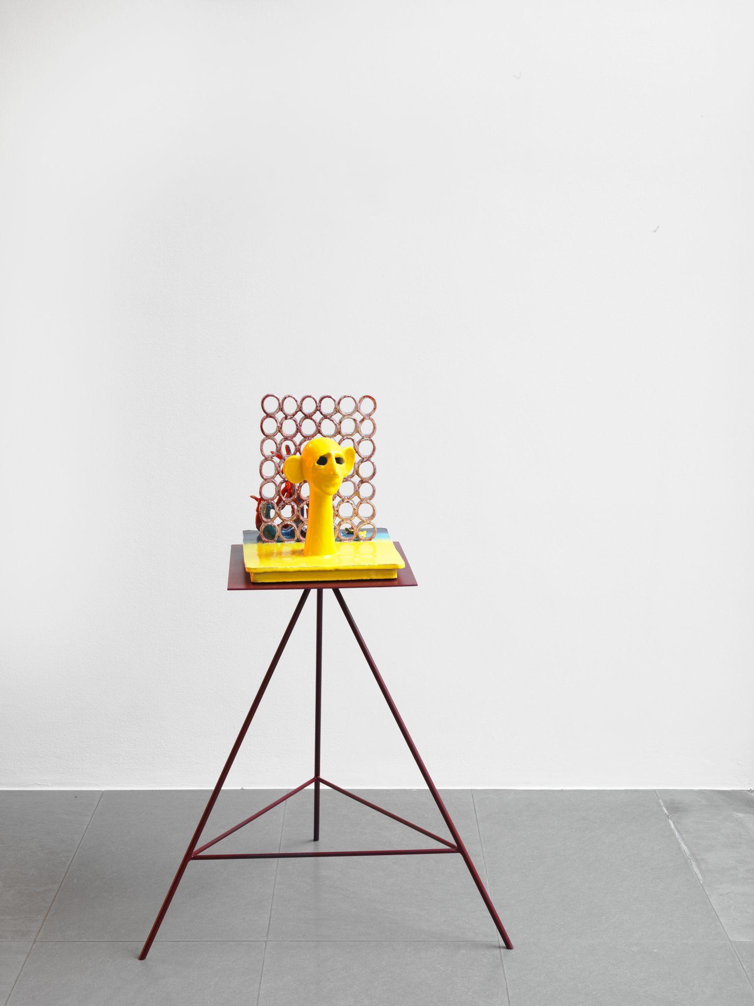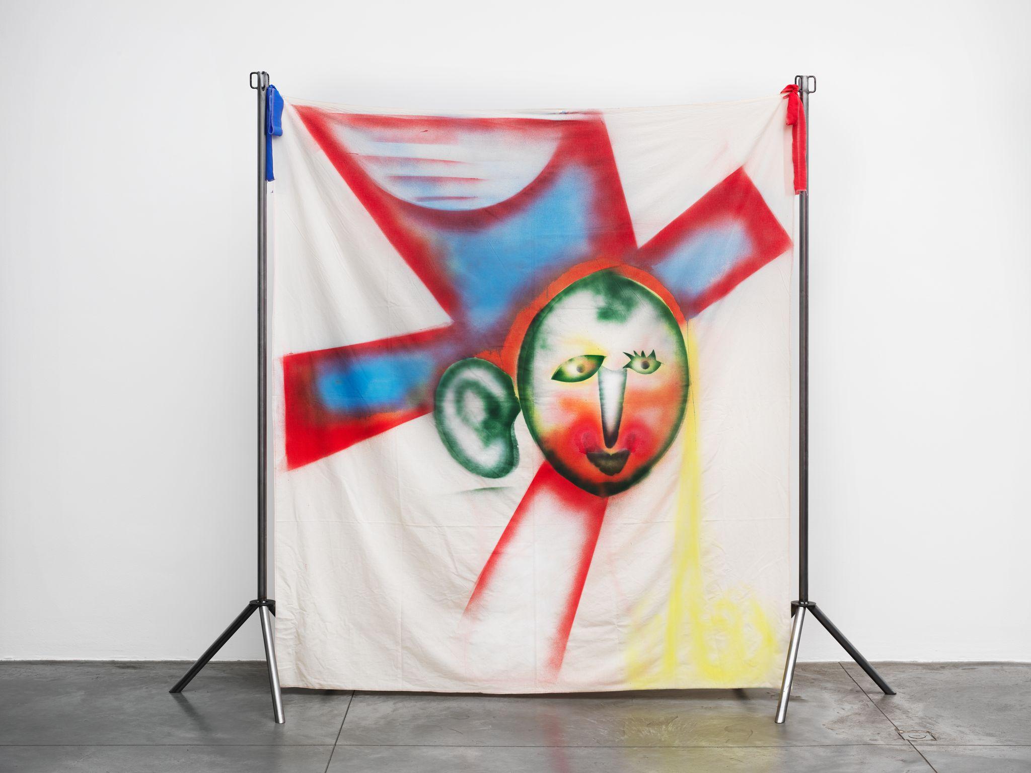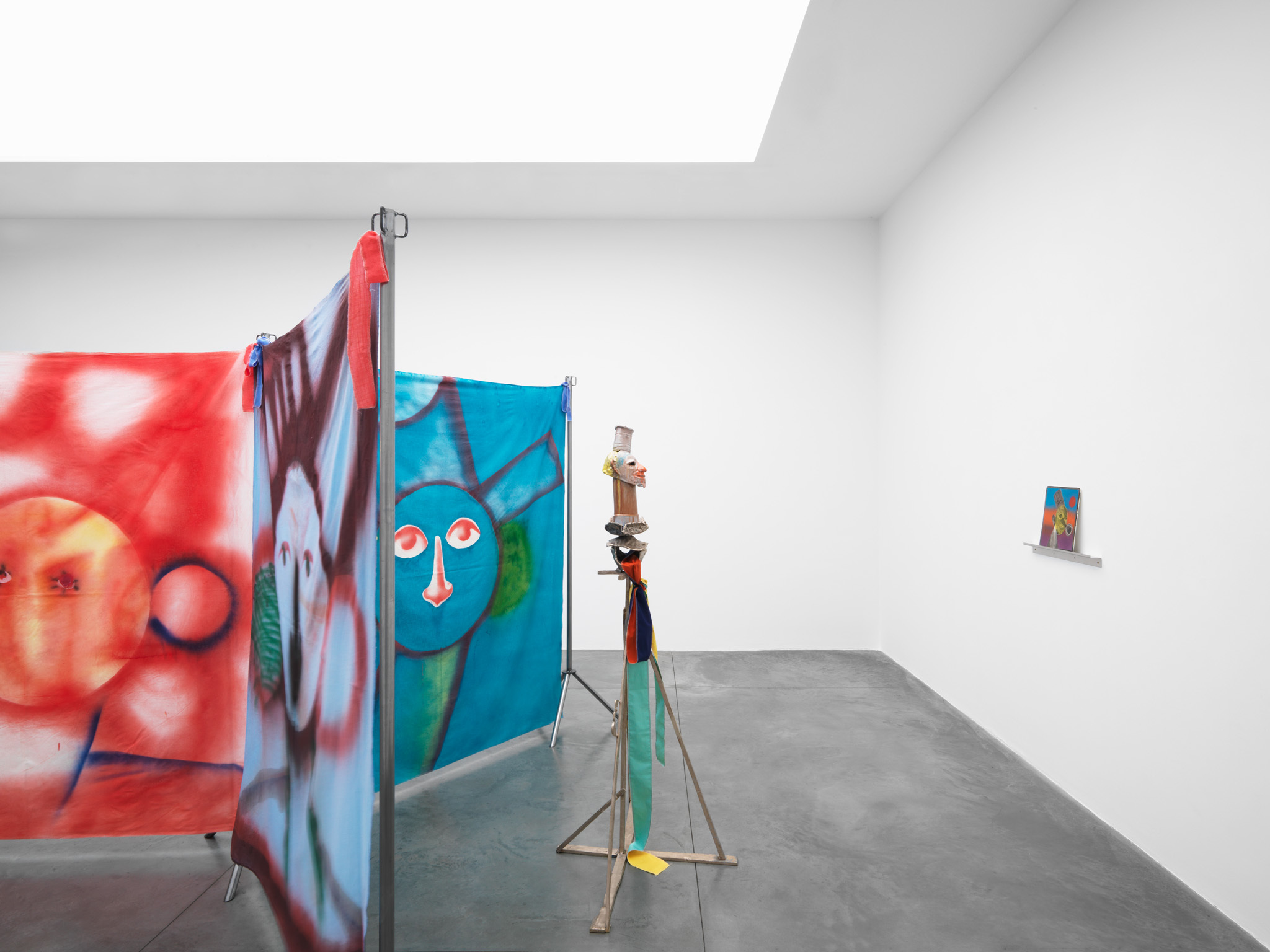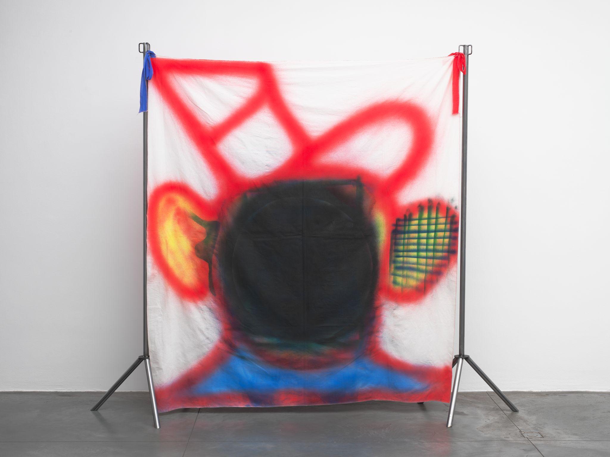 Testa Matta also includes a recent series of amorphous figures and busts, some rendered in bronze, others in painted ceramic. The largest and most complex of these comprises four busts separated by thin, spray-painted canvases hung from iron tripods. Pessoli’s installation can be read as a loose interpretation of a classic portrait gallery in both two- and three-dimensions and is as much a paean to free-expression as it is to Petrolini/Fortunello, or the different images and modes of representation that are embedded in Western visual culture. What appears, at first glance, to be a collection of incompletely rendered portraits and rough-hewn plinths is, in fact, a sophisticated exercise in composition and juxtaposition. The dynamic contrasts between the heavy, malleable clay and the nebulous airbrushing, the surface textures, colours, materials and techniques radiate with vital energy. Pessoli’s characters are arranged as though engaged in a conversation, albeit one that takes place in separate ‘rooms’: whichever way you approach the installation, it can never be viewed in its entirety; there is always the awareness of the figures on the ‘other side’.