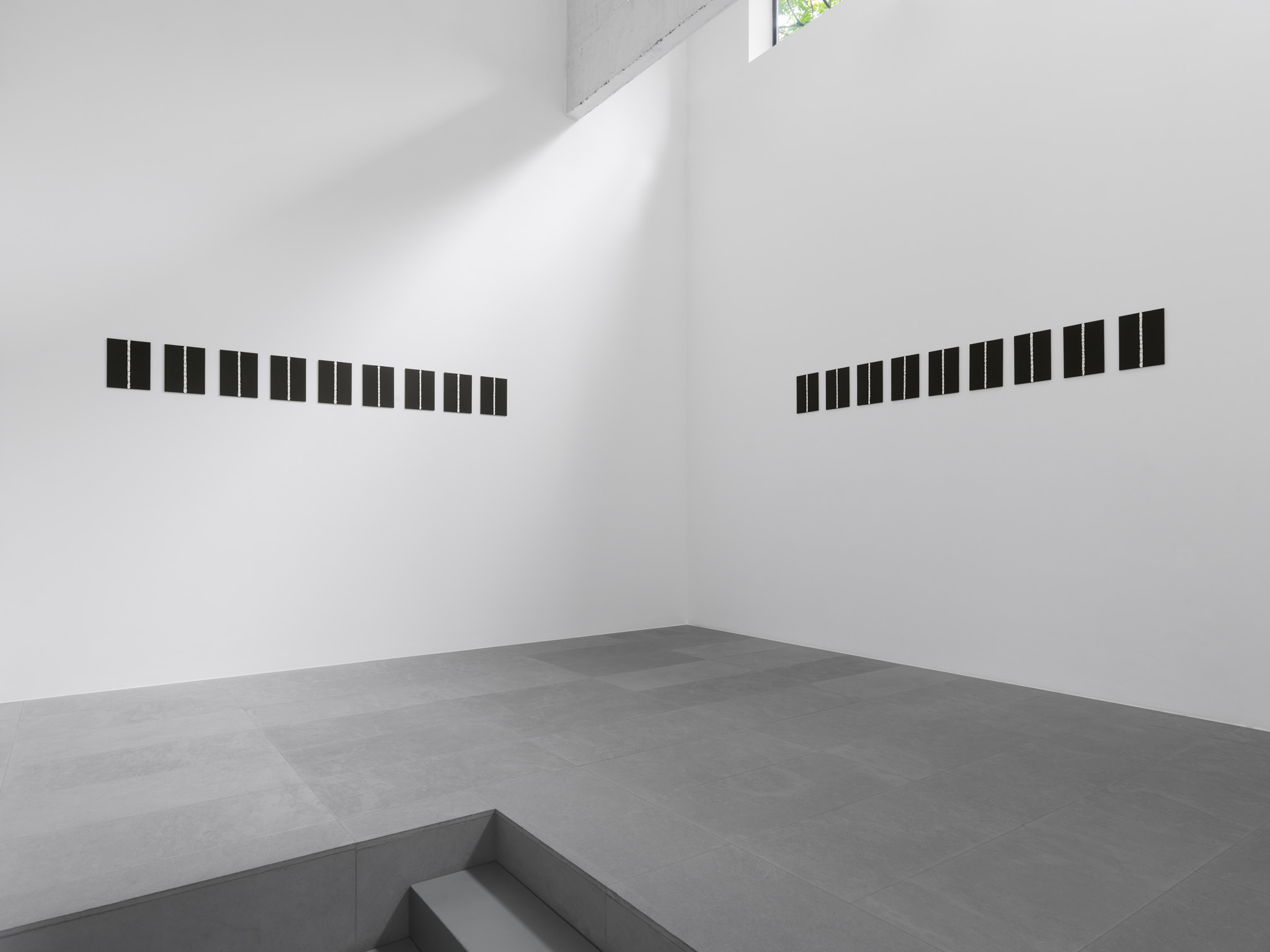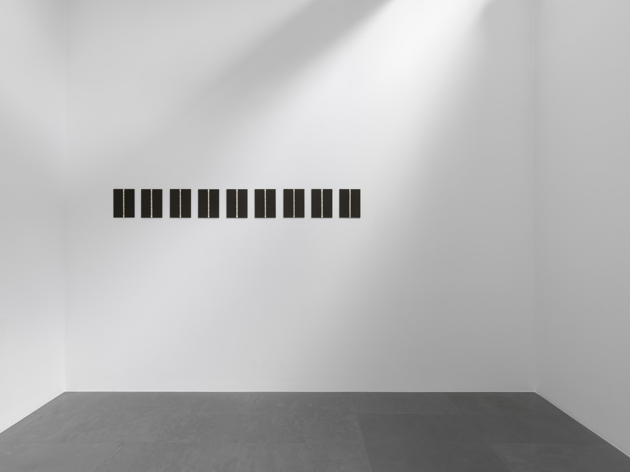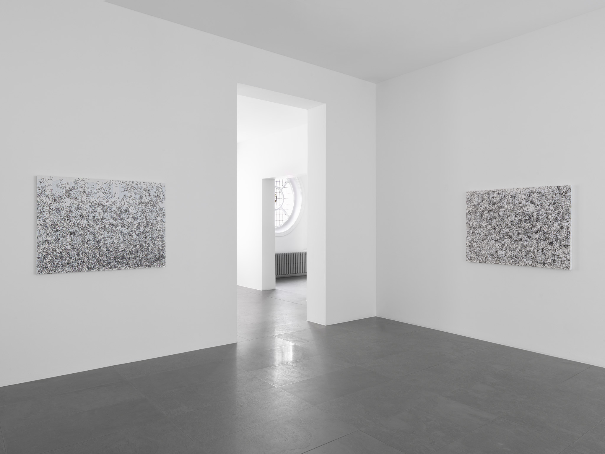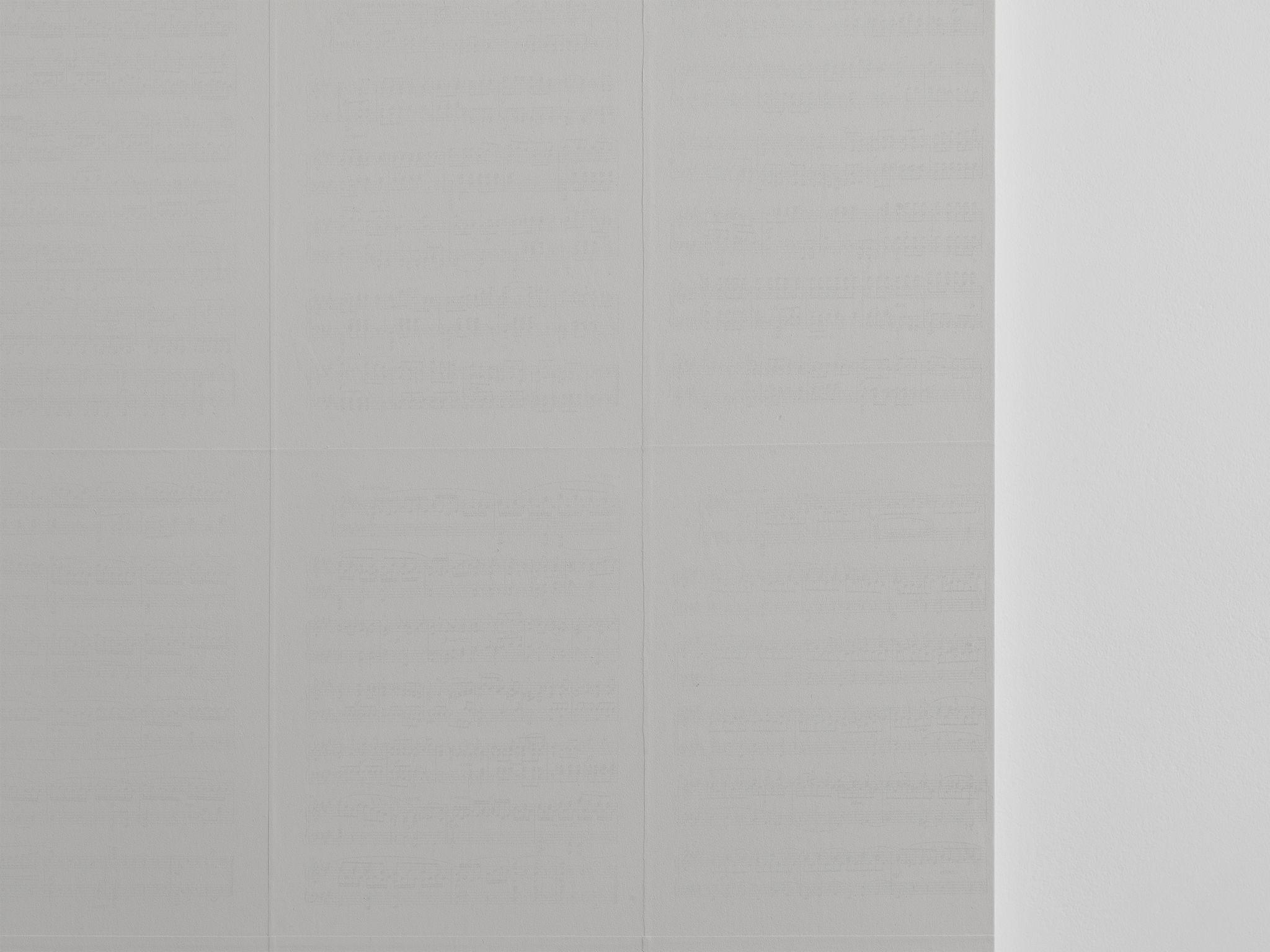 A related series of works explores the music of Franz Joseph Haydn and Felix Mendelssohn: perhaps two of the greatest composers of the Romantic era. Songs Without Words (after Mendelssohn) takes its title from a series of short lyrical piano pieces written by Felix Mendelssohn. The composer was the grandson of Moses Mendelssohn, the celebrated philosopher who developed the theory of the sublime in art, and also the varied notions of immensity. In The Seven Last Words of Christ, K.O.S. re-imagines the first performance of Haydn’s identically titled orchestral meditation. Inspired by the seven short phrases uttered by Jesus on the cross, his work was commissioned for the Good Friday service at Cádiz Cathedral, Spain. Of the first performance in 1786 Haydn wrote: ‘the walls, windows, and pillars of the church were hung with black cloth, and only one large lamp hanging from the centre of the roof broke the solemn darkness.’ This atmosphere is echoed in the black spinel pigment that is painted over the musical score.**