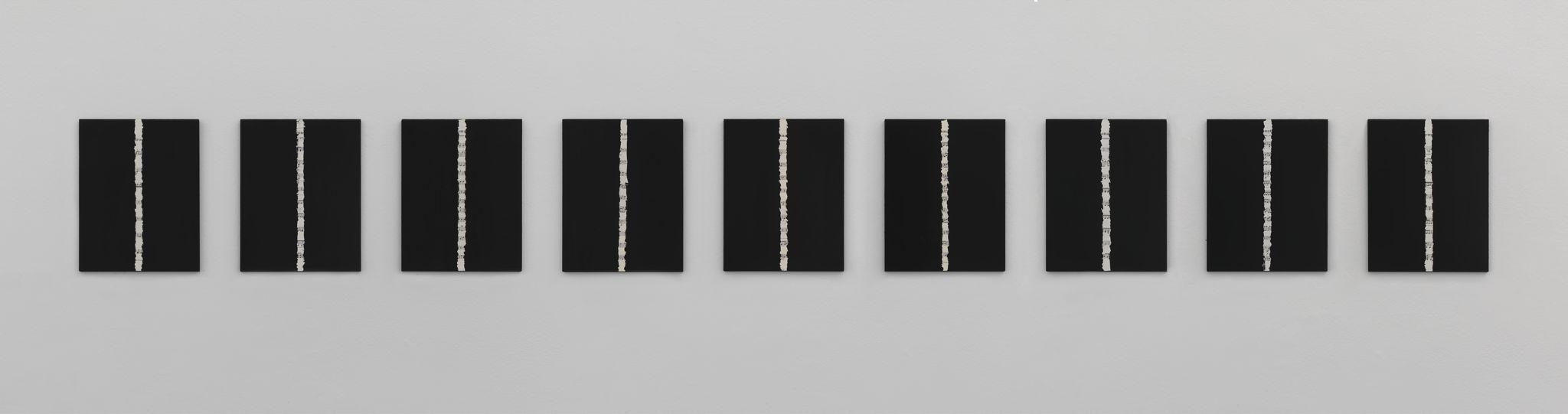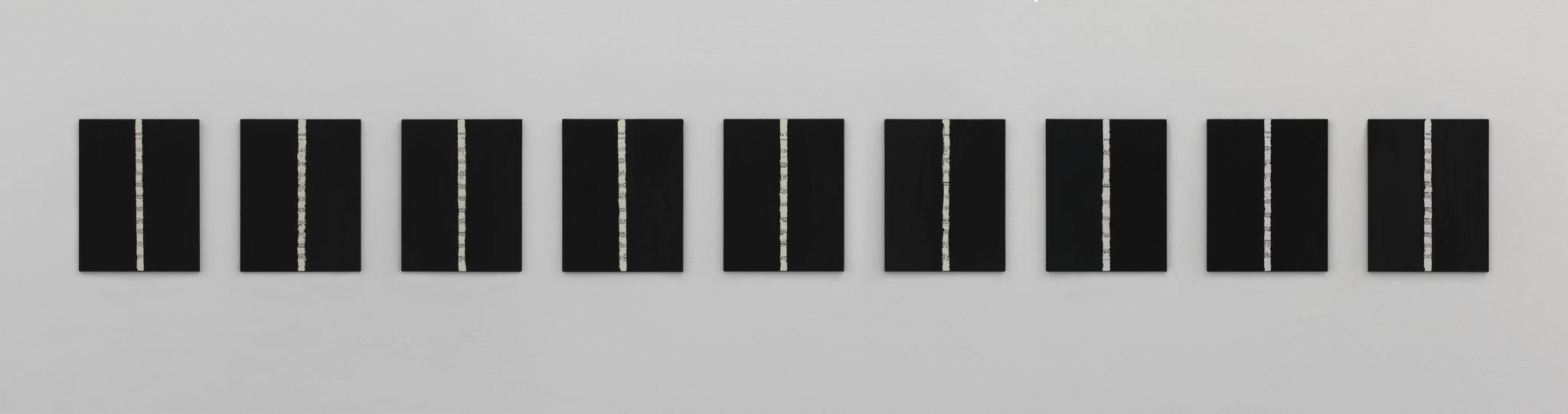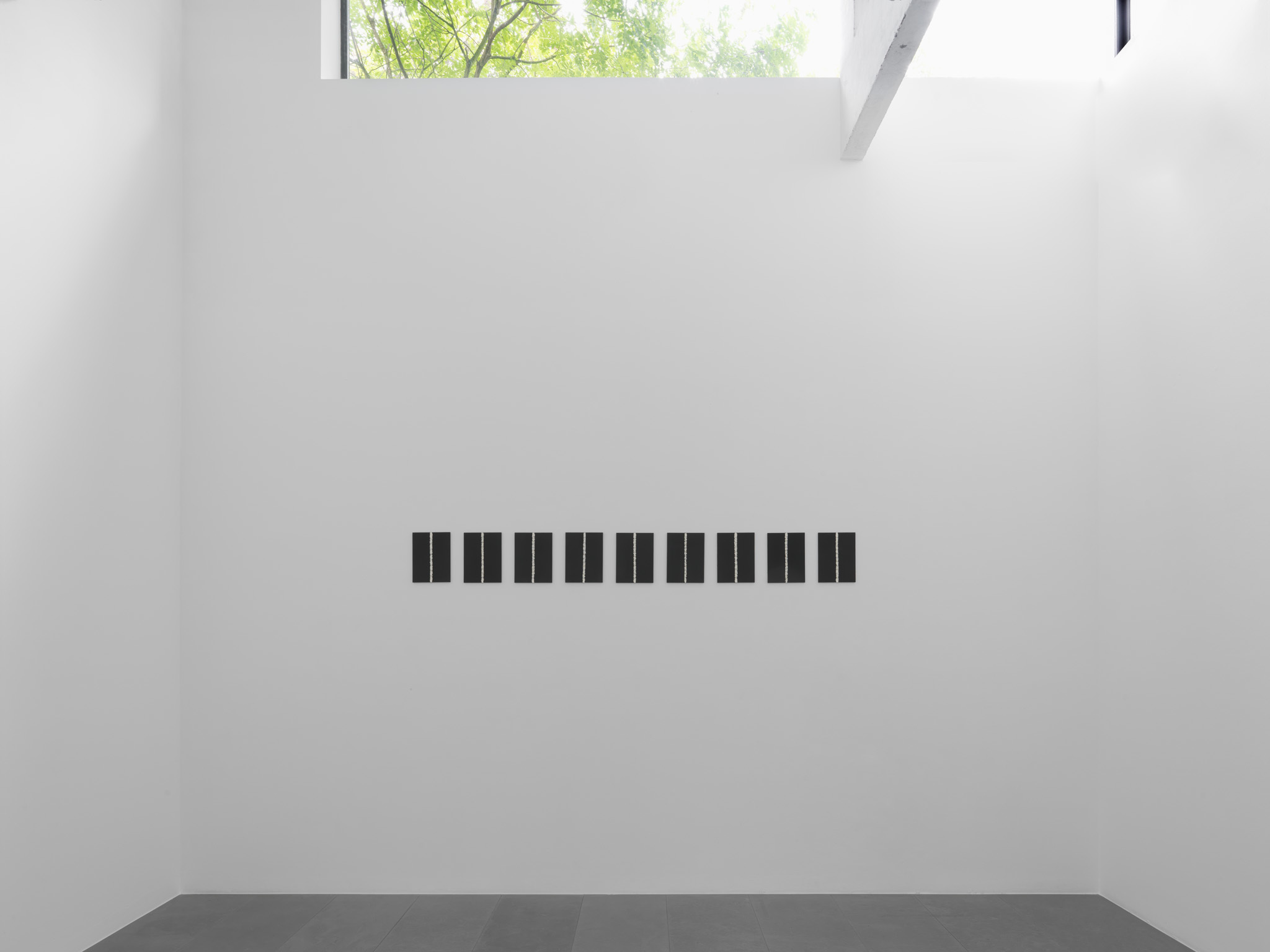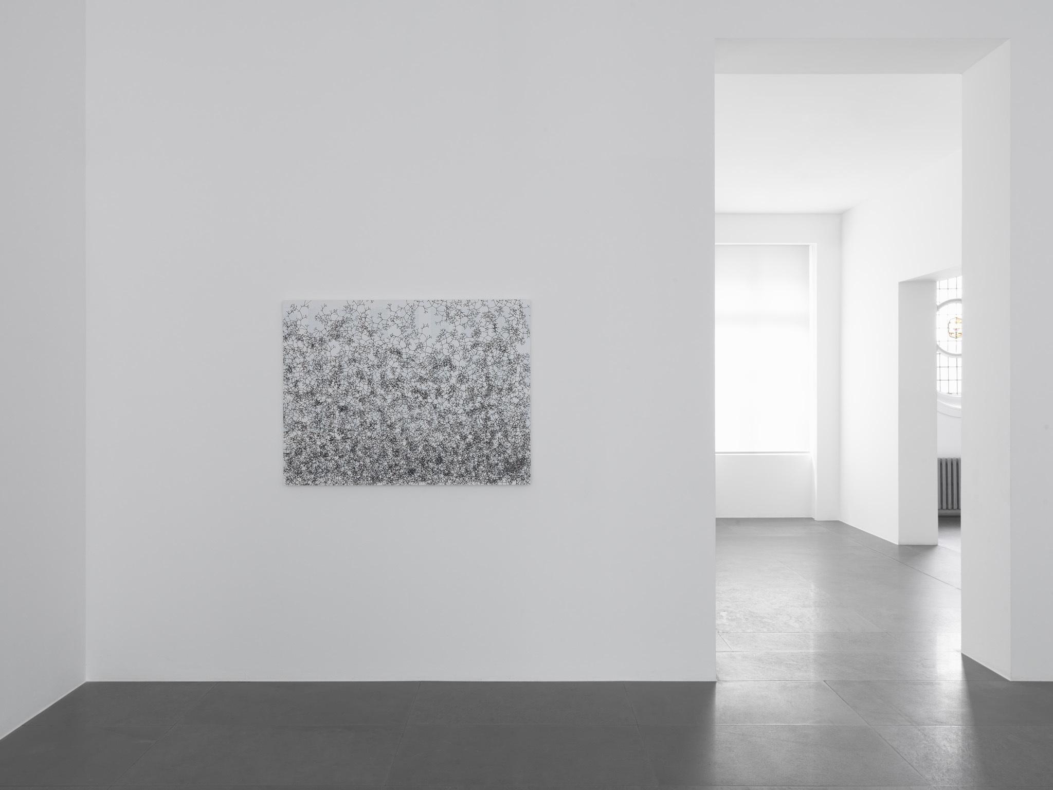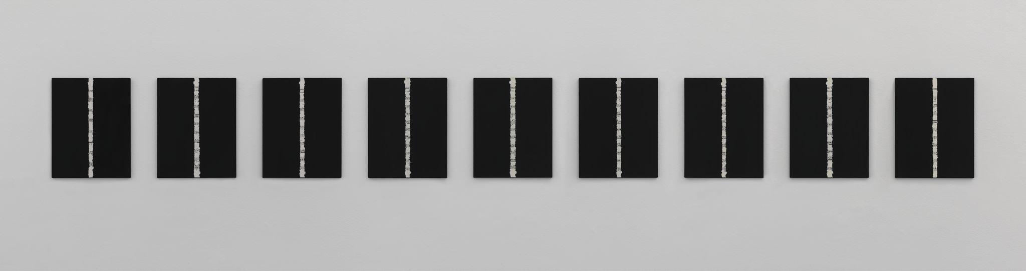 A related series of works explores the music of Franz Joseph Haydn and Felix Mendelssohn: perhaps two of the greatest composers of the Romantic era. Songs Without Words (after Mendelssohn) takes its title from a series of short lyrical piano pieces written by Felix Mendelssohn. The composer was the grandson of Moses Mendelssohn, the celebrated philosopher who developed the theory of the sublime in art, and also the varied notions of immensity. In The Seven Last Words of Christ, K.O.S. re-imagines the first performance of Haydn’s identically titled orchestral meditation. Inspired by the seven short phrases uttered by Jesus on the cross, his work was commissioned for the Good Friday service at Cádiz Cathedral, Spain. Of the first performance in 1786 Haydn wrote: ‘the walls, windows, and pillars of the church were hung with black cloth, and only one large lamp hanging from the centre of the roof broke the solemn darkness.’ This atmosphere is echoed in the black spinel pigment that is painted over the musical score.**