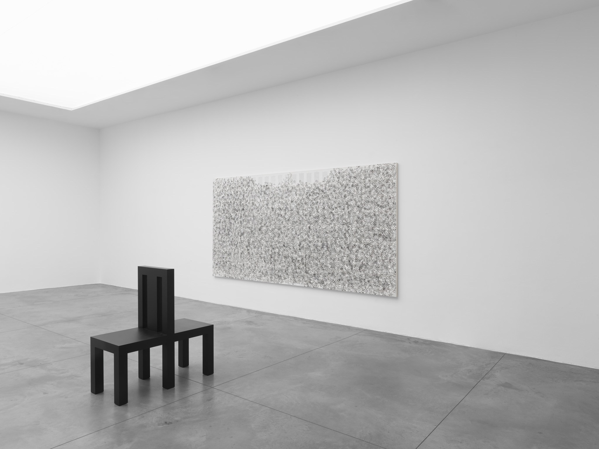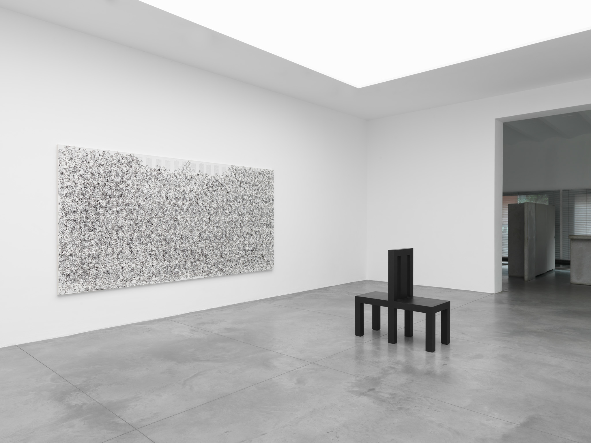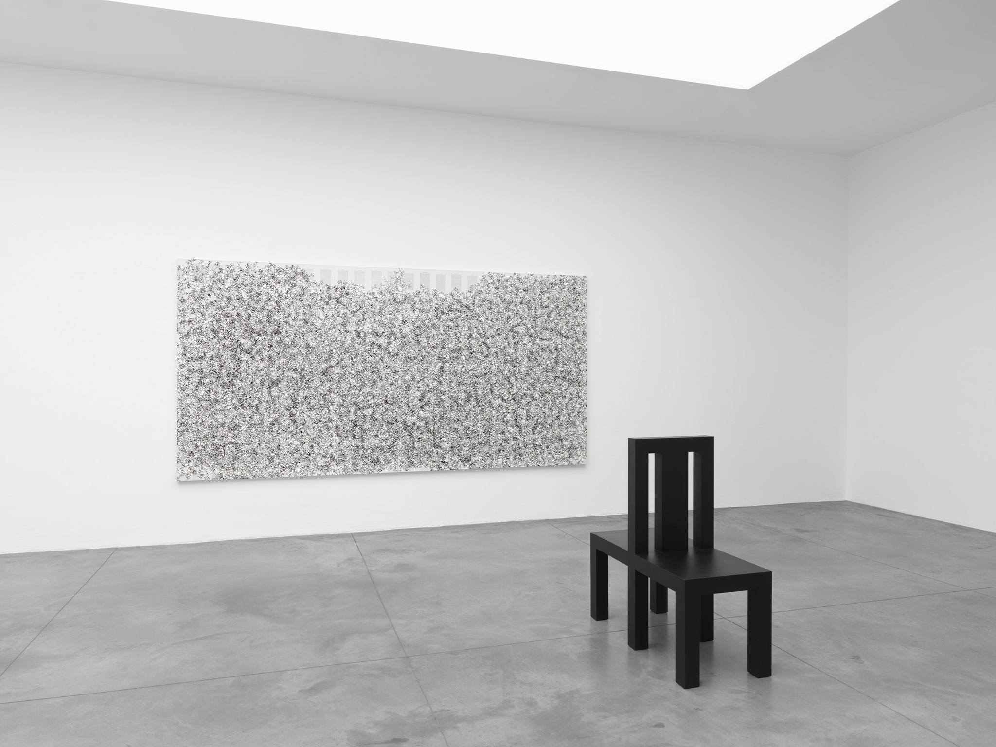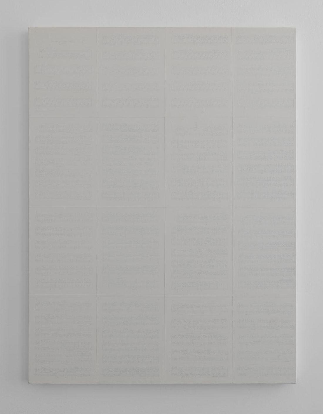 A related series of works explores the music of Franz Joseph Haydn and Felix Mendelssohn: perhaps two of the greatest composers of the Romantic era. Songs Without Words (after Mendelssohn) takes its title from a series of short lyrical piano pieces written by Felix Mendelssohn. The composer was the grandson of Moses Mendelssohn, the celebrated philosopher who developed the theory of the sublime in art, and also the varied notions of immensity. In The Seven Last Words of Christ, K.O.S. re-imagines the first performance of Haydn’s identically titled orchestral meditation. Inspired by the seven short phrases uttered by Jesus on the cross, his work was commissioned for the Good Friday service at Cádiz Cathedral, Spain. Of the first performance in 1786 Haydn wrote: ‘the walls, windows, and pillars of the church were hung with black cloth, and only one large lamp hanging from the centre of the roof broke the solemn darkness.’ This atmosphere is echoed in the black spinel pigment that is painted over the musical score.**