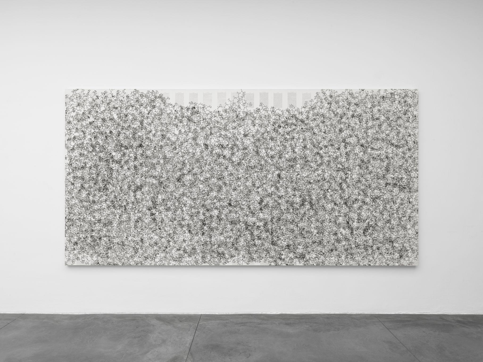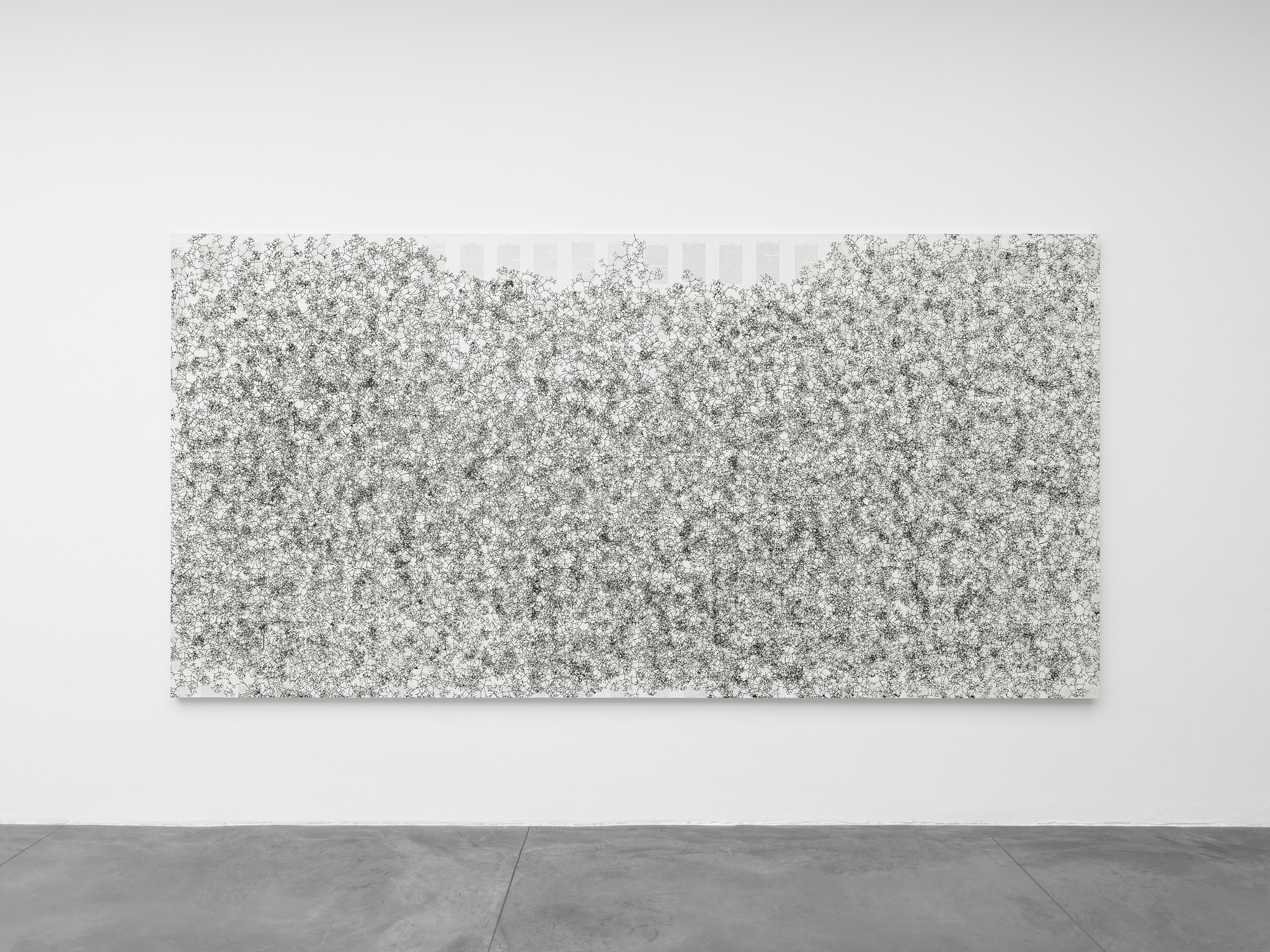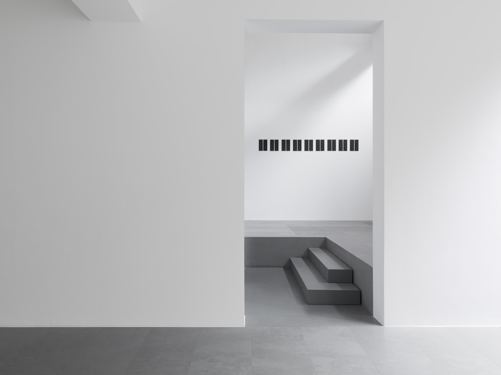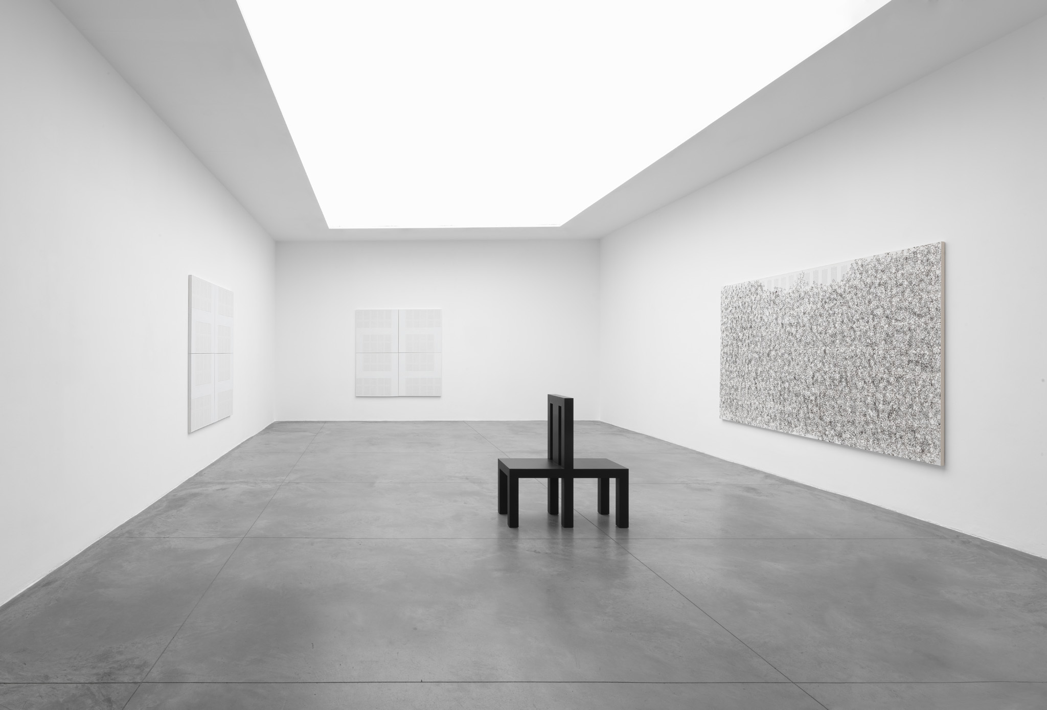 A related series of works explores the music of Franz Joseph Haydn and Felix Mendelssohn: perhaps two of the greatest composers of the Romantic era. Songs Without Words (after Mendelssohn) takes its title from a series of short lyrical piano pieces written by Felix Mendelssohn. The composer was the grandson of Moses Mendelssohn, the celebrated philosopher who developed the theory of the sublime in art, and also the varied notions of immensity. In The Seven Last Words of Christ, K.O.S. re-imagines the first performance of Haydn’s identically titled orchestral meditation. Inspired by the seven short phrases uttered by Jesus on the cross, his work was commissioned for the Good Friday service at Cádiz Cathedral, Spain. Of the first performance in 1786 Haydn wrote: ‘the walls, windows, and pillars of the church were hung with black cloth, and only one large lamp hanging from the centre of the roof broke the solemn darkness.’ This atmosphere is echoed in the black spinel pigment that is painted over the musical score.**