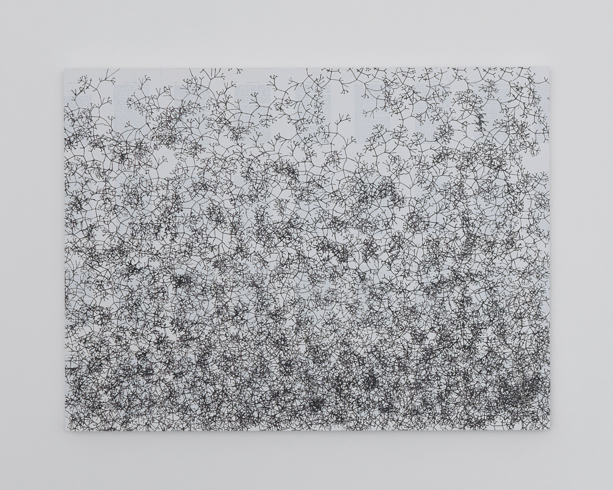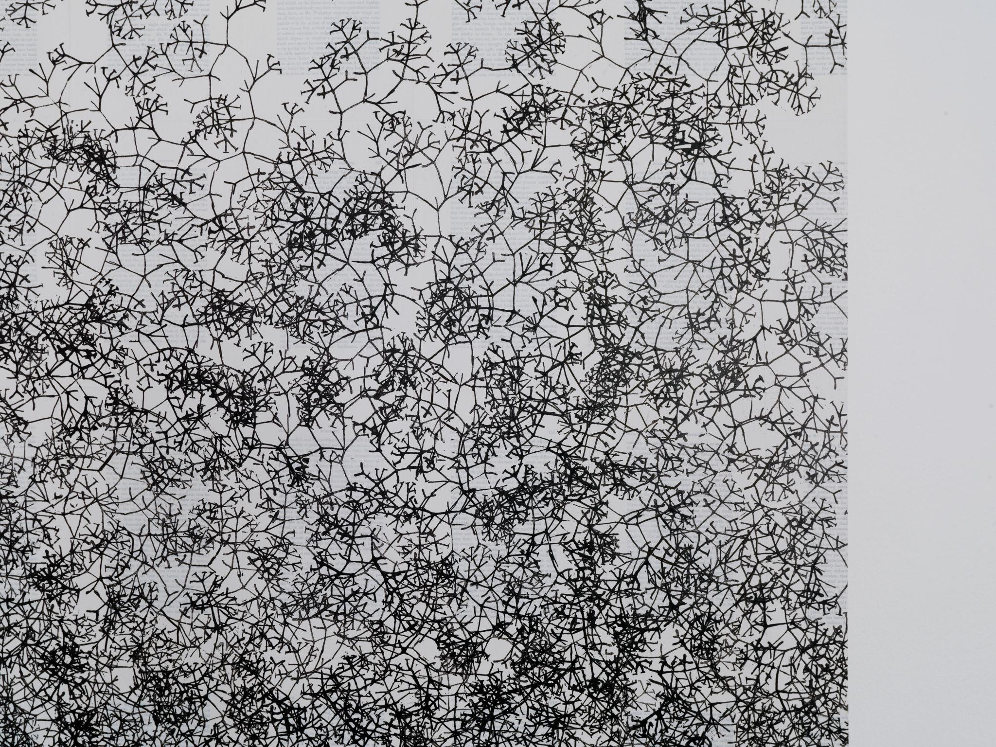 For their second exhibition at the Xavier Hufkens gallery, Tim Rollins and K.O.S. focus on eighteenth- and nineteenth-century Europe. Taking the notion of time travel as their starting point, the K.O.S. journey back to the year 1837 and meet Charles Darwin just as he is beginning to sketch out his idea of a ‘tree of life’. Darwin developed his powerful drawing into the theory of evolution published as On the Origin of Species in 1859. This seminal work gave rise to a more realistic theory of life and brought Romanticism, and the search for creative inspiration in nature, to an end. The Time Machine series, on the other hand, is named after the science fiction novella by H.G. Wells. Published in 1895, the book is widely credited as having popularised the idea of time travel by using a machine that enables the operator to move purposefully and selectively through different eras, including the future. Wells used The Time Machine to introduce the concept of a fourth dimension existing alongside the three dimensions of space: length, width and depth. Another definition for the fourth dimension, however, is the act of perceiving (consciousness) or feeling (sensation). Artists and writers often think of the fourth dimension as the life of the mind. Tim Rollins and K.O.S declare: ‘We believe that every total work of art is a time machine – a synthesis of a living past and present located in an object that can only be completed by the social experience of a viewer in the future. The total work of art exists in the invisible fourth dimension of space/time and it is this notion that unites the works in the exhibition. We paint on historic texts in the present so that they can haunt our futures.’