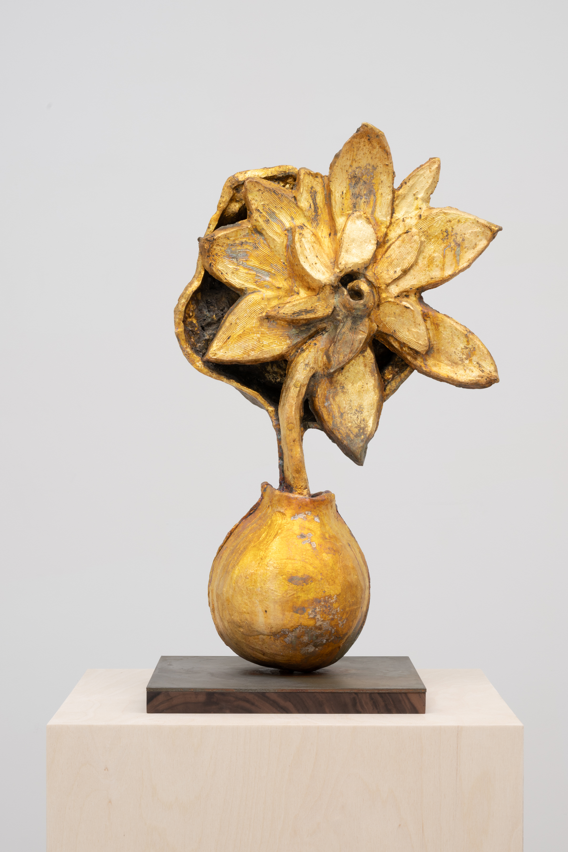 The works in the following galleries — in bronze, brass, wood, aluminium and concrete, and typically presented on redwood plinths that are sculptures in their own right — further highlight Houseago’s long-standing engagement with nature, mythology and humanity. Ranch Owl (2025) and Miraval Owl (2025) are the latest iterations in a large corpus of works dedicated to this enigmatic, nocturnal and deeply symbolic bird. Across various cultures, owls signify mystery, wisdom and vigilance. The works in these galleries exemplify key characteristics of Houseago’s practice: allowing the creative process to remain visible through tool marks (Miraval Owl); splitting and doubling (Shadow); nature and transience (Java Flower and Joy Flowers); and assembling three-dimensional forms from fragmented shapes and two-dimensional planes (Ranch Owl and Friend). This latter technique recalls the tradition of Cubist sculpture, while also reflecting Houseago’s early familiarity with British artists such as Henri Gaudier-Brzeska, Jacob Epstein and Henry Moore.