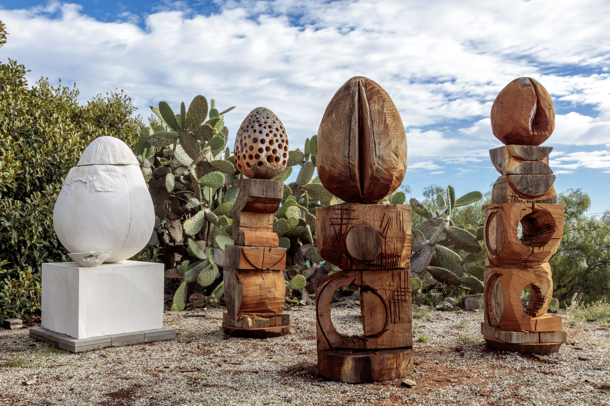 Houseago’s Giant Striding Figure is a paradoxical figure: powerful, magisterial, and advancing, on the one hand, yet vulnerable on the other, evoked by the skull-like head and vast, vacant eyes. Carved from redwood, the sculpture forges a link with the giant sequoia trees native to the West Coast of America, where Houseago lives and works, and, through the figure of Van Gogh, between art and nature. Redwood trees symbolize strength, longevity, wisdom and resilience: their towering presence, longevity (the oldest known sequoia is over 3,200 years old) and interconnected root systems embody a deep connection to the earth, ancient knowledge and community.