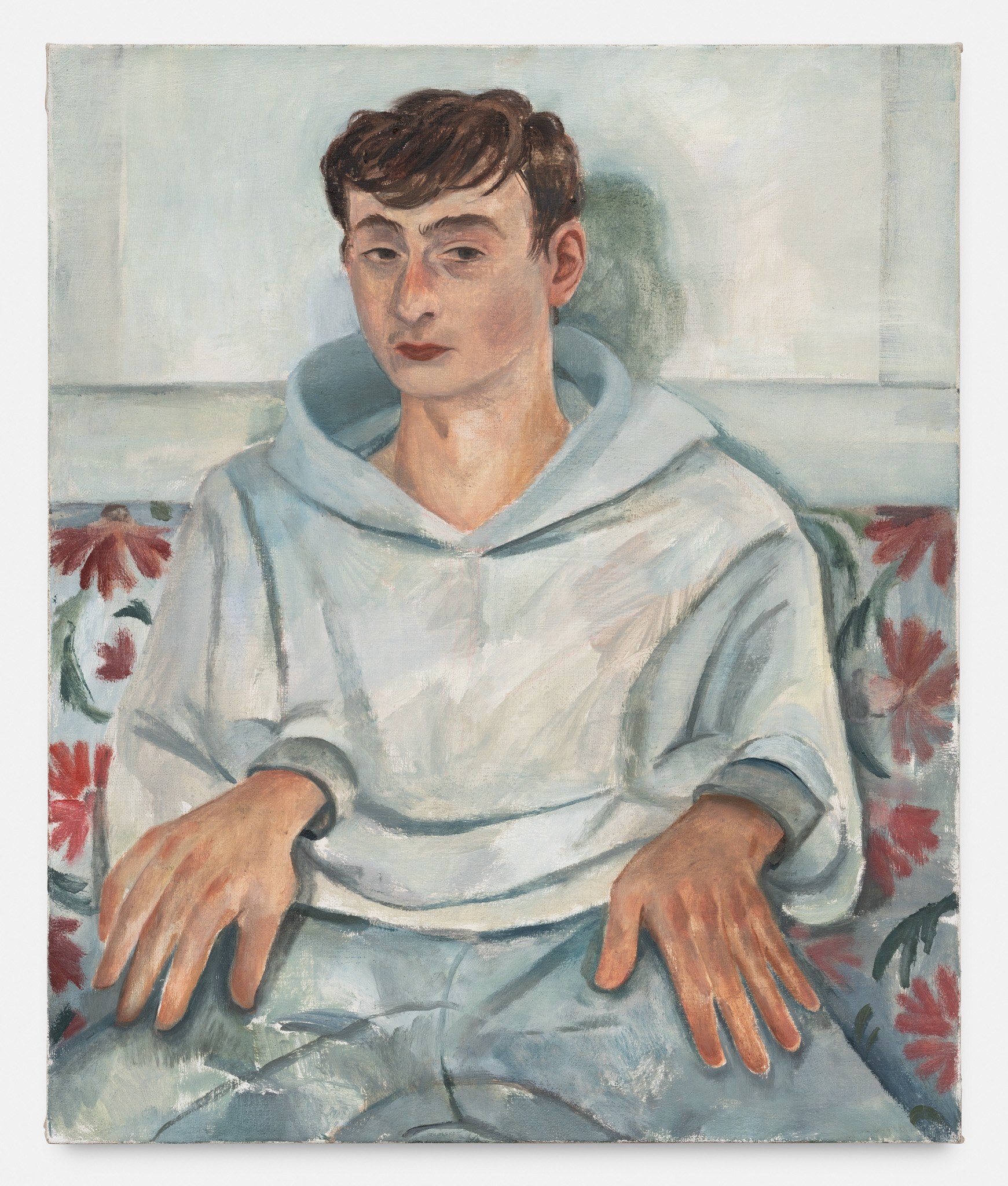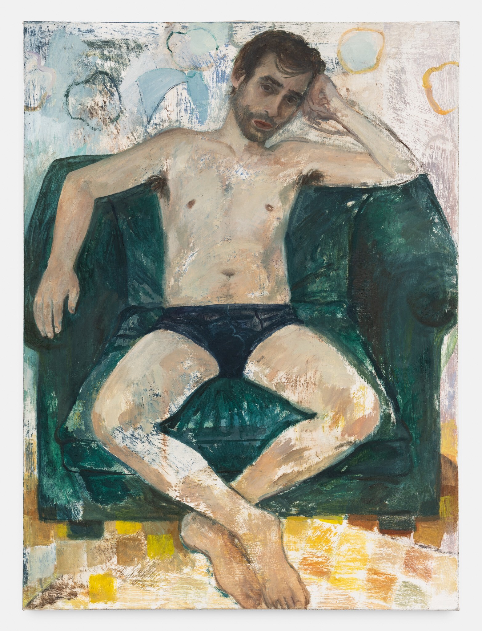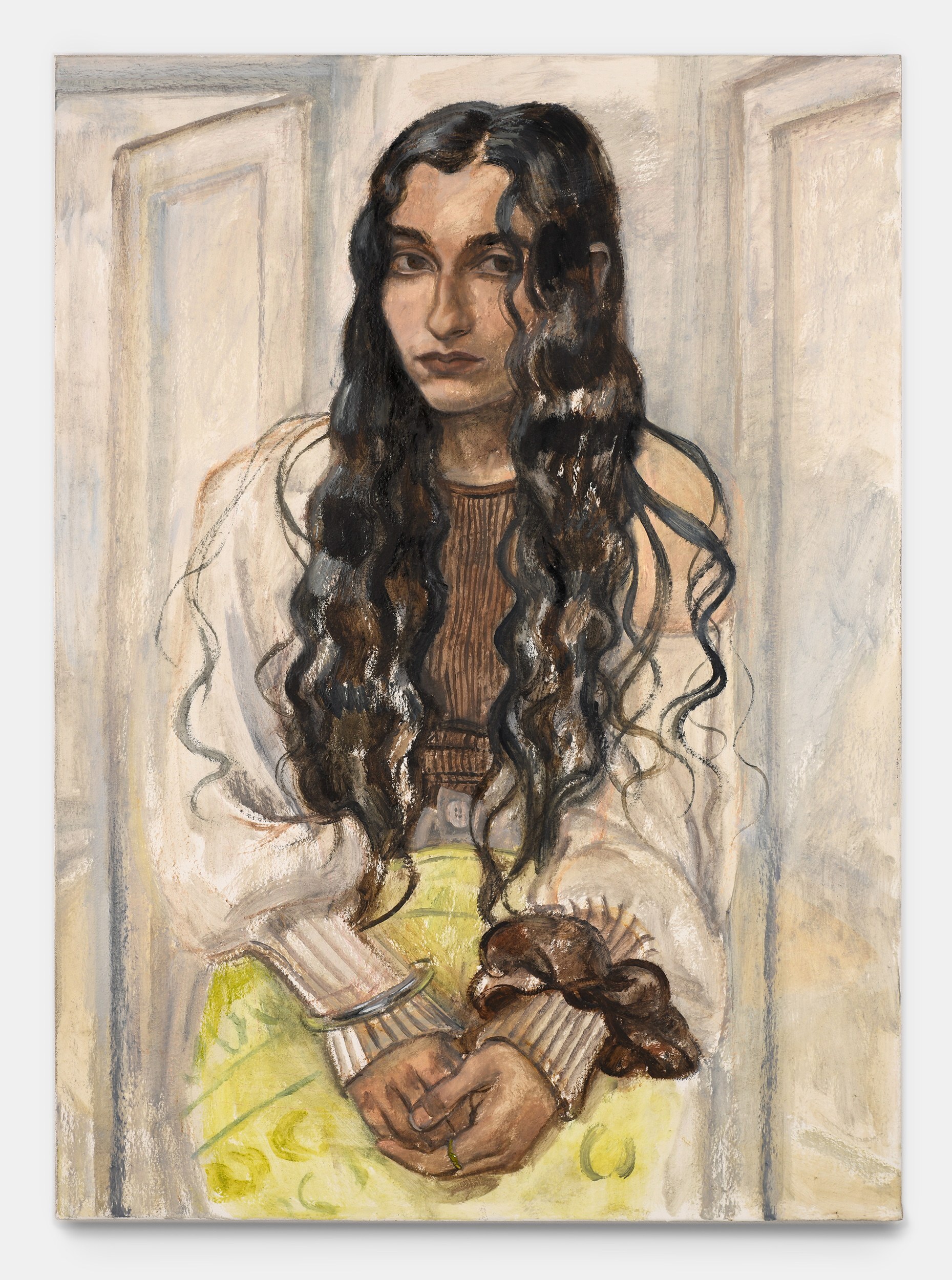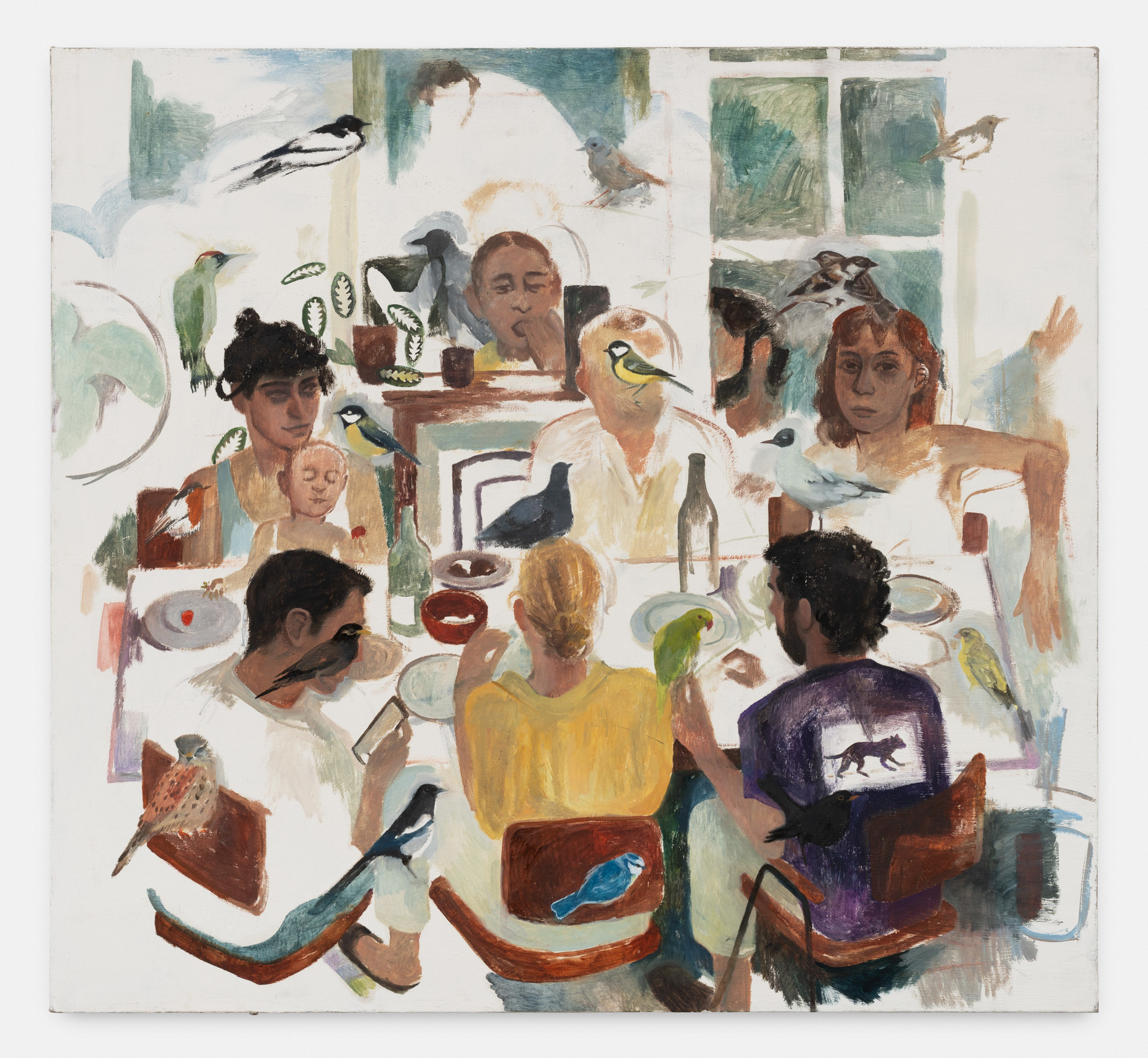 Herbelin’s works are also characterised by simplified forms and a deliberate flatness, both of which allow colour to shine as an expressive medium in its own right. Her palette is typically one of powdery, neutral shades enlivened by areas of pure, bright colour: the yellow wall-hanging carpet in Undivided Attention, the cobalt cardigan in Elisha, and the emerald studio sofa, for example. At times, works also reference each other as seen in the same patterned rug in both Elisha and Florian, creating a resonance within the body of work. An enigmatic work in the exhibition, Diner avec oiseaux, is a palimpsest in which two different paintings merge to create a surreal, almost mystical image. Herbelin often reuses canvases, painting over earlier works that retain a ghostly presence in the more recent one. As here, where a dinner party was painted both across, but also around, a pedagogical painting of birds. In this scene, the quotidian and other-worldly converge.