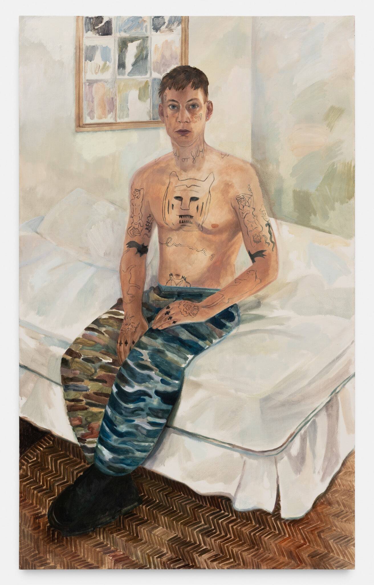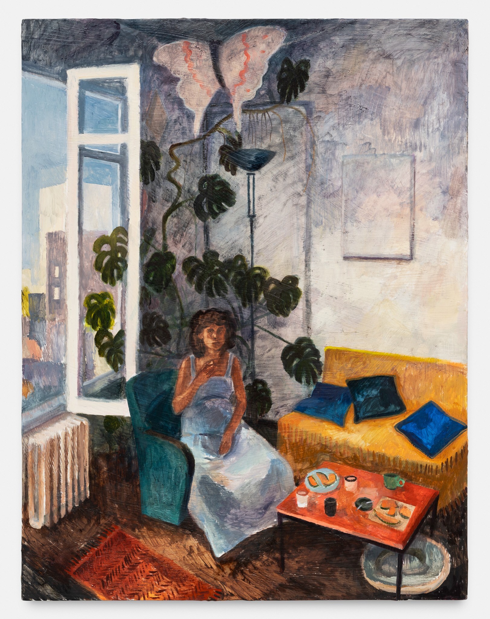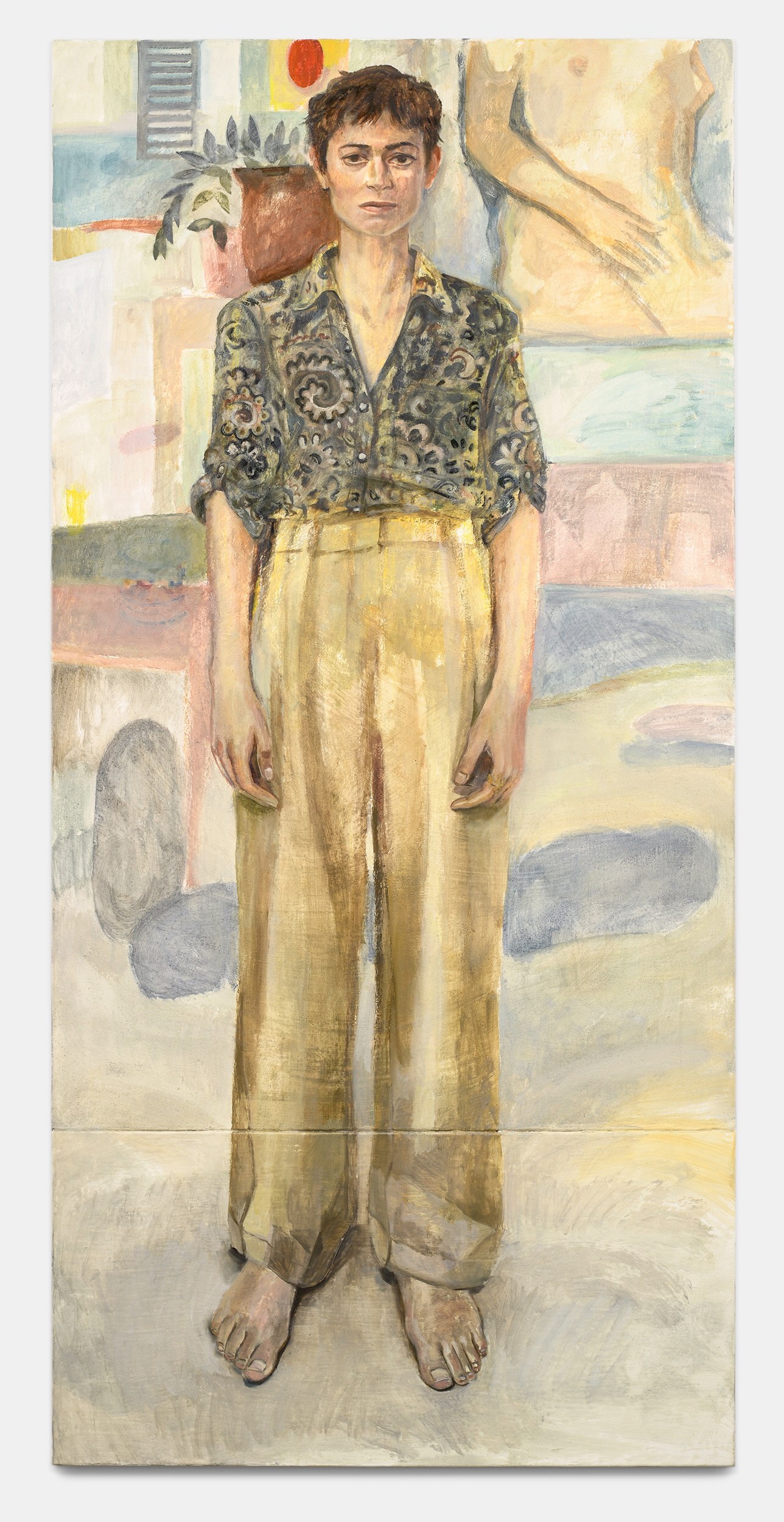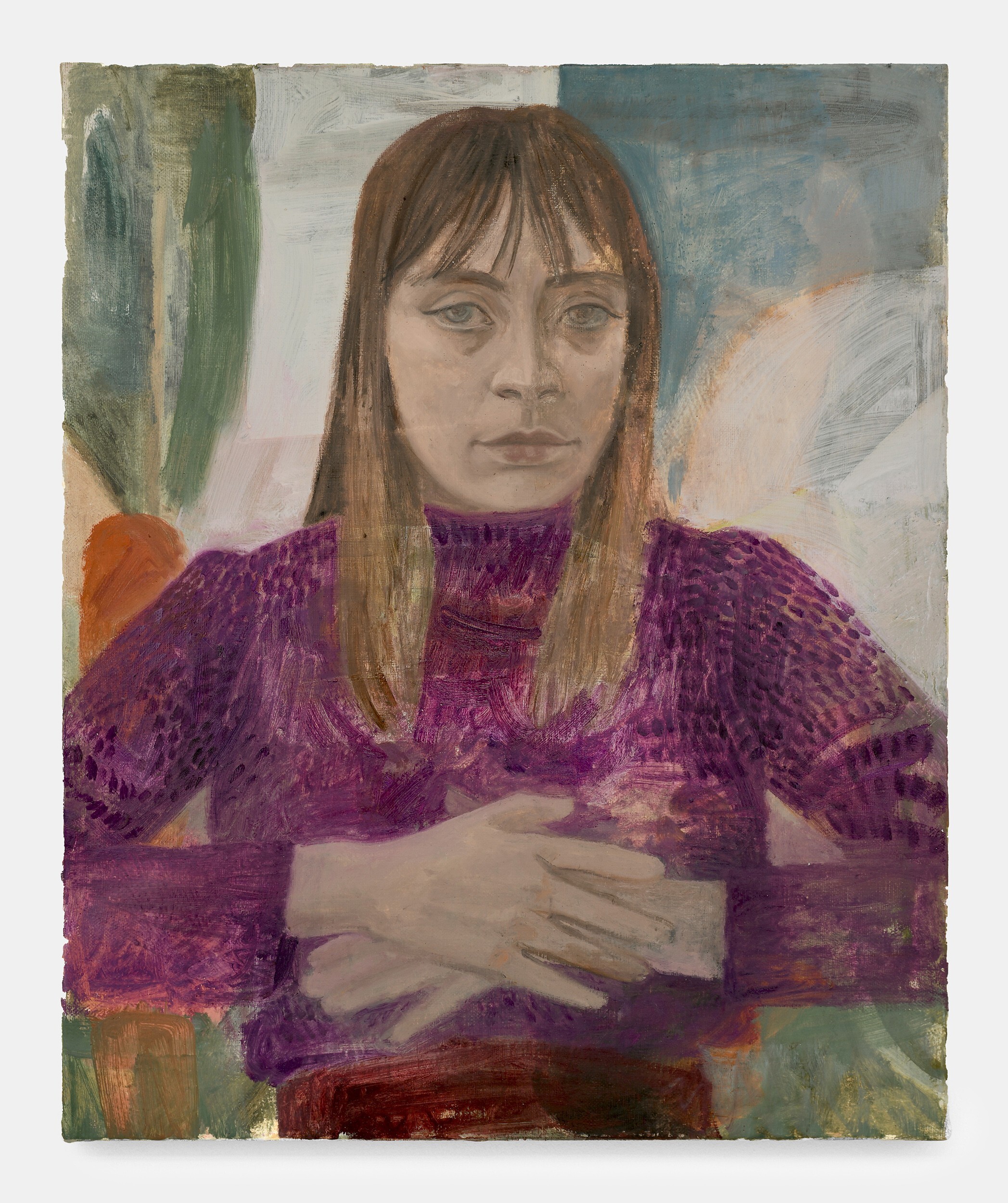 Herbelin’s works are also characterised by simplified forms and a deliberate flatness, both of which allow colour to shine as an expressive medium in its own right. Her palette is typically one of powdery, neutral shades enlivened by areas of pure, bright colour: the yellow wall-hanging carpet in Undivided Attention, the cobalt cardigan in Elisha, and the emerald studio sofa, for example. At times, works also reference each other as seen in the same patterned rug in both Elisha and Florian, creating a resonance within the body of work. An enigmatic work in the exhibition, Diner avec oiseaux, is a palimpsest in which two different paintings merge to create a surreal, almost mystical image. Herbelin often reuses canvases, painting over earlier works that retain a ghostly presence in the more recent one. As here, where a dinner party was painted both across, but also around, a pedagogical painting of birds. In this scene, the quotidian and other-worldly converge.