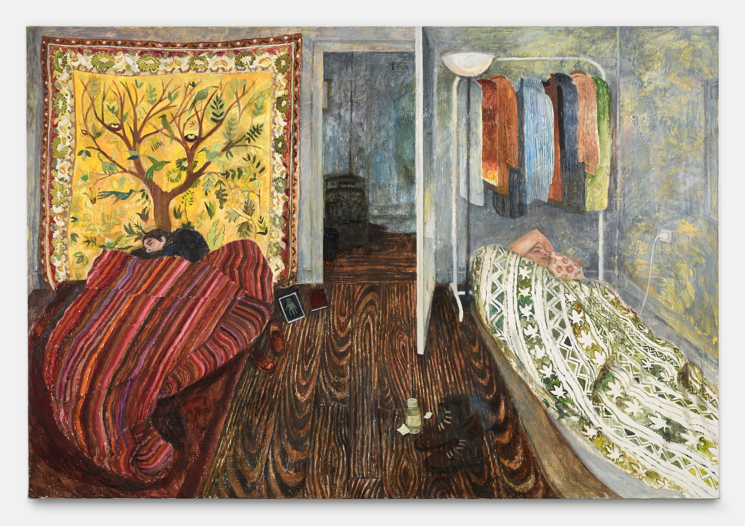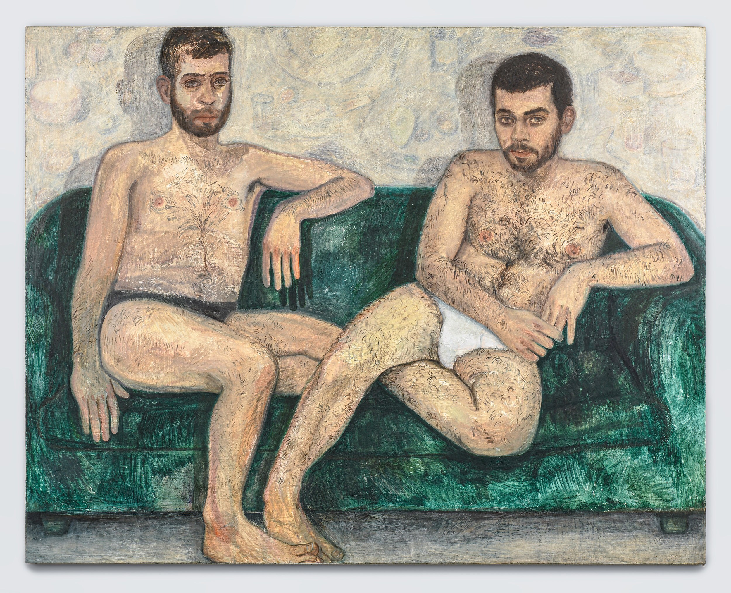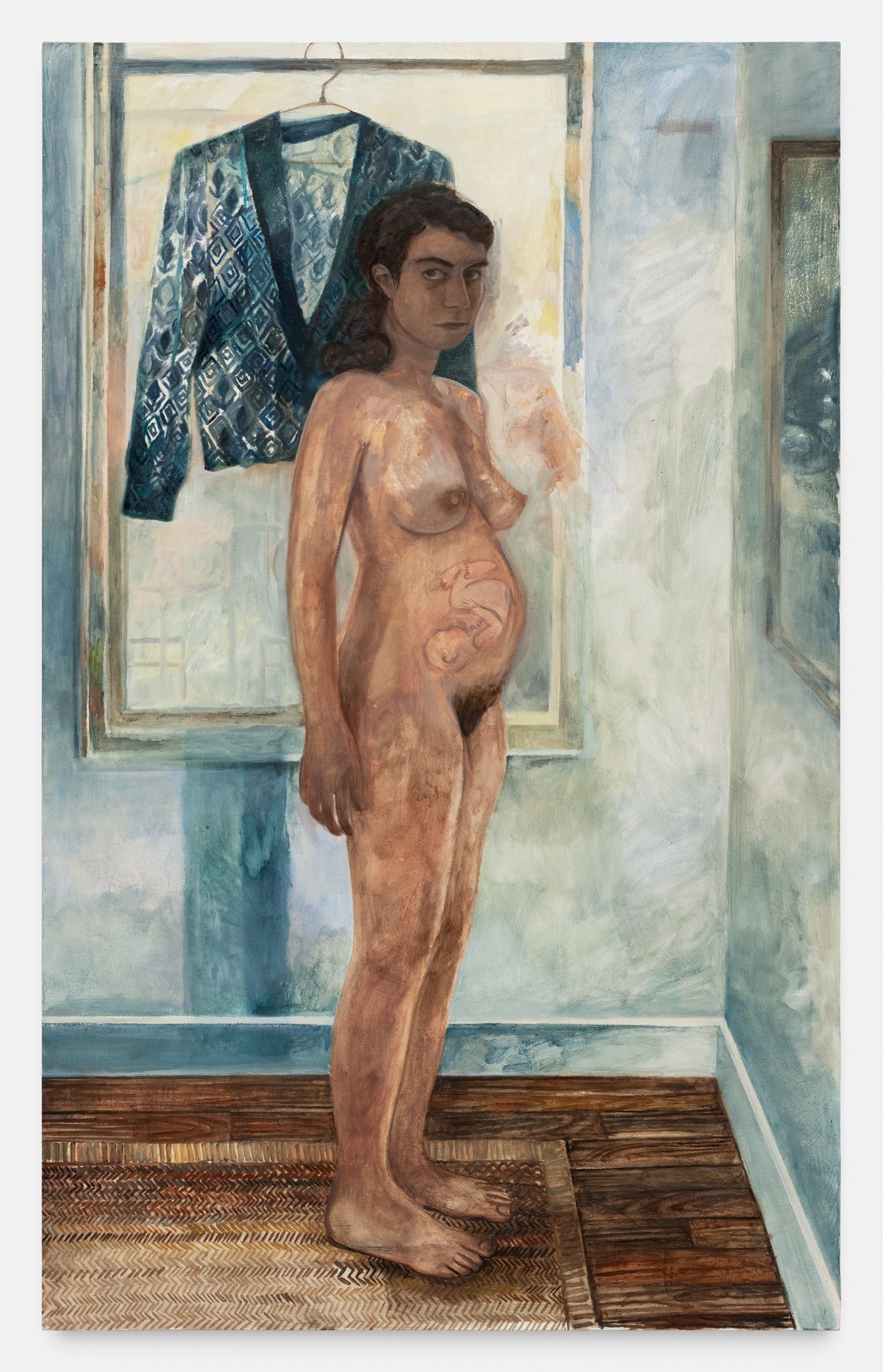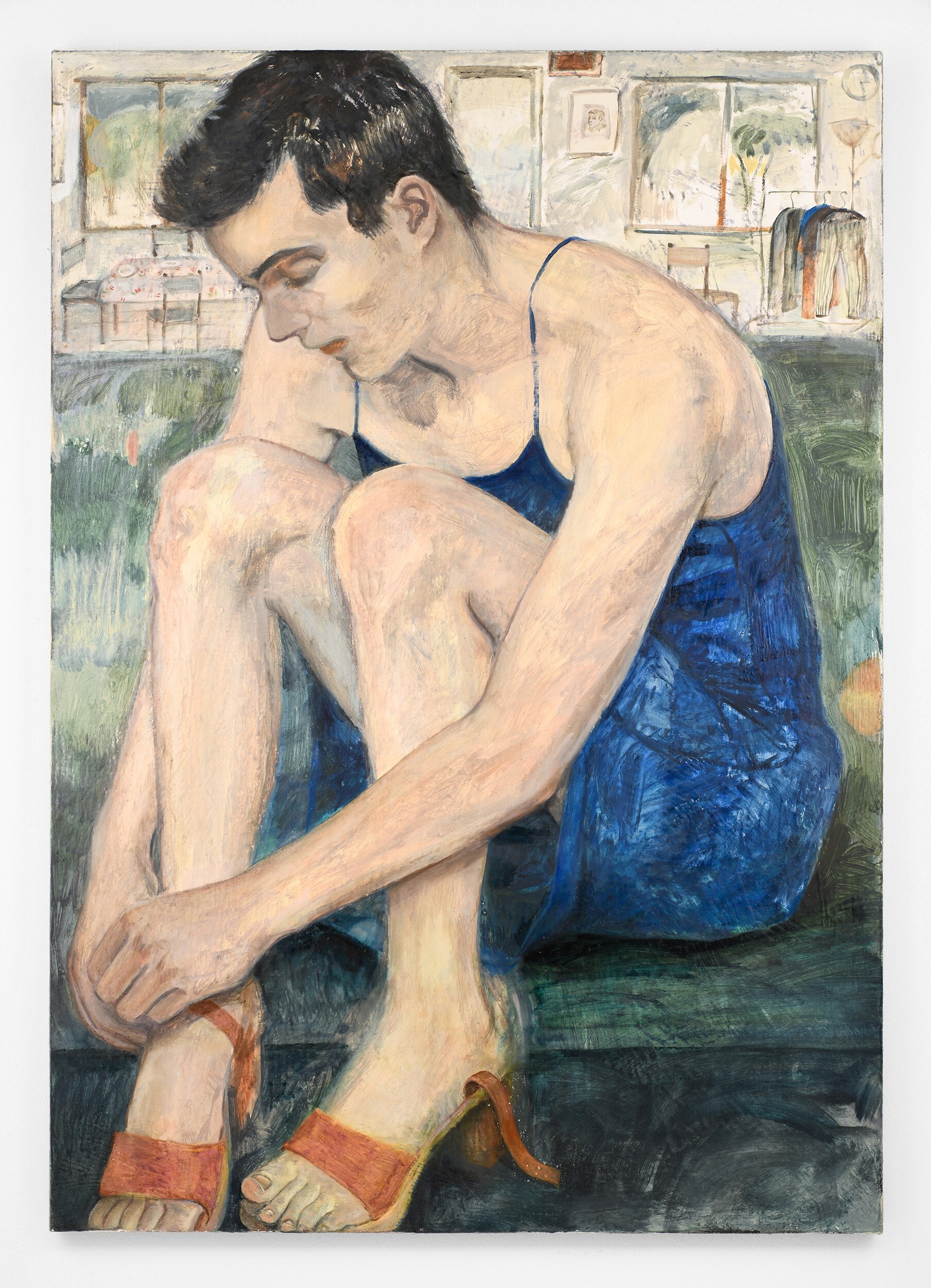 Herbelin’s works are also characterised by simplified forms and a deliberate flatness, both of which allow colour to shine as an expressive medium in its own right. Her palette is typically one of powdery, neutral shades enlivened by areas of pure, bright colour: the yellow wall-hanging carpet in Undivided Attention, the cobalt cardigan in Elisha, and the emerald studio sofa, for example. At times, works also reference each other as seen in the same patterned rug in both Elisha and Florian, creating a resonance within the body of work. An enigmatic work in the exhibition, Diner avec oiseaux, is a palimpsest in which two different paintings merge to create a surreal, almost mystical image. Herbelin often reuses canvases, painting over earlier works that retain a ghostly presence in the more recent one. As here, where a dinner party was painted both across, but also around, a pedagogical painting of birds. In this scene, the quotidian and other-worldly converge.