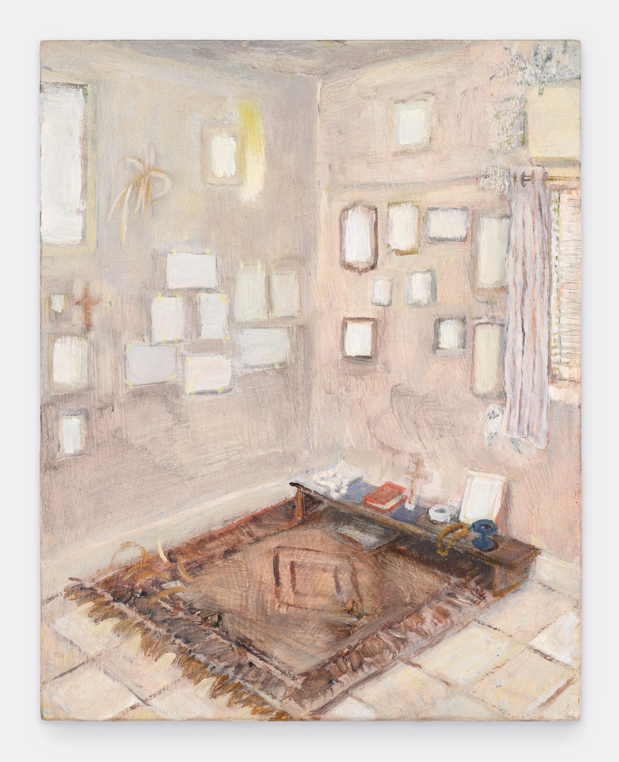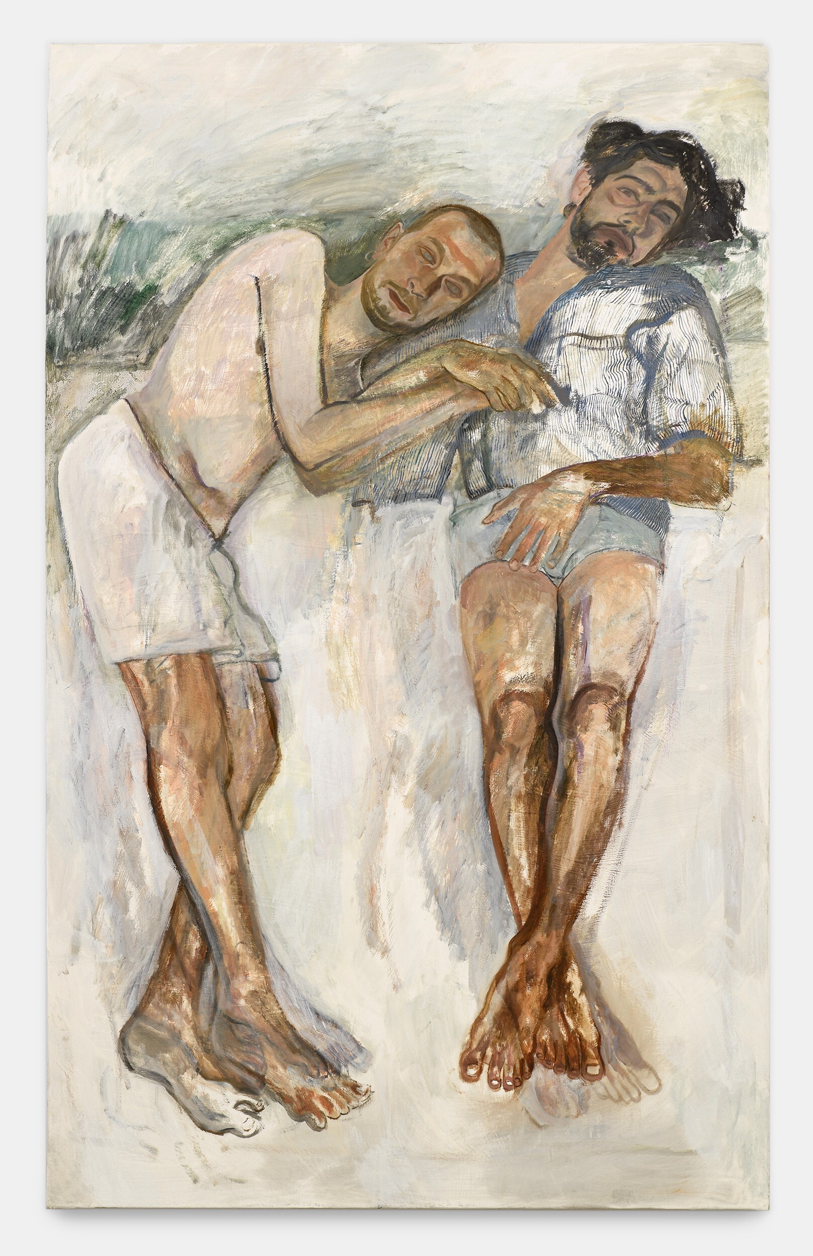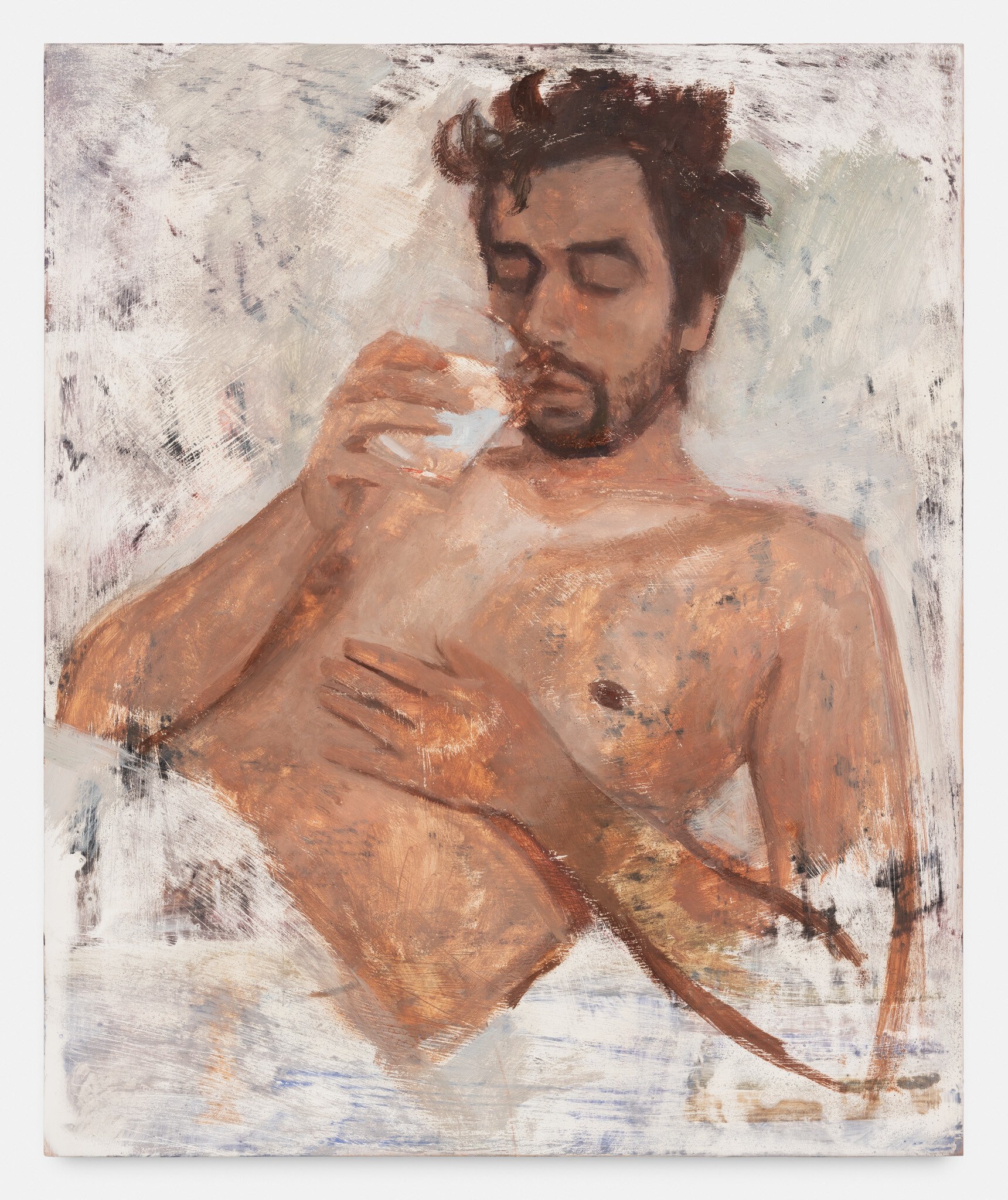 For her debut exhibition at the gallery, Undivided Attention, French-Israeli artist Nathanaëlle Herbelin presents a series of paintings that capture the sensations of lived experience, and the intimate bond between art and life. People take centre stage. Friends, fellow artists, family members, her partner, neighbours, and occasionally strangers, are all captured in quiet portraits that bear witness to an intense act of physical and psychological observation. The settings are simple — bedrooms, bathrooms, domestic spaces, her studio — and the details sparse. In today’s fast-paced, ever-connected world, Herbelin explores the subject of focus and what it means to give someone, or something, your undivided attention.