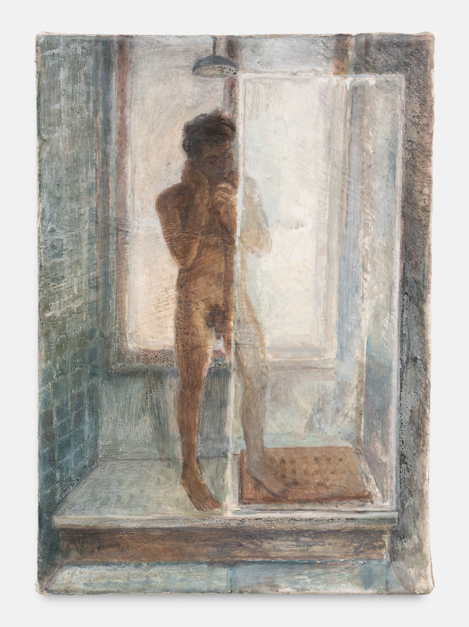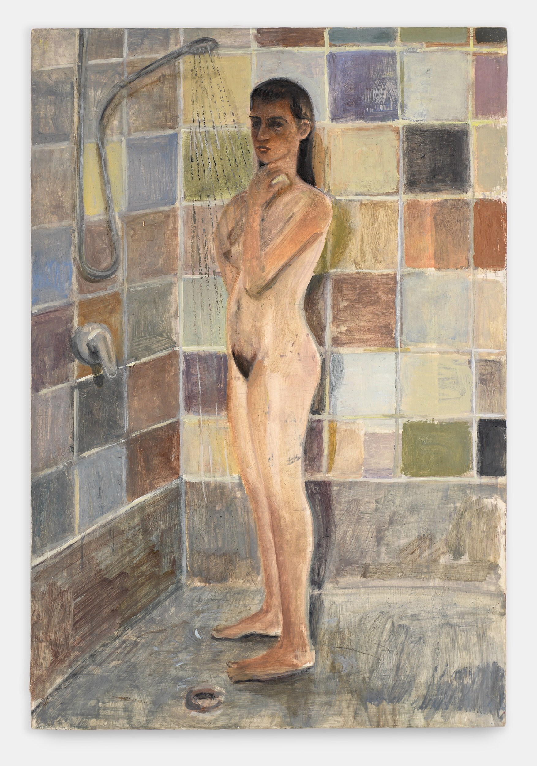 Nathanaëlle Herbelin’s portraits capture moments of unguarded intimacy. People are often engaged in rituals that are performed without thinking, such as bathing or showering, or even just sleeping. Herbelin’s delicate observation of her milieu is like a contemporary form of intimism, as practiced by Bonnard and Vuillard at the turn of the last century. In scenes painted from life, Herbelin is not so much documenting people’s likenesses but their presence, a specific atmosphere and a point of connection, exchange or mutual understanding. Couples are a key theme throughout the exhibition, as depicted in the portrait of long-standing partners, Simon et Sabrine, or in the recurrent paintings of Herbelin’s partner, Jeremie. These images allude to love and fidelity, but also to a curiosity about the dynamics of enduring relationships. The paintings Elisha and Florian, on the other hand, which were both executed in 2022, hint at divergent lives. The former depicts the artist in New York, pregnant with her first child, Elisha, while the latter shows her friend, Florian, who lives life to the full in the Bronx. Both the same age, both artists, but separated by an ocean, both literally and figuratively, as their lives are so different.