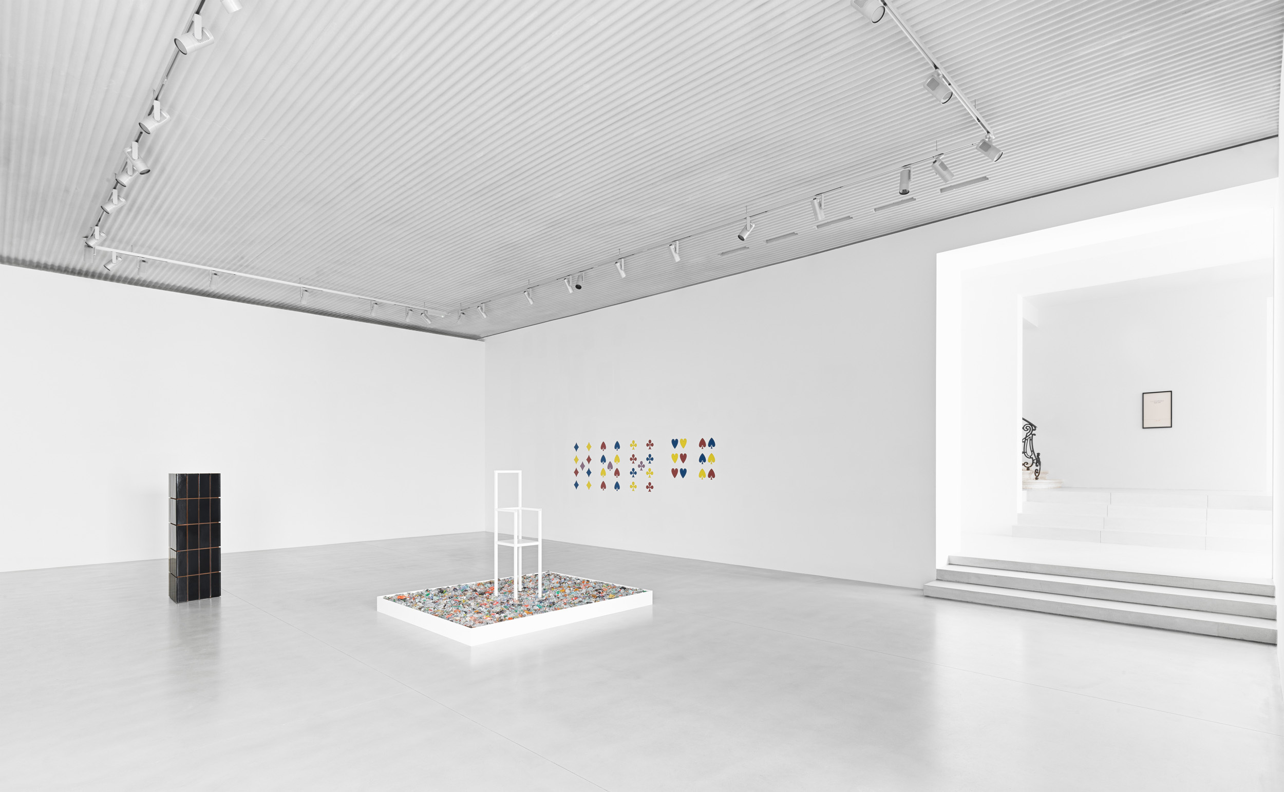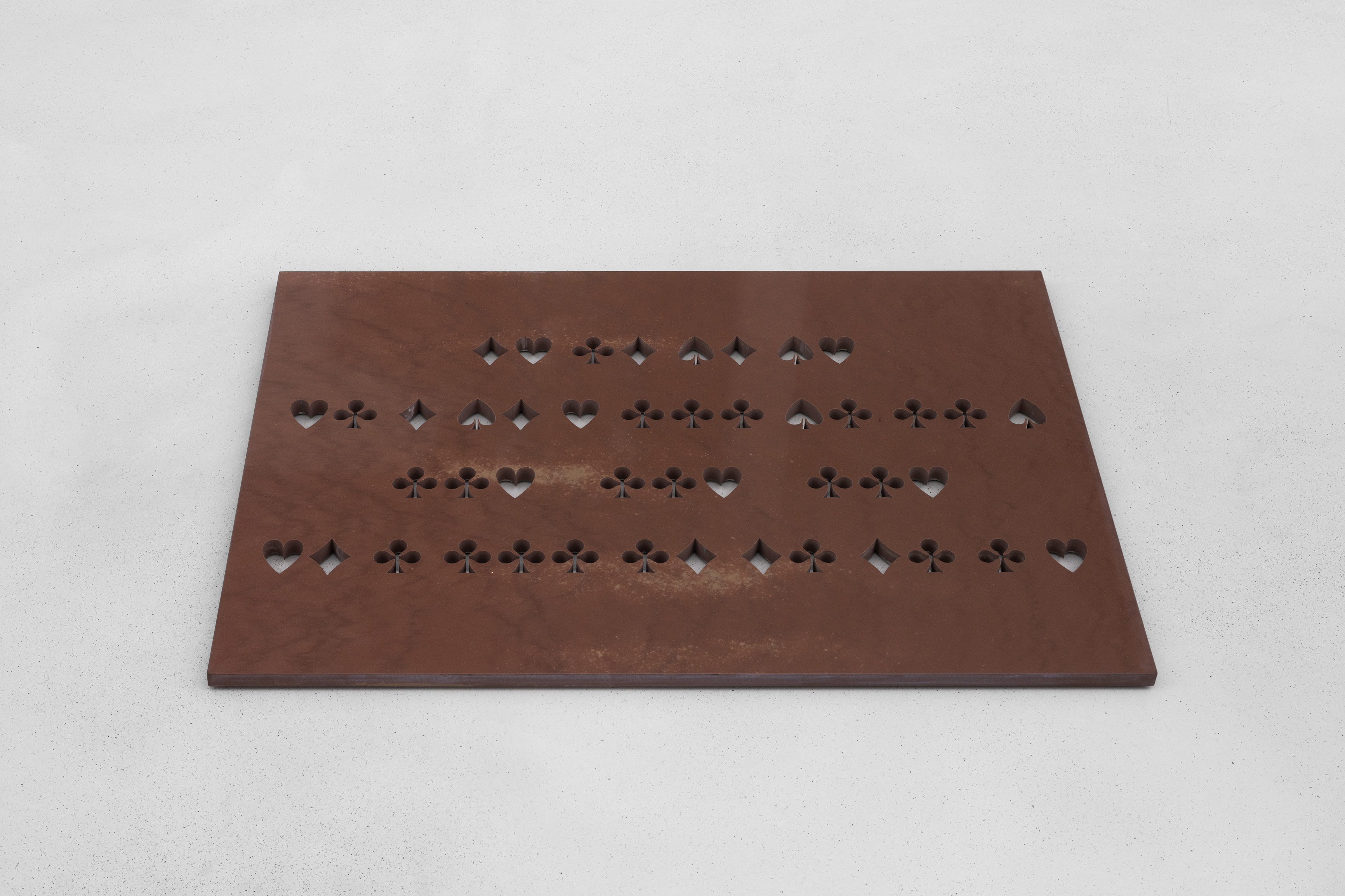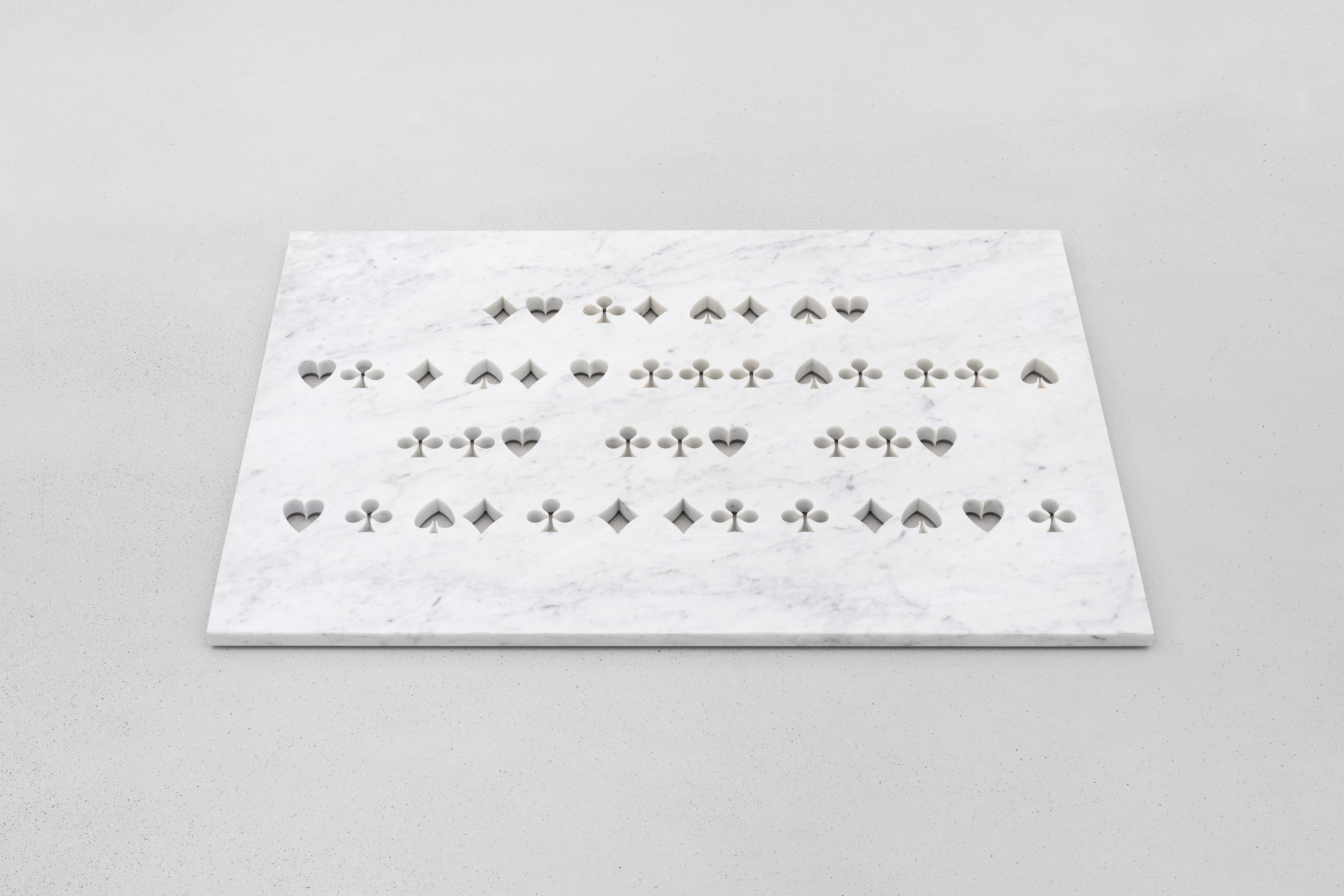 There was a line by Fernando Pessoa that Jan liked to quote: I would have liked to be a simple soul, a man of limited or lofty ambitions, married to the daughter of my washerwoman (‘The Book of Disquiet’). Vercruysse’s work is deeply marked by melancholia—a perverse longing for what is past and can never be again, or for what will never be at all. His art gives sculptural form to a feeling more often expressed in music or poetry. From his first monumental and solemn Tombeaux (a tomb but also a poem to celebrate the dead) or Atopies (simultaneously a non-site and the absence of utopia), Vercruysse moves towards more playful works that integrate tropes such as playing cards, labyrinth, glass marbles or music. He introduces colour, coded languages and deadpan humour. I believe that this prolific period has not yet received the attention it deserves. It represents the other side of the coin: a celebration of earthly pleasures—the things that make life bearable when happiness is unattainable.