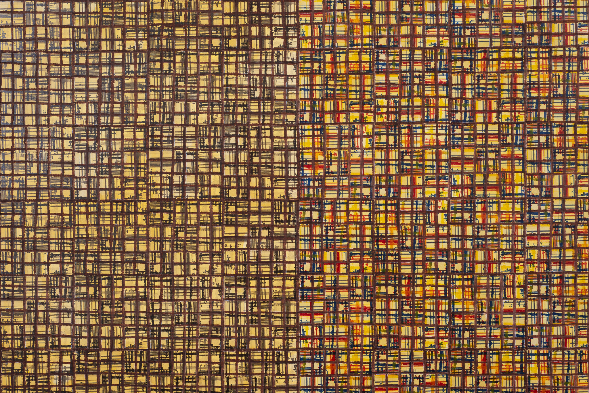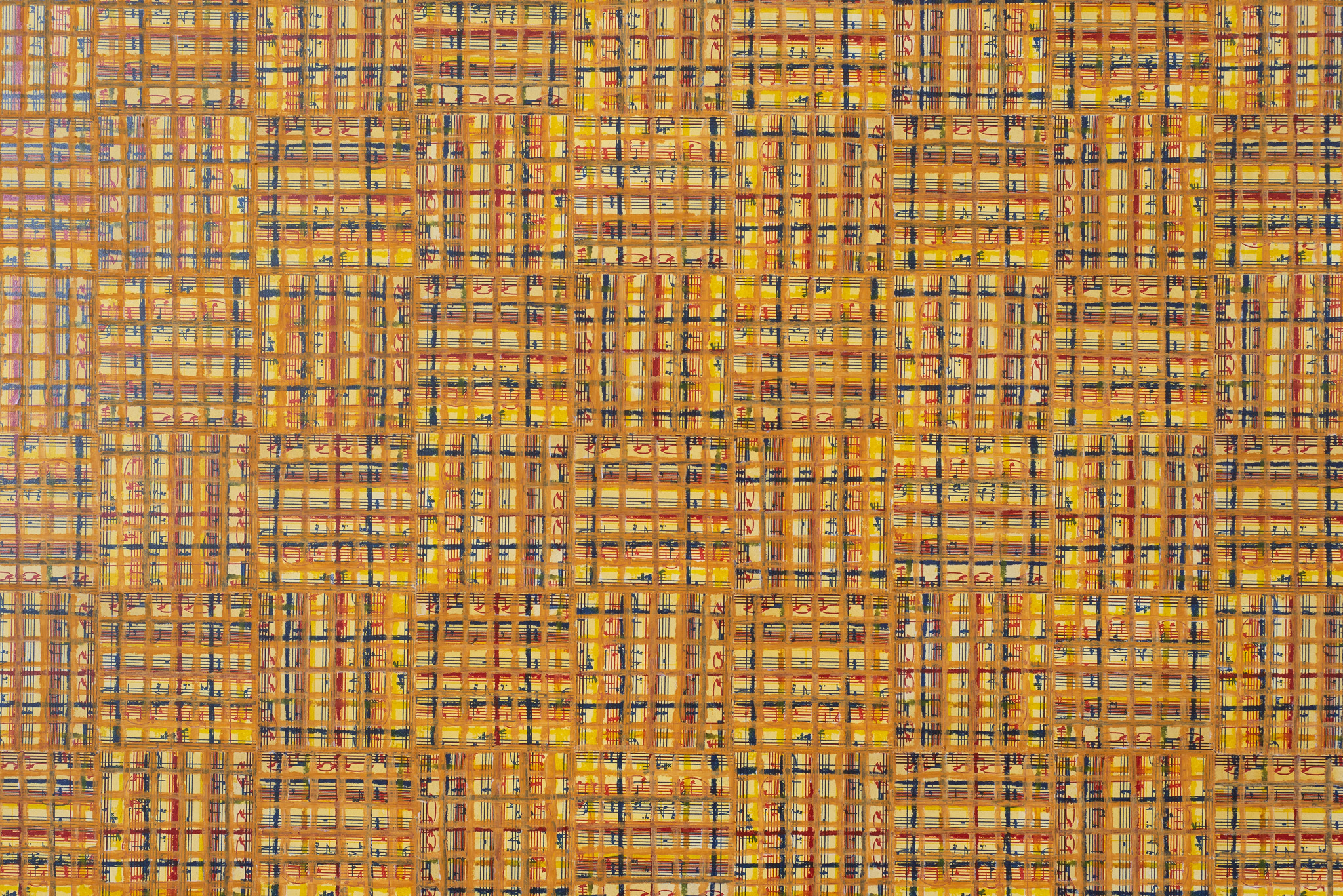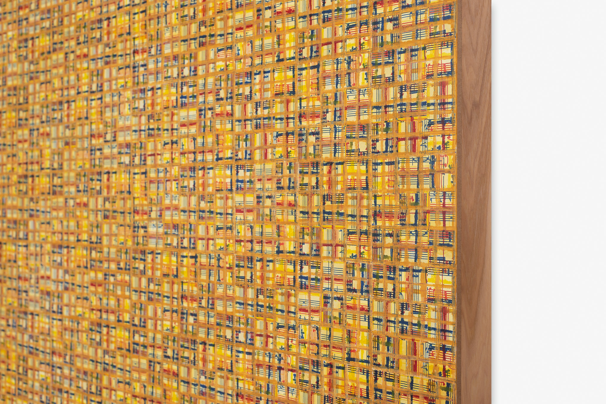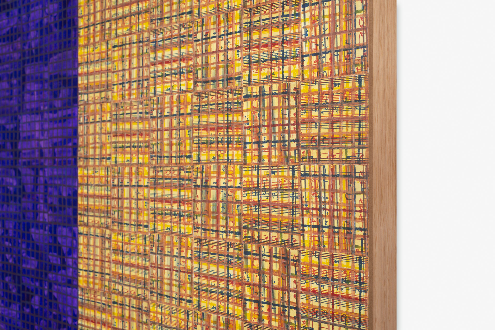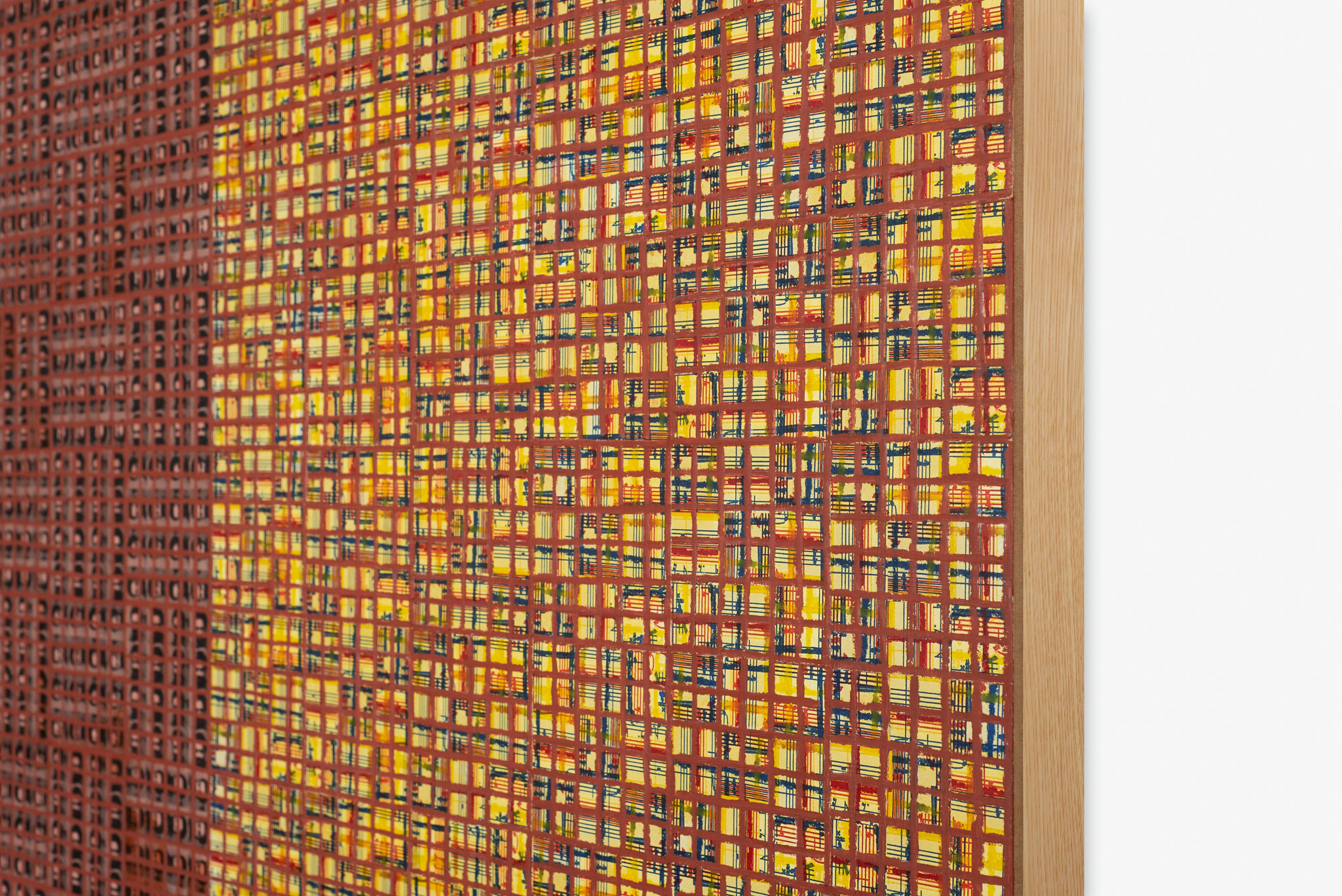 The ‘under conscious’ — whether autobiographical or music related — is a hall-mark of Binion’s work and is usually composed of printed material. On top of this, the artist adds a heavy layer of paint-stick marks. The visual language is that of minimalism and abstraction: lines, serial patterns and geometric shapes. To borrow a musical term, the works have a binary form, with the two elements ultimately merging into an indivisible whole. This interweaving, which lies at the core of Binion’s practice, creates multiple fields of tension: between the personal and impersonal, between mech-anical reproduction and slow, labour-intensive mark-making, and between the revealment and concealment of the ‘under conscious’. The works not only testify to Binion’s sustained interest in music but also his belief in learning to look by listening, and likewise, to listen by looking. As he himself states, the works in the Visual:Ear series represent “the clarification of [his] character as a painter.”