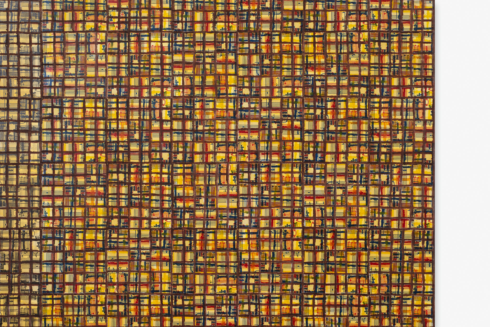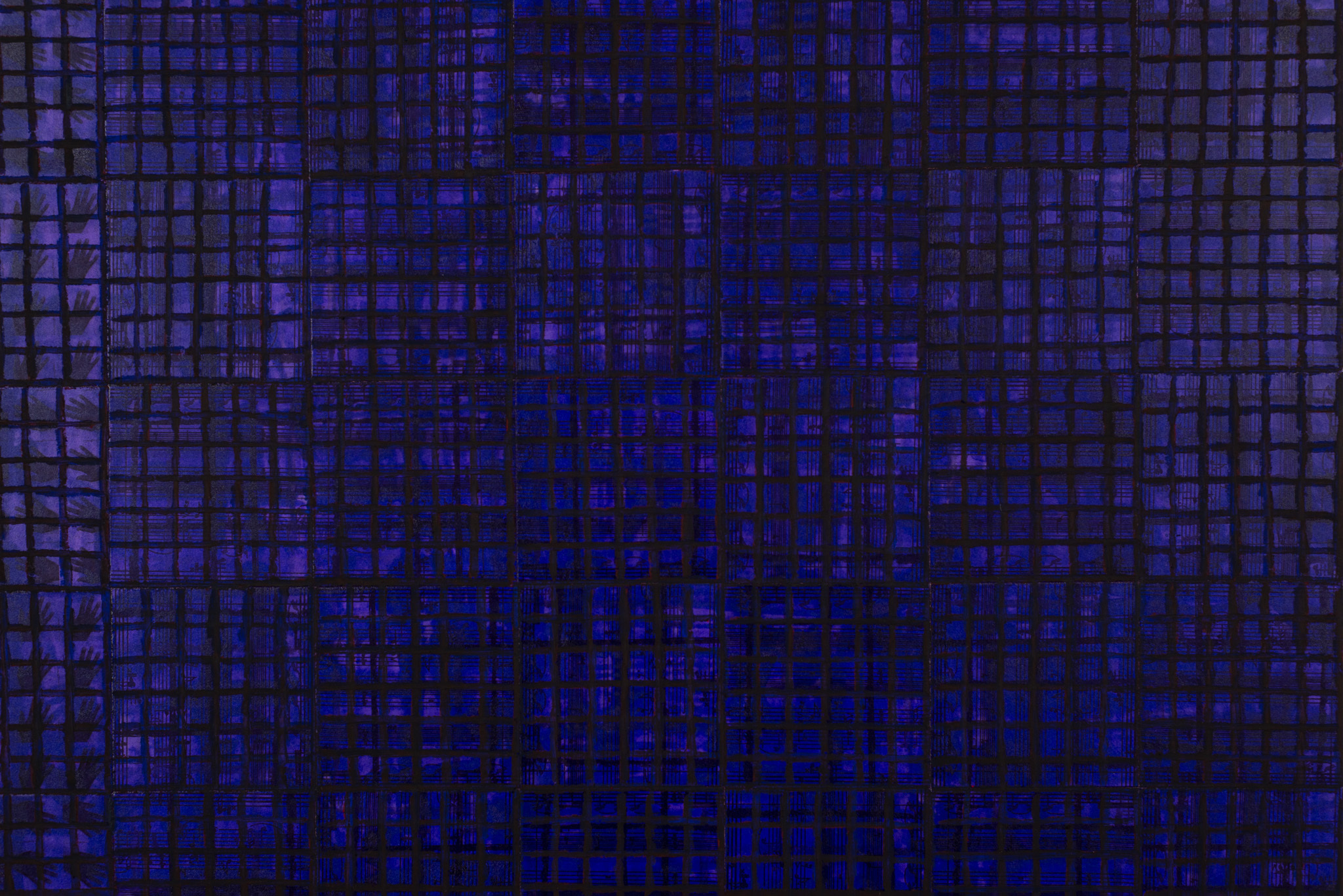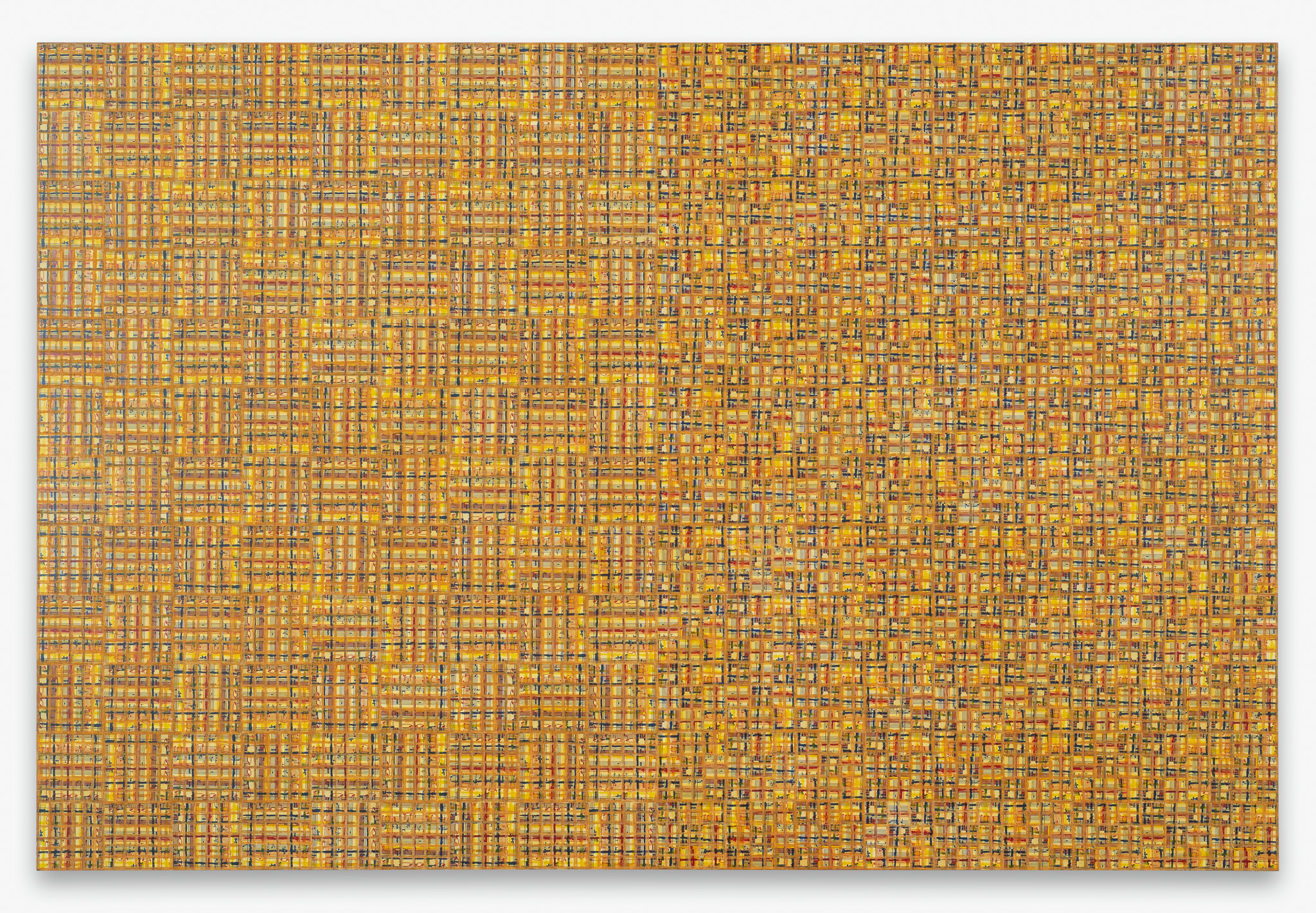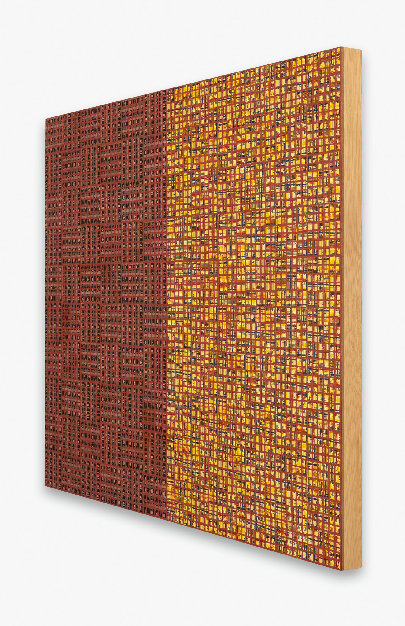The ‘under conscious’ — whether autobiographical or music related — is a hall-mark of Binion’s work and is usually composed of printed material. On top of this, the artist adds a heavy layer of paint-stick marks. The visual language is that of minimalism and abstraction: lines, serial patterns and geometric shapes. To borrow a musical term, the works have a binary form, with the two elements ultimately merging into an indivisible whole. This interweaving, which lies at the core of Binion’s practice, creates multiple fields of tension: between the personal and impersonal, between mech-anical reproduction and slow, labour-intensive mark-making, and between the revealment and concealment of the ‘under conscious’. The works not only testify to Binion’s sustained interest in music but also his belief in learning to look by listening, and likewise, to listen by looking. As he himself states, the works in the Visual:Ear series represent “the clarification of [his] character as a painter.”