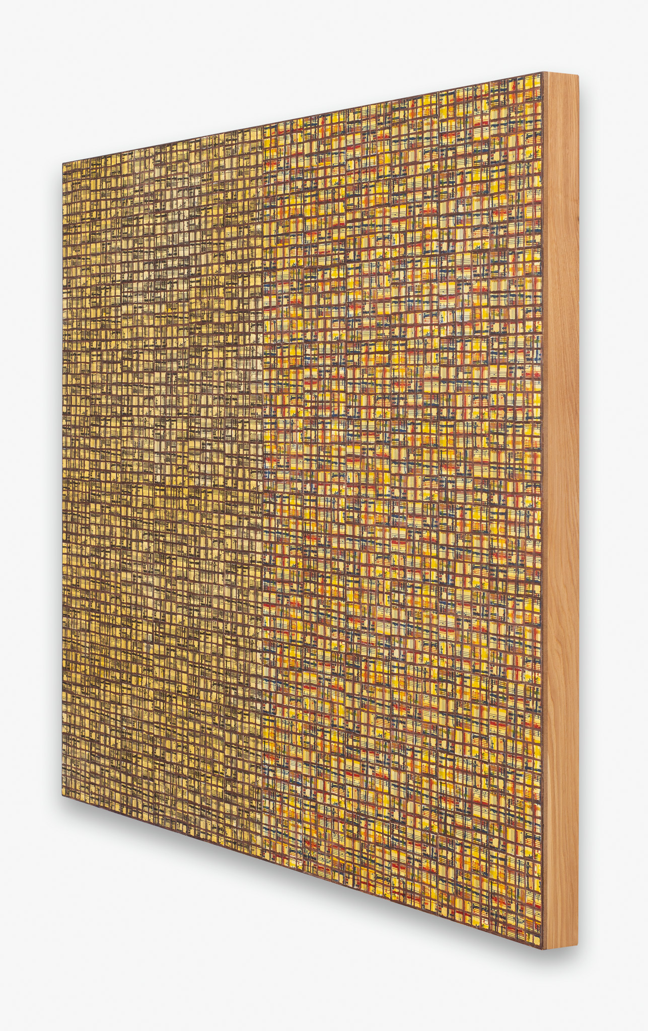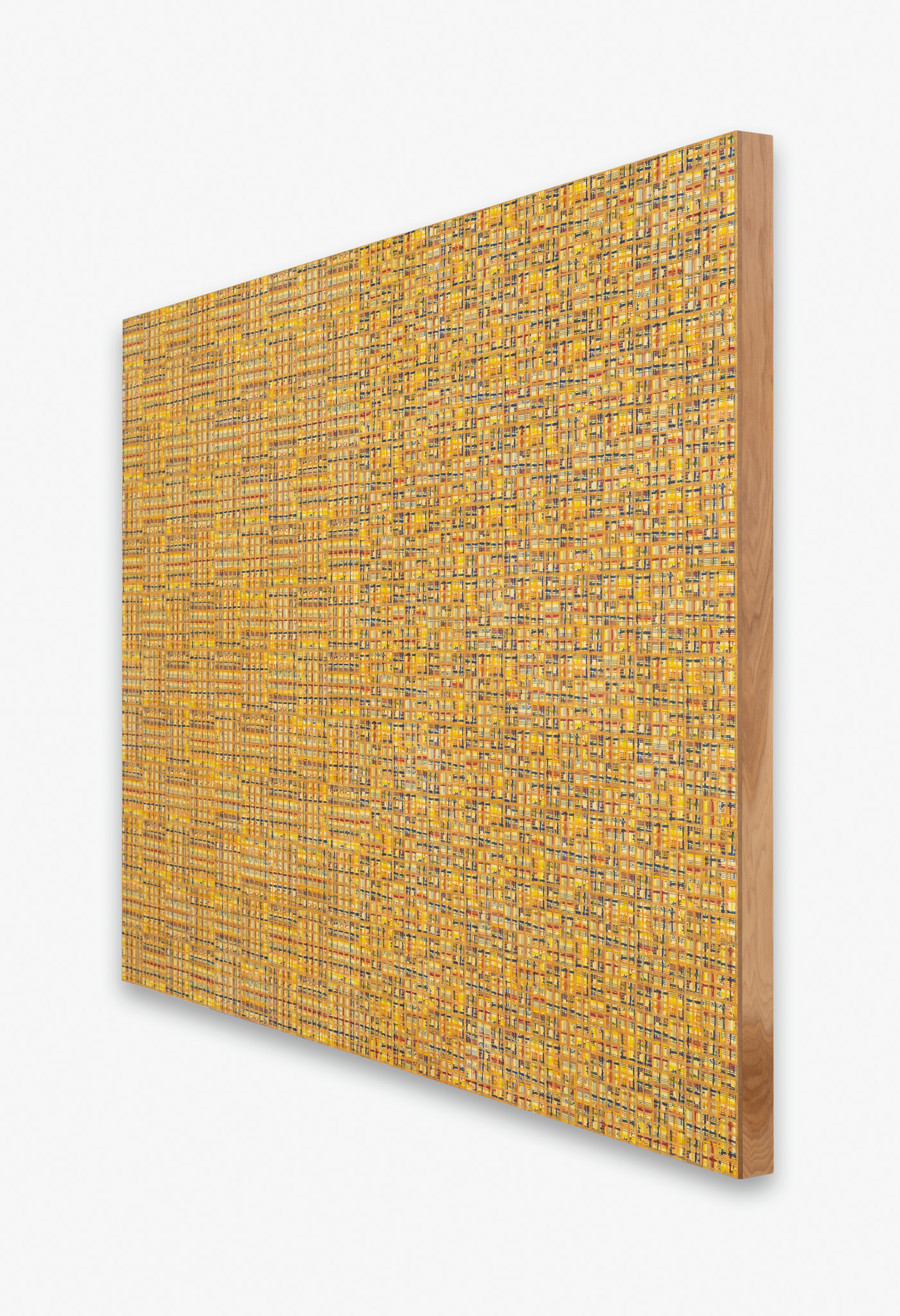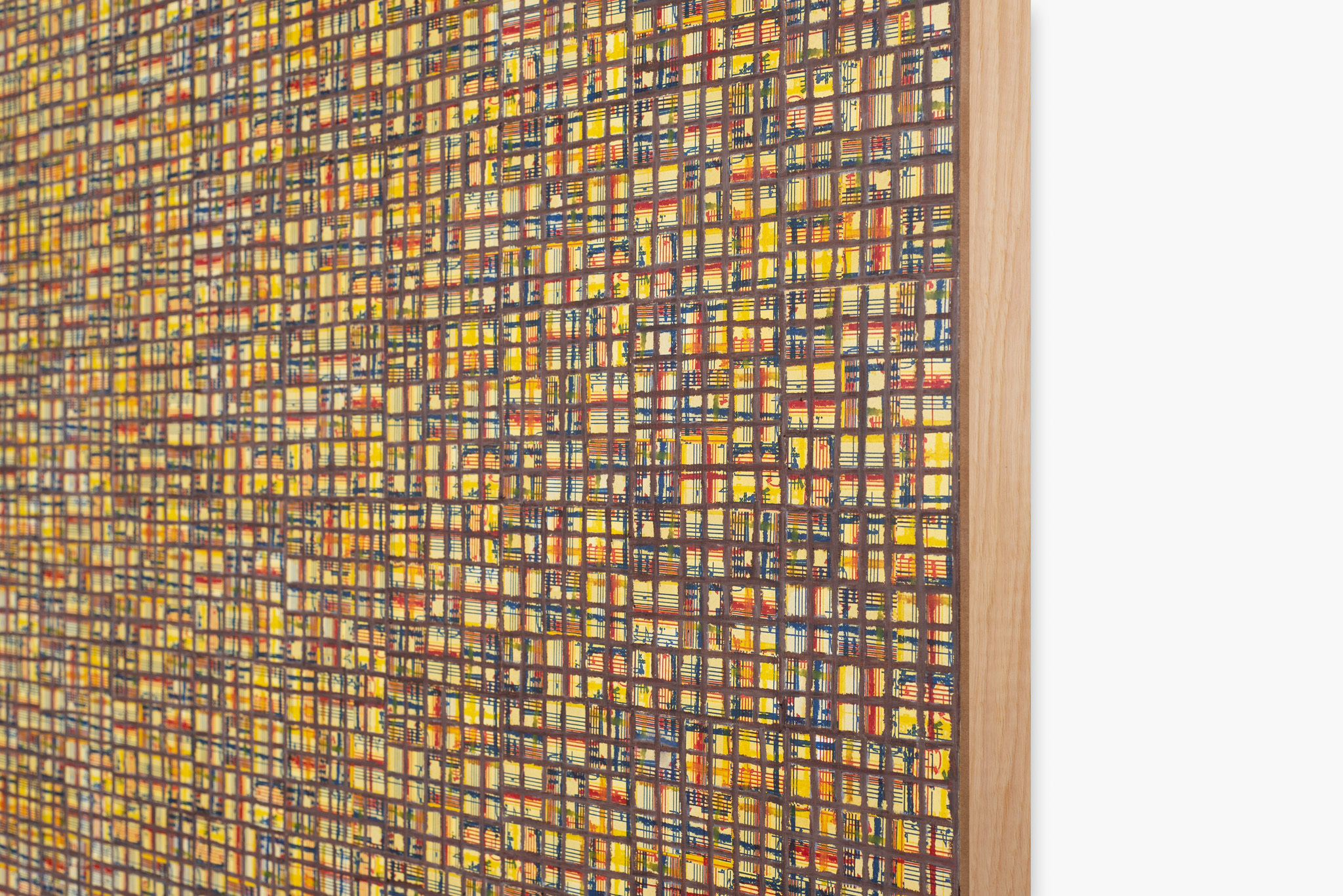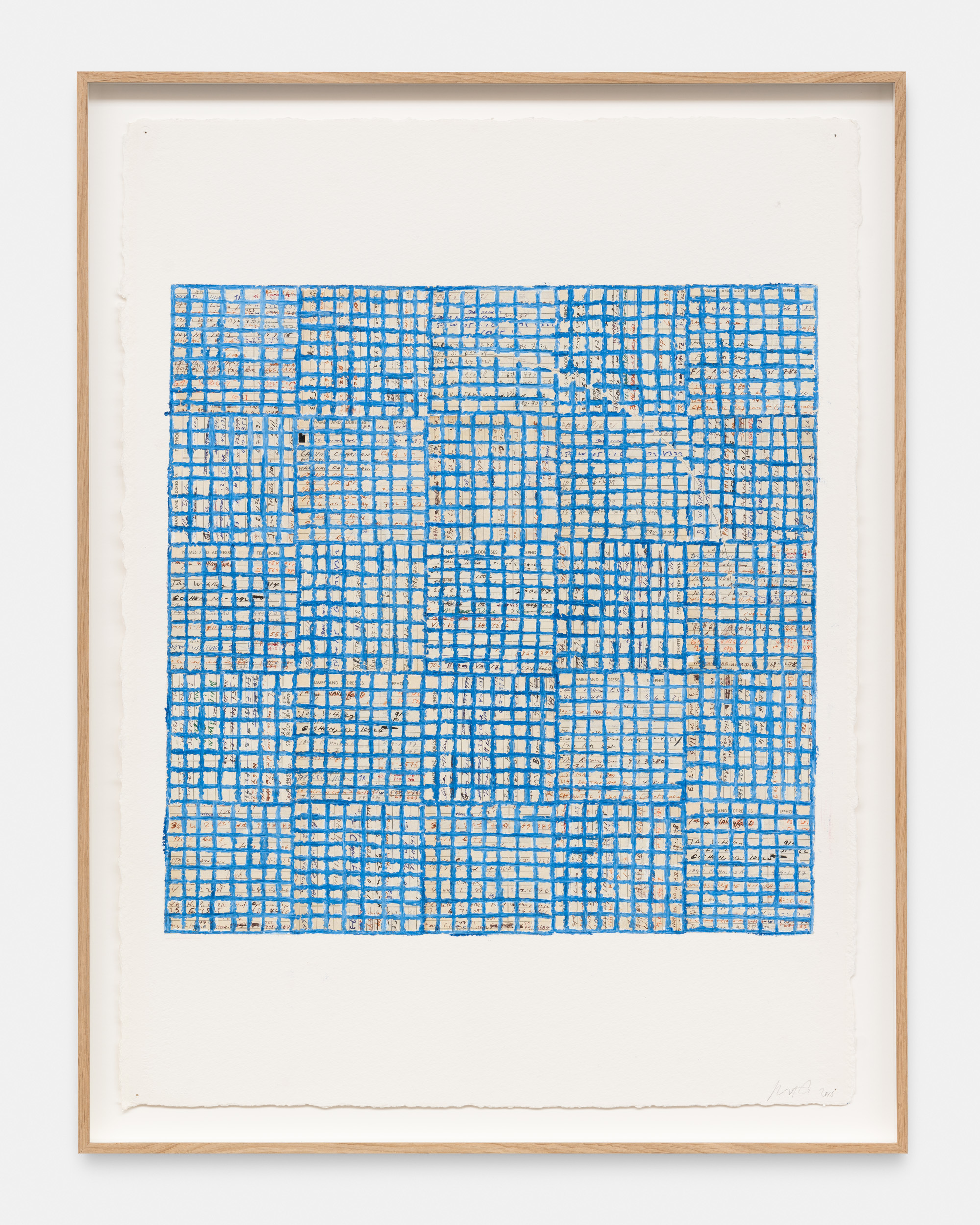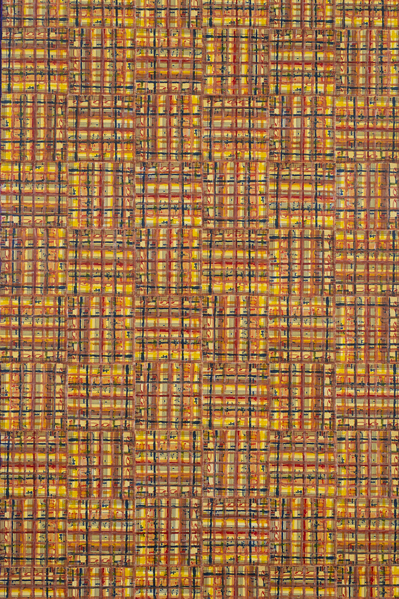 The ‘under conscious’ — whether autobiographical or music related — is a hall-mark of Binion’s work and is usually composed of printed material. On top of this, the artist adds a heavy layer of paint-stick marks. The visual language is that of minimalism and abstraction: lines, serial patterns and geometric shapes. To borrow a musical term, the works have a binary form, with the two elements ultimately merging into an indivisible whole. This interweaving, which lies at the core of Binion’s practice, creates multiple fields of tension: between the personal and impersonal, between mech-anical reproduction and slow, labour-intensive mark-making, and between the revealment and concealment of the ‘under conscious’. The works not only testify to Binion’s sustained interest in music but also his belief in learning to look by listening, and likewise, to listen by looking. As he himself states, the works in the Visual:Ear series represent “the clarification of [his] character as a painter.”