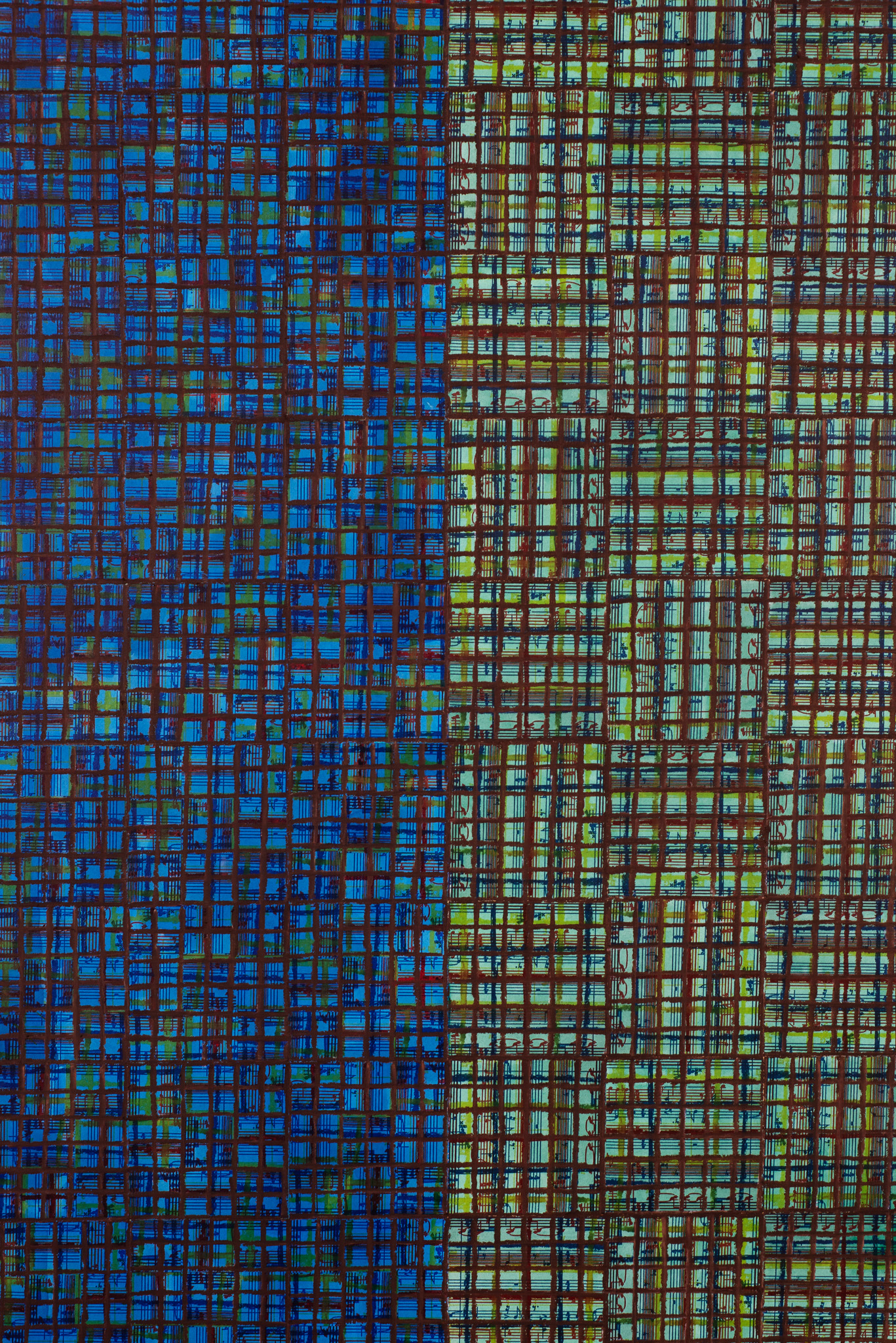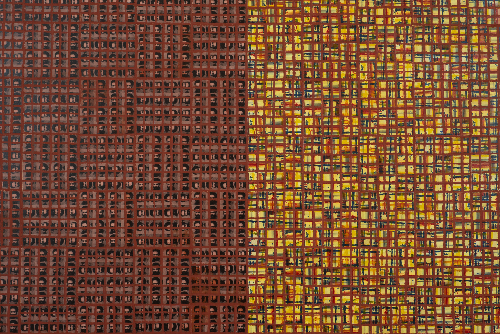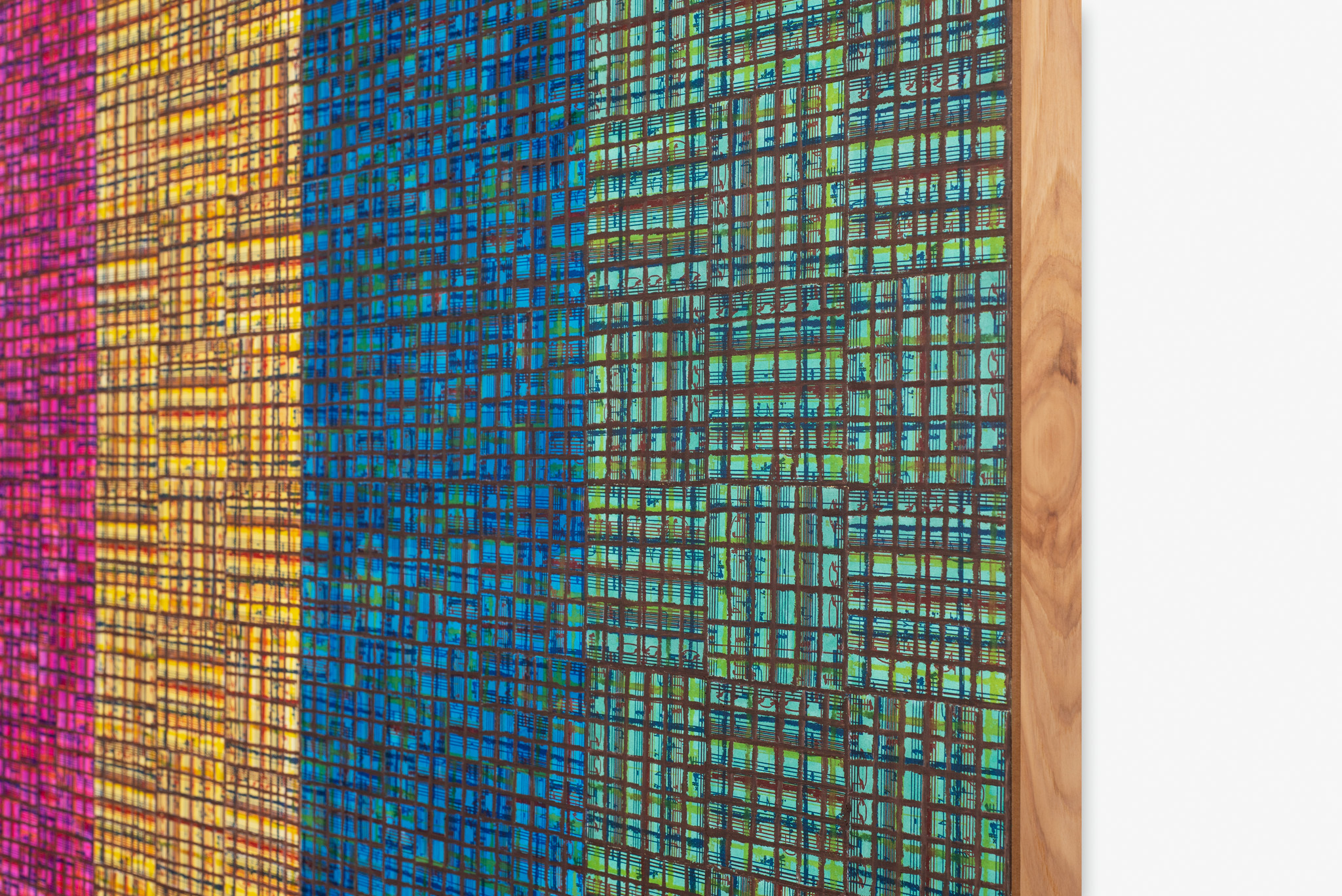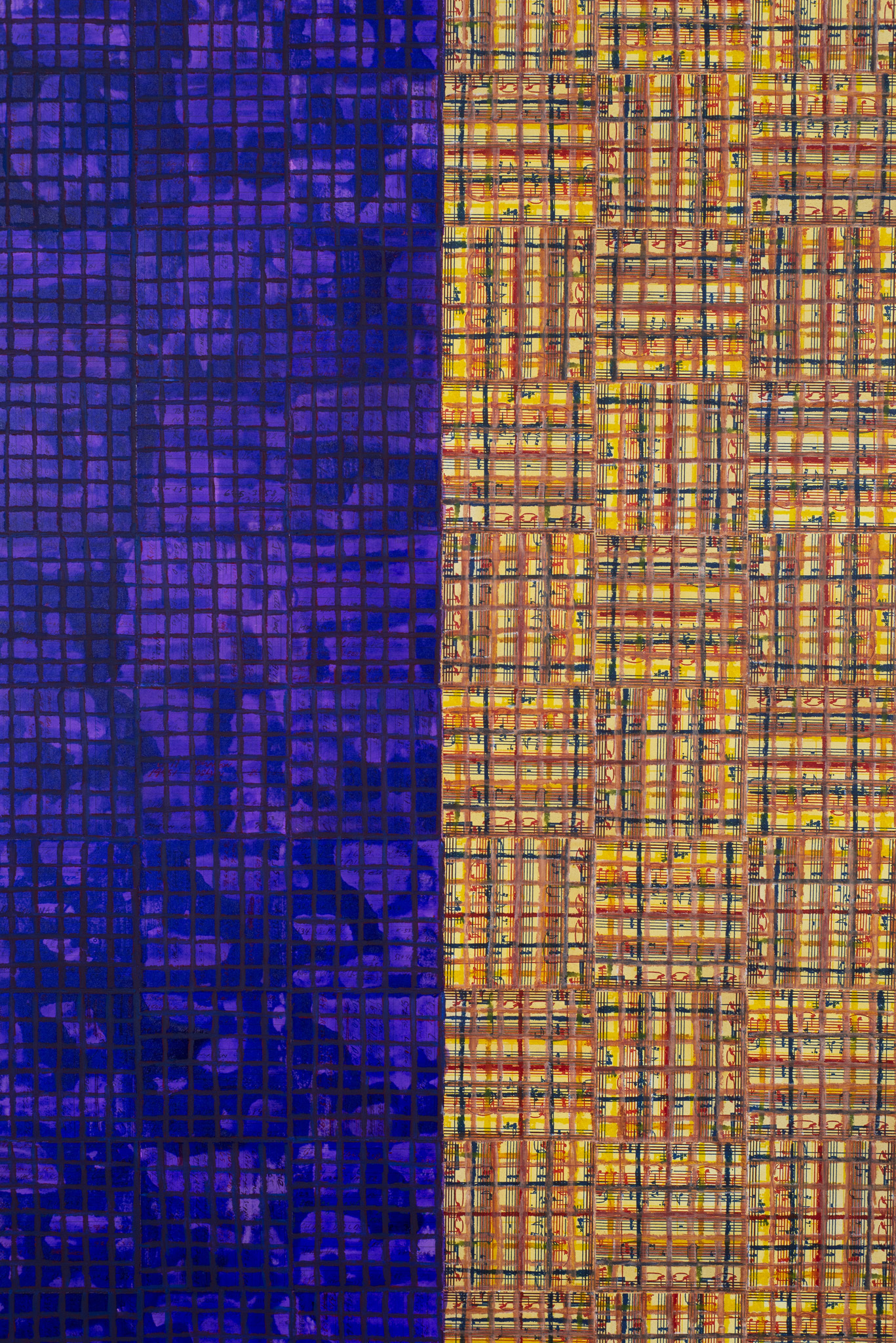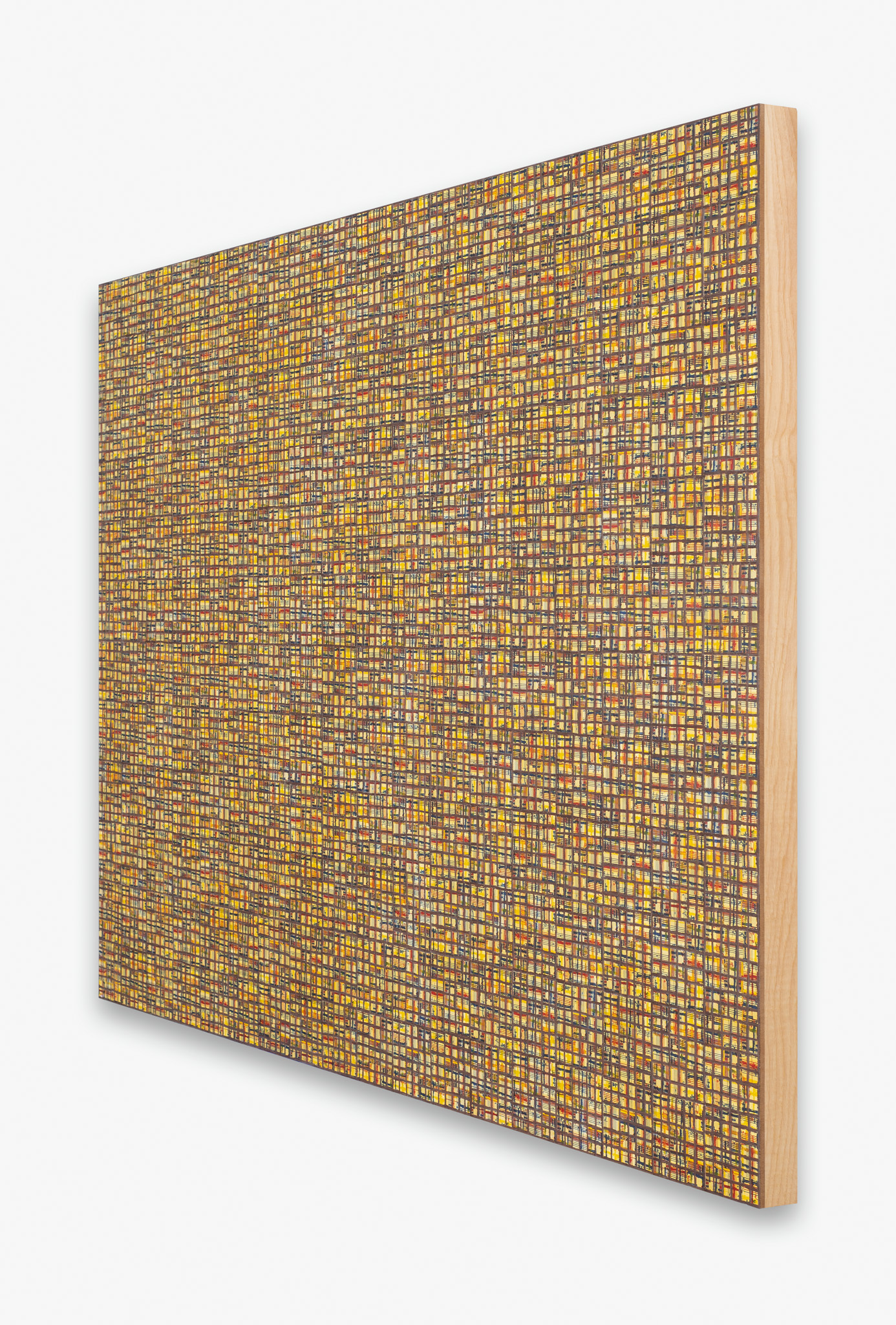 The ‘under conscious’ — whether autobiographical or music related — is a hall-mark of Binion’s work and is usually composed of printed material. On top of this, the artist adds a heavy layer of paint-stick marks. The visual language is that of minimalism and abstraction: lines, serial patterns and geometric shapes. To borrow a musical term, the works have a binary form, with the two elements ultimately merging into an indivisible whole. This interweaving, which lies at the core of Binion’s practice, creates multiple fields of tension: between the personal and impersonal, between mech-anical reproduction and slow, labour-intensive mark-making, and between the revealment and concealment of the ‘under conscious’. The works not only testify to Binion’s sustained interest in music but also his belief in learning to look by listening, and likewise, to listen by looking. As he himself states, the works in the Visual:Ear series represent “the clarification of [his] character as a painter.”
