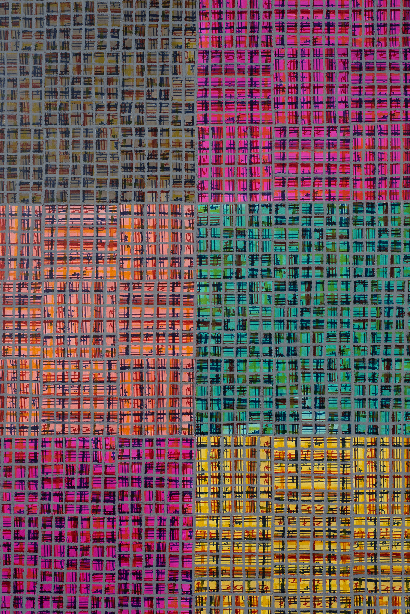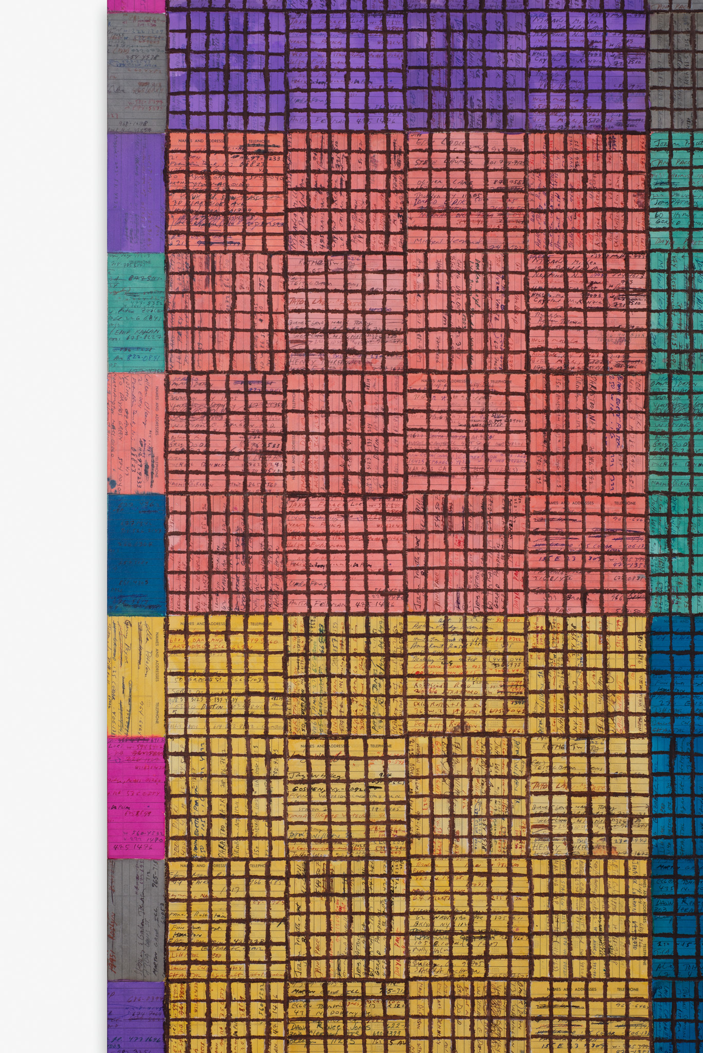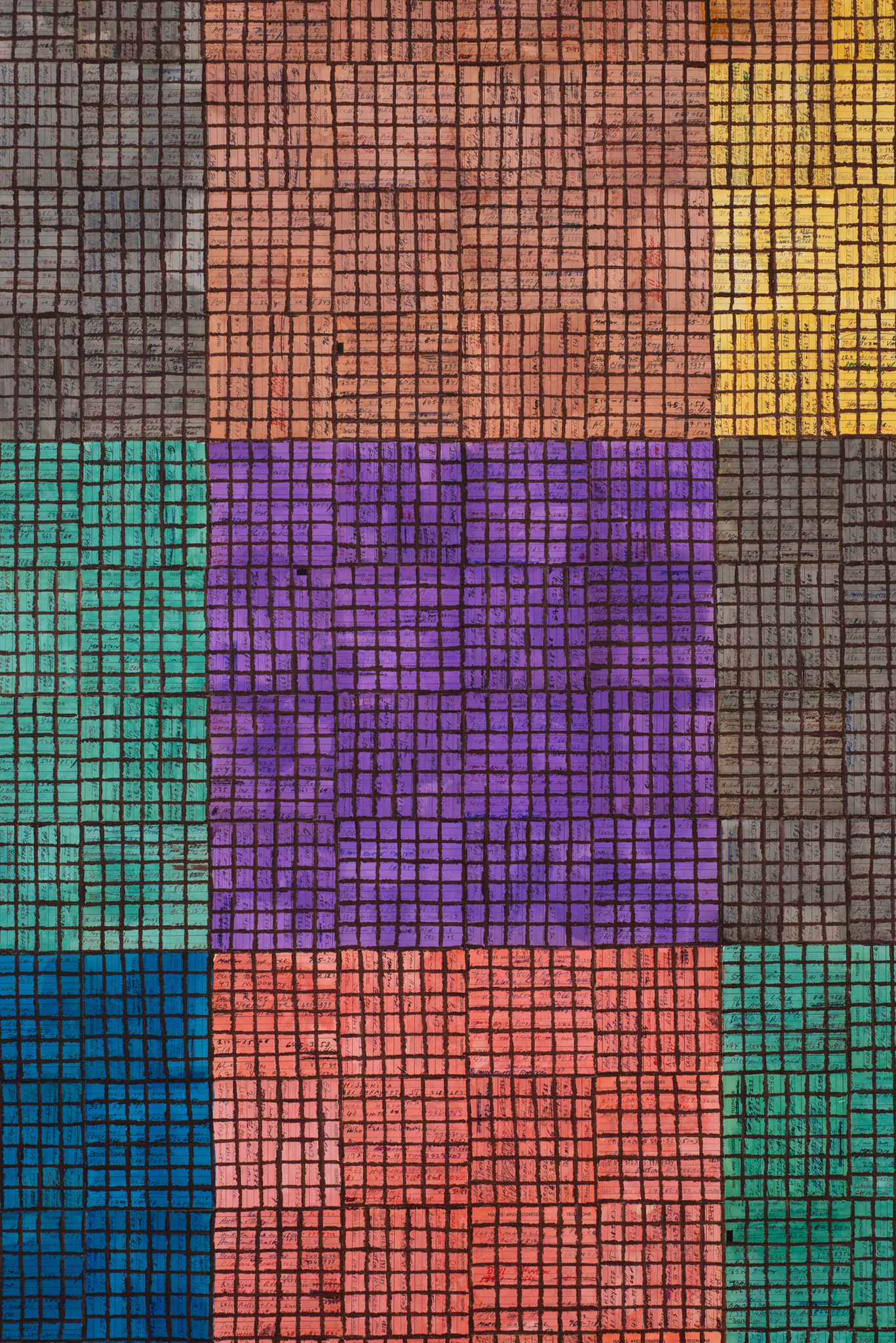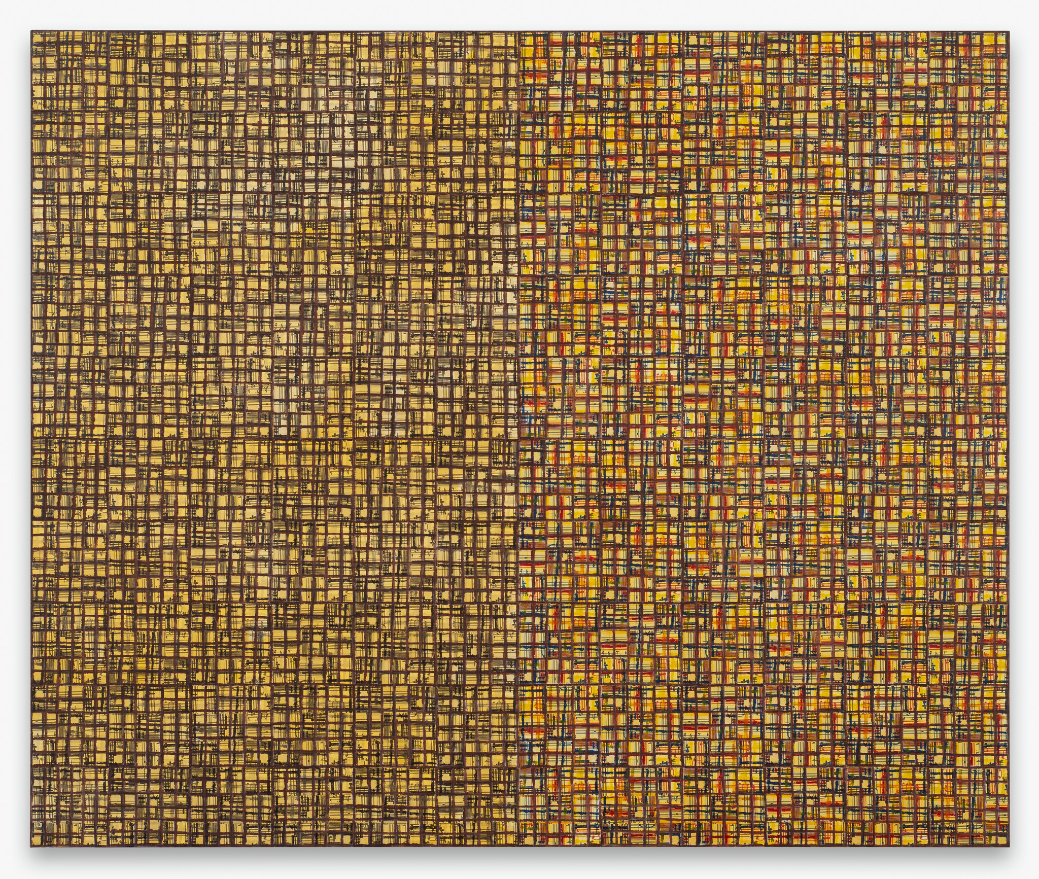 The paintings in Visual:Ear draw a decisive loop in Binion’s work and hark back to an idea that first crystalised over fifty years ago, while he was studying for his MFA in painting at Cranbrook Academy of Art in Bloomfield Hills, Michigan. Deeply immersed in music, especially jazz, Binion became fascinated by non-verbal means of communicating his experiences. His earliest work on the theme was Drawn Symphony:in:Sane Minor (1971), a hand-drawn image atop ten pages of musical manuscript paper. The term ‘visual ear’ also dates from this period, with Binion first using it in his 1973 graduate thesis. These works — which represent Binion’s earliest attempts to convey the rhythms and sensations of music in words and images — remained dormant in his mind, but nonetheless present, until they were reactivated and visualised for his on-going series of Visual:Ear paintings. The works make use of an abstracted, collaged image of a musical score, Still Standing Stuttering, by Pulitzer prize-winning composer Henry Threadgill (b. 1944), which Binion personally commissioned as a response to his painting Stuttering:Standing:Still (2013). The images in Visual:Ear are made up of varied compositions of Still Standing Stuttering. The inclusion of the printed music represents an unprecedented opening up of the oeuvre to external influences. Prior, Binion had almost exclusively used autobiographical source material in his work, most famously pages from his address book or passport, photos of his childhood home, his hands, or historical images pertaining to his early life in rural Mississippi. Working with the music score images was the catalyst for a quatre mains of sorts, one that resulted in what Binion calls the ‘under conscious’ of the work. The Visual: Ear paintings are a “handmade, geometric way to insert the music score into the work.”