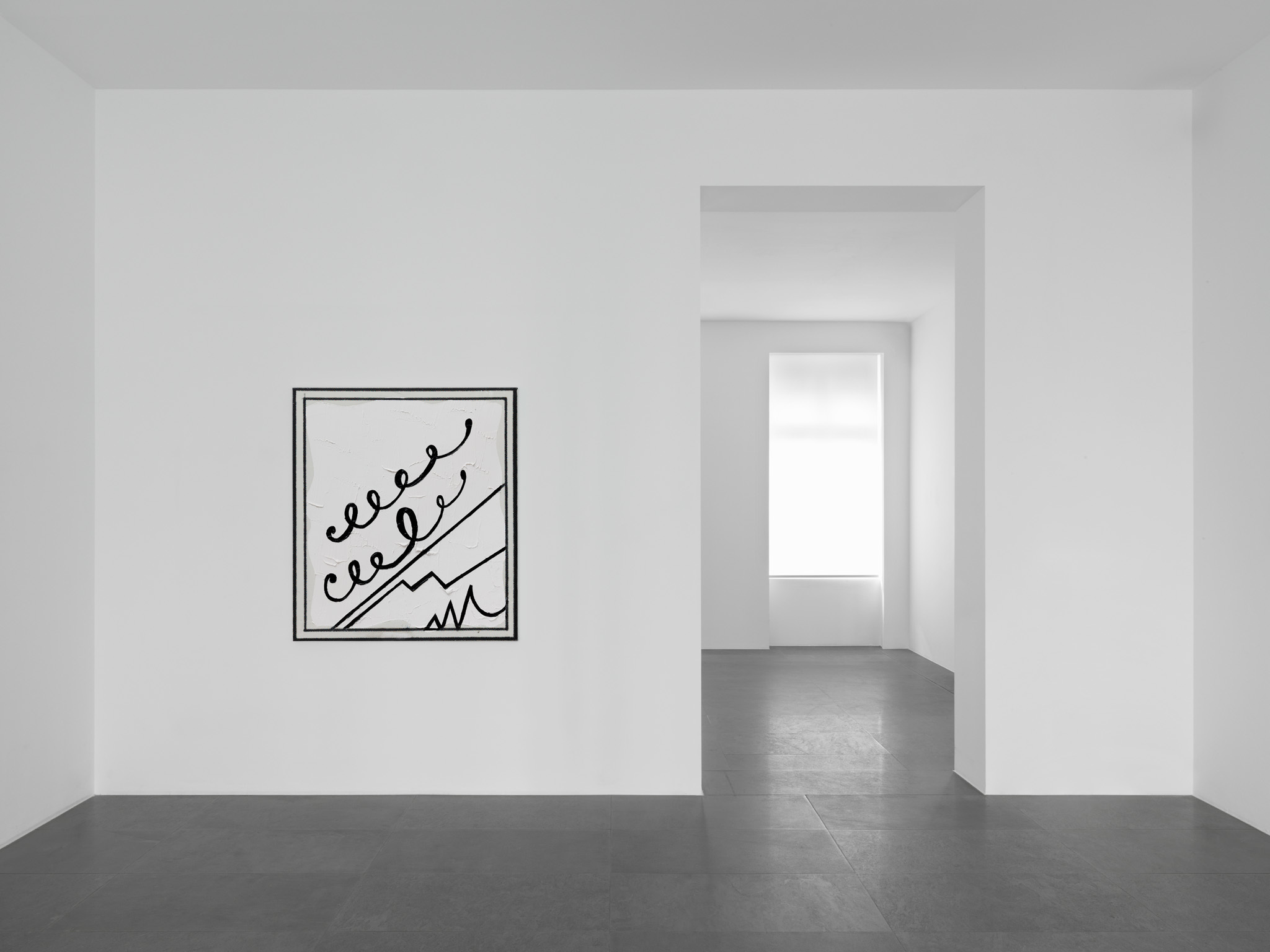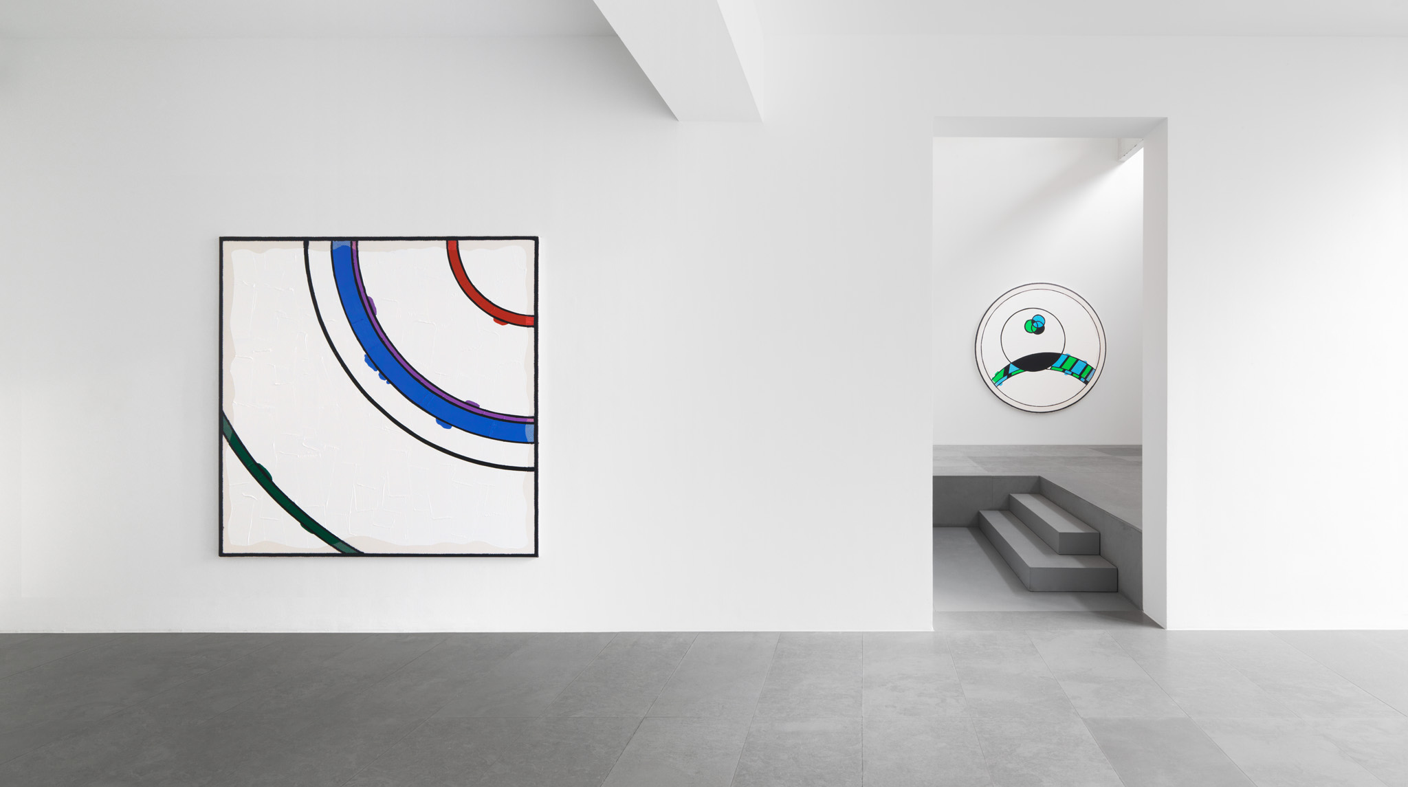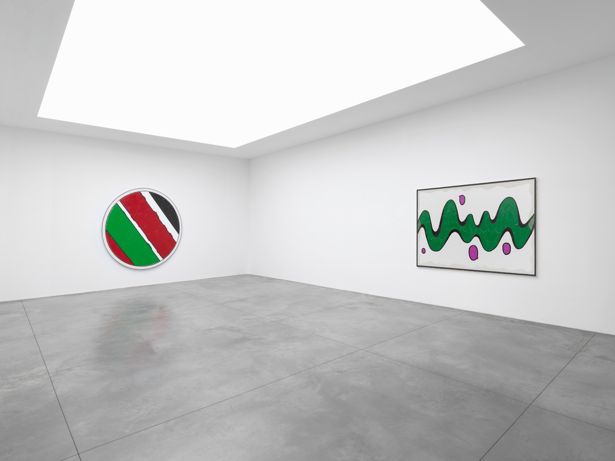 At the heart of the presentation is a new series of paintings that belong to one of Lavier’s most iconic bodies of work: Walt Disney Productions. The starting point for the project, which began in 1984, is to be found in a Walt Disney comic strip from 1977, in which Mickey and Minnie Mouse visit a modern art gallery. Here, they encounter an array of paintings and sculptures that ingeniously mimic genuine modern and contemporary art (the biomorphic sculptures in the story resemble the work of Jean Arp, for example). Fascinated by this, Lavier started to make life-size replicas of the Disney artworks. Hence his colourful, abstract canvases are directly inspired by the paintings that sprang from the cartoonist’s imagination but which, in their own humorous way, were undoubtedly based upon real works of art. By appropriating the fictitious paintings from the inaccessible, printed page and presenting them as autonomous objects within a real gallery space, Lavier recreates an equivalent viewing experience to that of Mickey and Minnie. This loop calls into question the link between fact and fiction – notably the point as which the simulacrum becomes reality – and the representation of modern art in society. Interestingly, the striking simplicity of Lavier’s compositions and the thick, painterly surfaces belie their technical complexity: each canvas incorporates a number of different materials and techniques, ranging from photography to laser-jet and silk-screen printing.